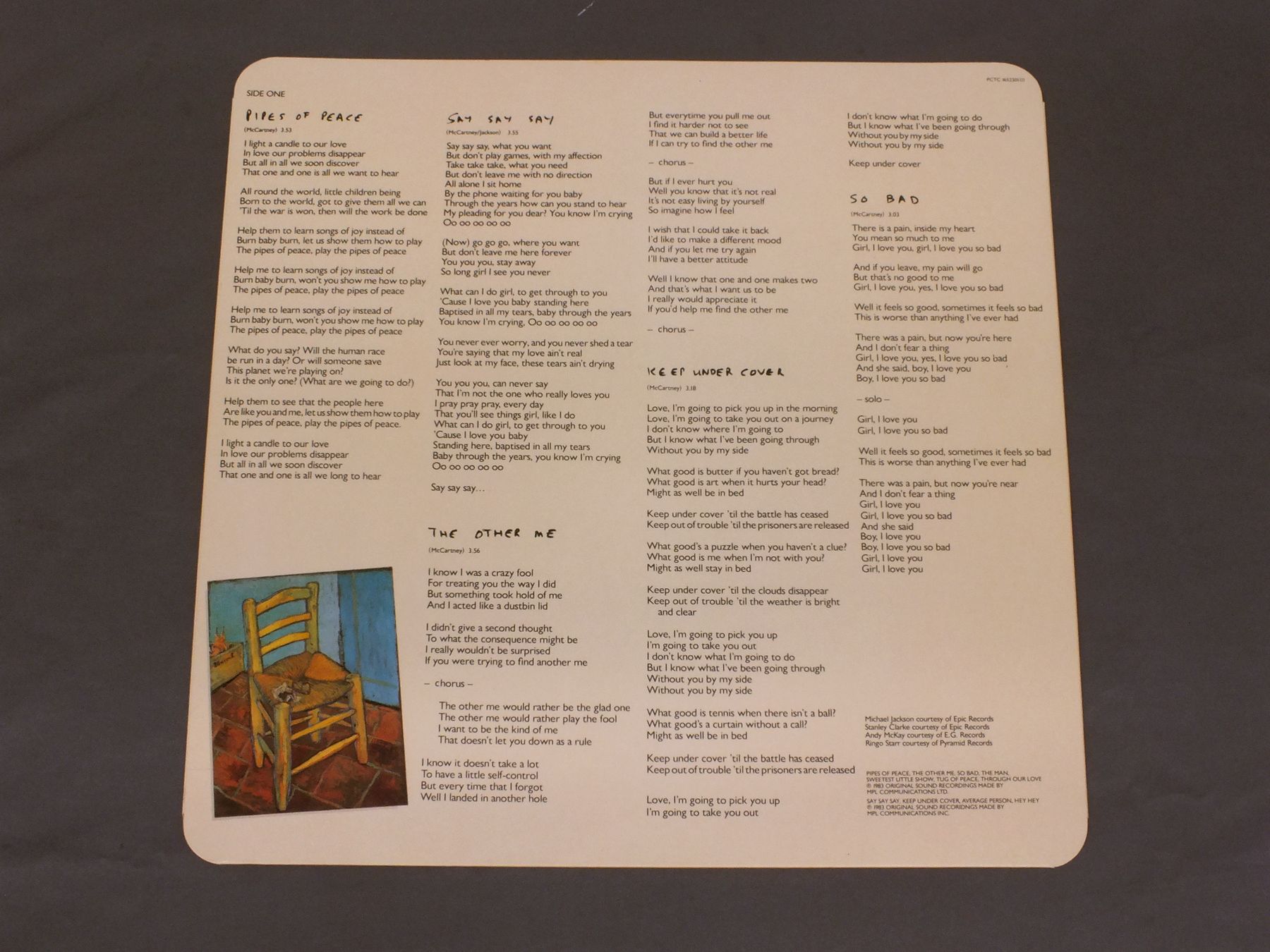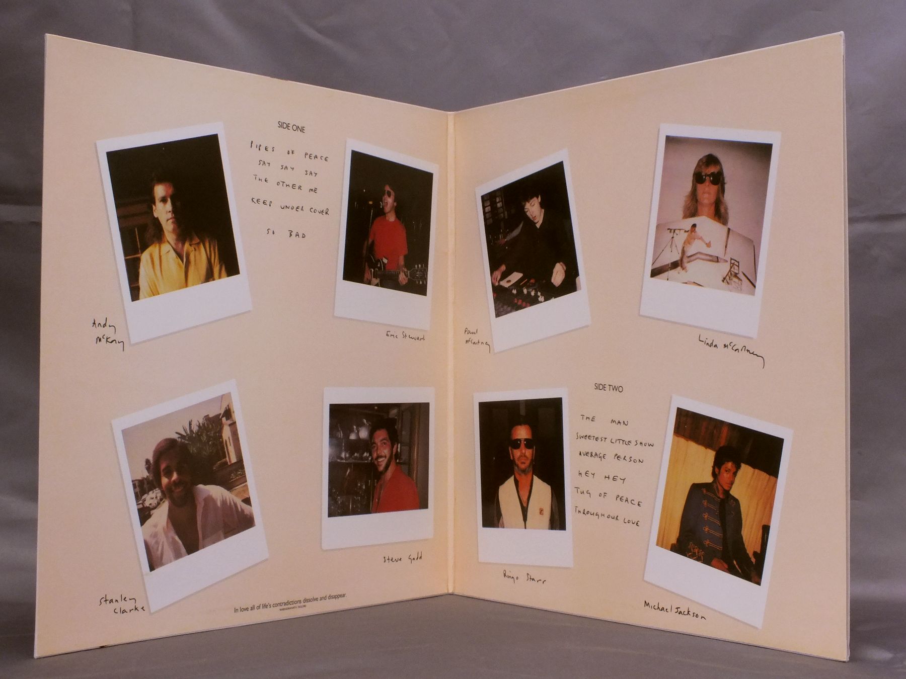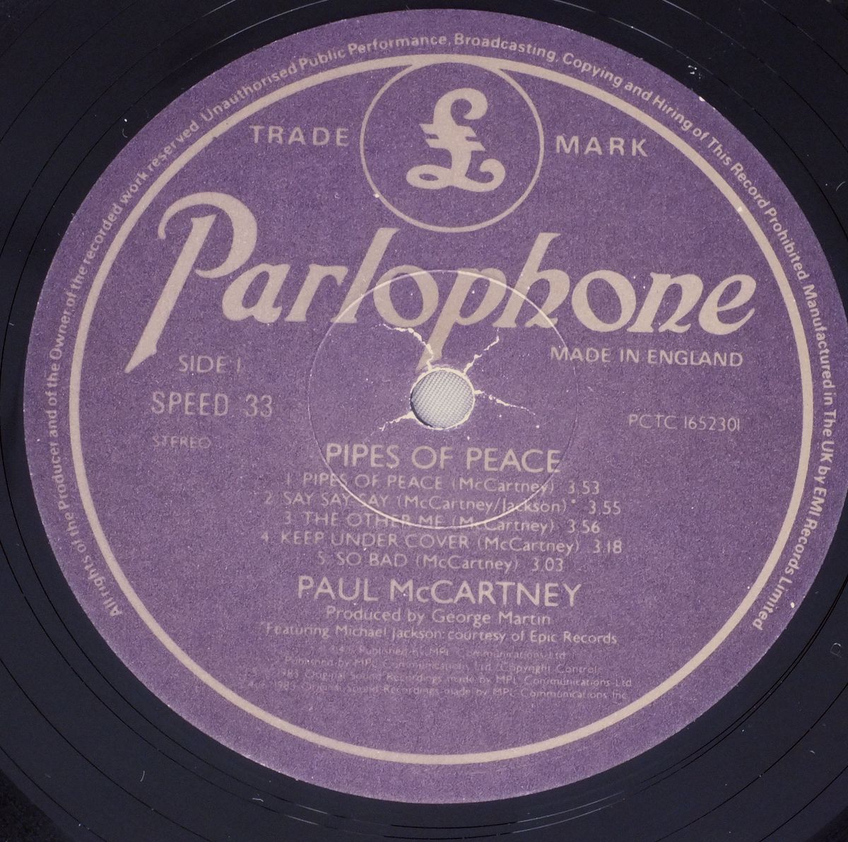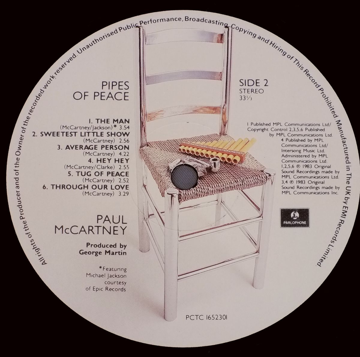 PAUL McCARTNEY/PIPES OF PEACE PCTC1652301 製造国:英国盤 / Media:LPMatrix:A-1U-1-1 B-1U-1-1外観:EX+盤の状態:EX 価格(税込):¥4,950(売約済) 送料 7inch:定形外郵便 360円~LP:定形外郵便 660円~送料は、注文の最終画面で確認頂けます。 > > PAUL McCARTNEY/PIPES OF PEACE 外観 (EX+)特記事項:見開きも含めてジャケ表面は全体的にスレやスリキズ、よごれ等の無いきれいな状態です。オリジナルインナーもよごれやヨレ、抜けの無いきれいな状態。外観EX+の共通説明:中古としては美品、一見してきれいでダメージが軽微。シミ、ヨゴレ、スレ有っても僅か~少し。 盤の状態 (EX)特記事項:薄いスリキズ・スレ少しある程度。音に出そうなものもなく一見してきれいな状態です。曲間など、静かなところを中心に聴いて見ましたが、チリノイズ少ないきれいな再生具合でした。盤EXの共通説明:盤面のスリキズが薄いものが少し~軽度 音に出そうなものは無いように見える(軽微なソフトティック音は除く)。 Tweet それぞれの画像をクリックすると、大きい写真が見られます こちらの商品もお勧めです 4,950円 JOHN & YOKO - PLASTIC ONO BANDF / SOME TIME IN NEW YORK CITY 5,500円 GEORGE HARRISON / LIVING IN THE MATERIAL WORLD 5,500円 GEORGE HARRISON / THIRTY THREE & 1/3 5,500円 JOHN LENNON / SHAVED FISH 5,500円 BEATLES / AT THE HOLLYWOOD BOWL