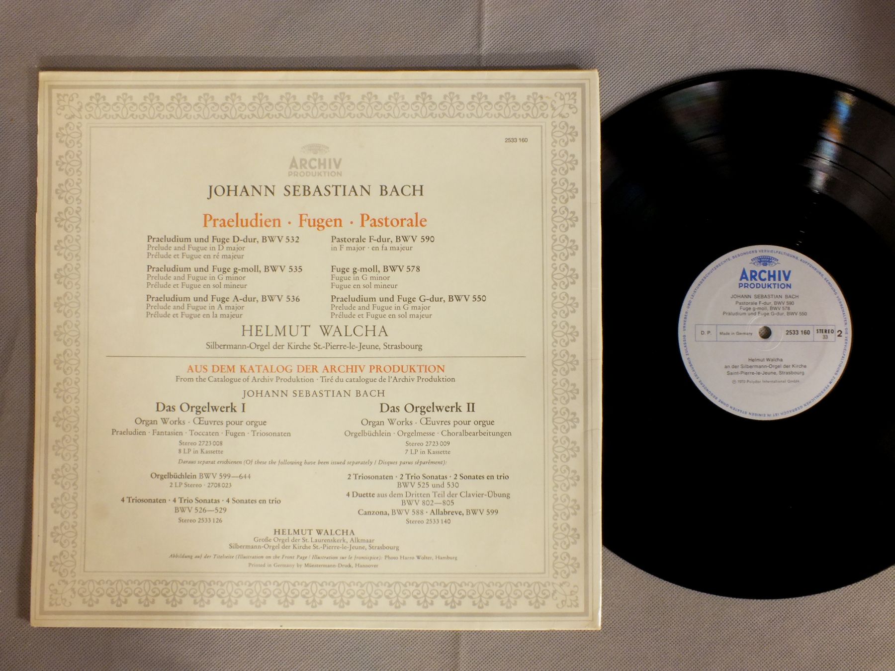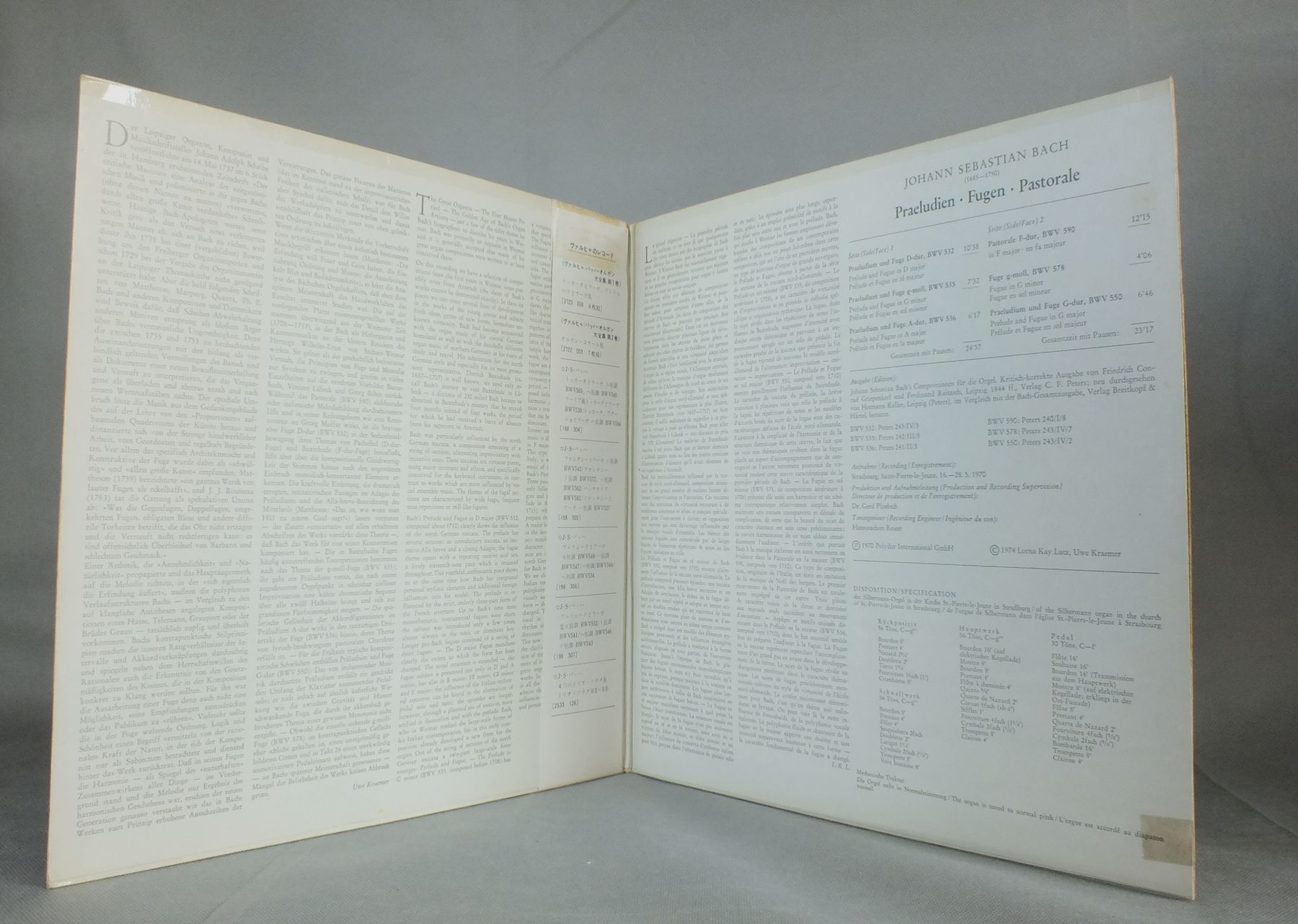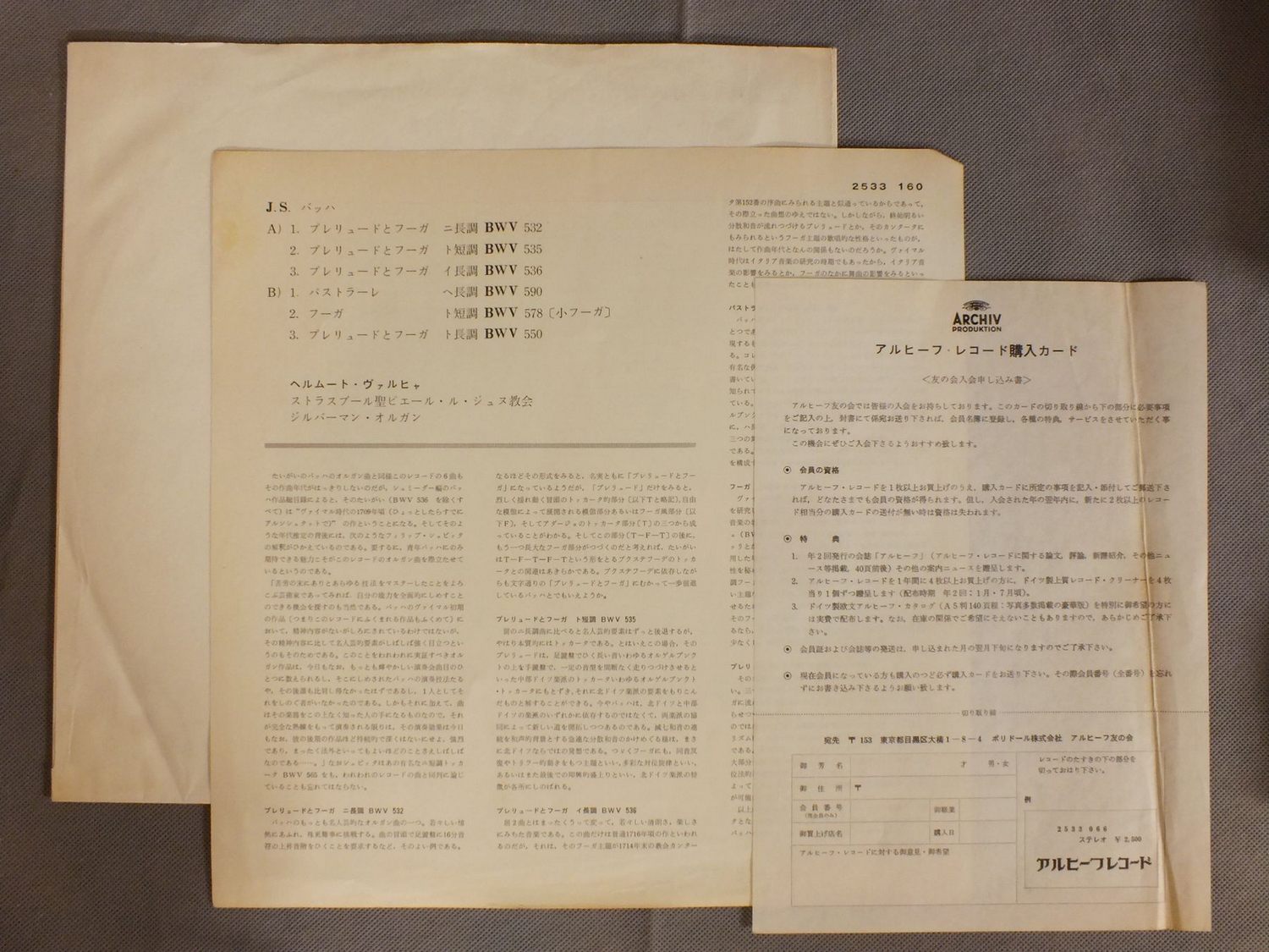WALCHAヴァルヒャ/BACH - PRAELUDIEN-FUGEN-PASTORALEバッハ - 小フーガ-パストラーレ 2533 160 製造国:独盤 / Media:LP外観:EX盤の状態:EX-帯:EX- 価格(税込):¥1,100(売約済) 送料 7inch:定形外郵便 360円~LP:定形外郵便 660円~送料は、注文の最終画面で確認頂けます。 > > WALCHA/BACH - PRAELUDIEN-FUGEN-PASTORALE 外観 (EX)特記事項:見開きにテープ跡。外観EXの共通説明:ダメージが限定的。中古品としては保存状態がよい方。シミ、ヨゴレ、スレ 少し~軽度。 盤の状態 (EX-)特記事項:薄いスリキズ・細かい表面スレ軽くある感じ。全体的には殆どが軽微なものの様子です。盤EX-の共通説明:盤面のスリキズが多少有り。音に出そうなものは殆ど無いように見える~さほど気にならないぐらいの軽いプチ数カ所程度。 帯の状態 (EX-):裏側にシミ。 Tweet それぞれの画像をクリックすると、大きい写真が見られます こちらの商品もお勧めです 990円 LEON FLEISHER / BRAHMS - VARIATION UND FUGE 1,650円 ASHKENAZY / MUSSORGSKY PICTURERS AT AN EXHIBITION 1,210円 FERNANDO VALENTI / SCARLATTI - SONATA FOR HARPSICHORD VOL.6 1,430円 SCHONZELER / BEETHOVEN-CREATURES OF PROMETHEUS 3,300円 SOLOMON / BEETHOVEN - LES QUATRE DERNIERES SONATES 990円 JULIAN BREAM etc / RODRIGO-VIVALDI-CONC. 990円 MIQUEL QUEROLミゲル・ケロル / HISPANIAE MUSICAイスパニアの音楽 1,210円 RALPH KIRKPATRICKカークパトリック / BACKS - FRANZOSISCHE SUITENバッハ - フランス物語