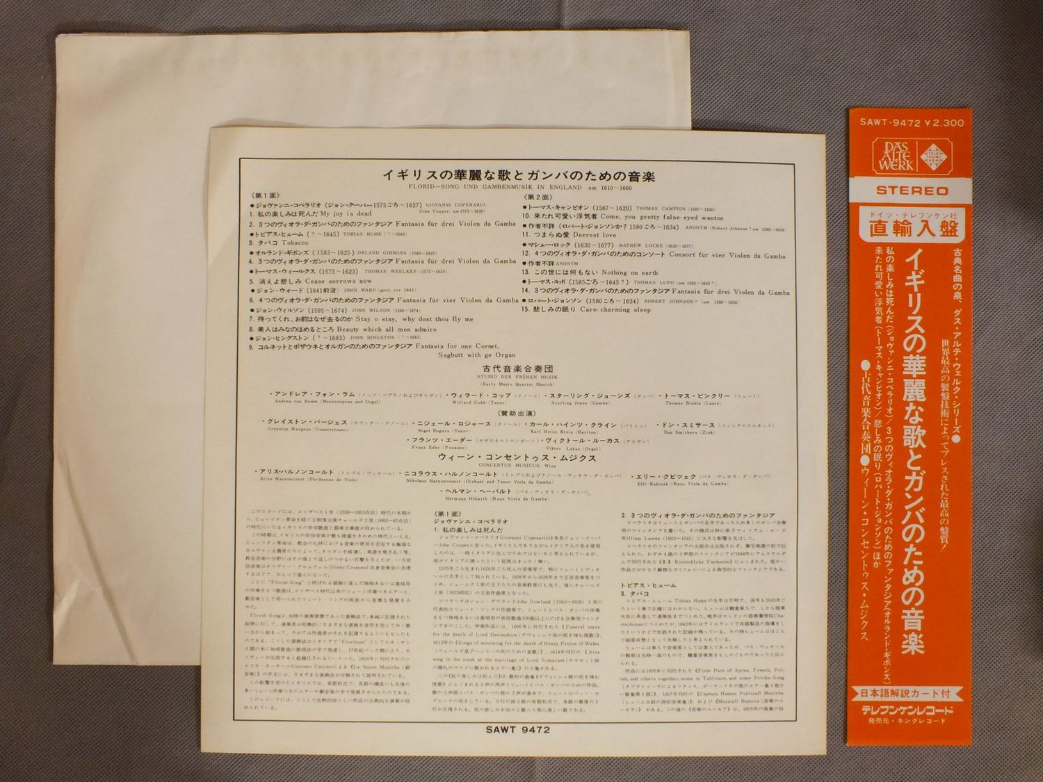 STUDIO DER FRUHEN MUSIK古代音楽合奏団 - ウィーン・コンセントゥス・ムジクス/MUSIK UND IHRE ZEIT FLORIDイギリスの華麗な歌とガンバのための音楽 SAWT9472A 製造国:独盤 / Media:LP外観:EX盤の状態:EX- 価格(税込):¥1,100(売約済) 送料 7inch:定形外郵便 360円~LP:定形外郵便 660円~送料は、注文の最終画面で確認頂けます。 > > STUDIO DER FRUHEN MUSIK/MUSIK UND IHRE ZEIT FLORID 外観 (EX)特記事項:表ジャケに折れ跡。外観EXの共通説明:ダメージが限定的。中古品としては保存状態がよい方。シミ、ヨゴレ、スレ 少し~軽度。 盤の状態 (EX-)特記事項:薄いスリキズ・細かい表面スレ軽くある感じです。プチ出そうな所は少し。軽微なものが中心の様子です。盤EX-の共通説明:盤面のスリキズが多少有り。音に出そうなものは殆ど無いように見える~さほど気にならないぐらいの軽いプチ数カ所程度。 Tweet それぞれの画像をクリックすると、大きい写真が見られます こちらの商品もお勧めです 1,540円 YEVGENY MRAVINSKY - LENINGRAD PHIL / TSCHAIKOVSKY - SYM. NO6 990円 MARIO DUSCHENES - KELSEY JONES / HANDEL - SONATA FOR FLUTE & HARPSICHORD 990円 R SERKIN A BUSCH H BUSCH / SCHUBERT TRIO 990円 ANGELO EPHRIKIAN / VIVALDI - FOUR CONC.S FOR TWO ORCH.S 1,430円 HEUTLING QUARTET & GRAF / MOZART - COMPLETE STRING QUINTETS 990円 BRUGGEN / VIVALDI-SIX CONC. FUR FLUTE 990円 NASH ENSEMBLE / SIR LENNOX BERKELEY AN 80TH BIRTHDAY TRIBUTE 1,320円 RALPH KIRKPATRICK / SCARLATTI - SONATA