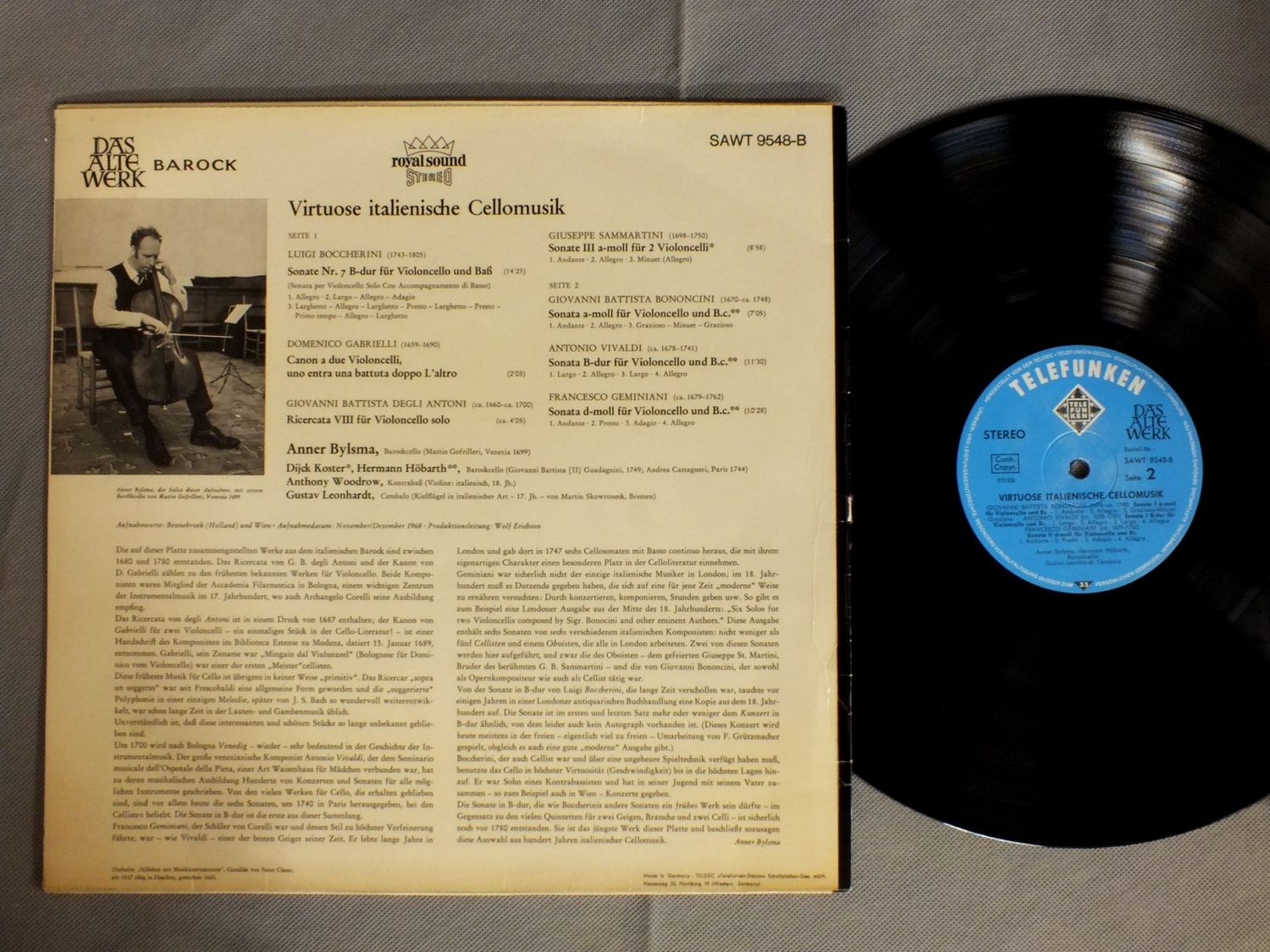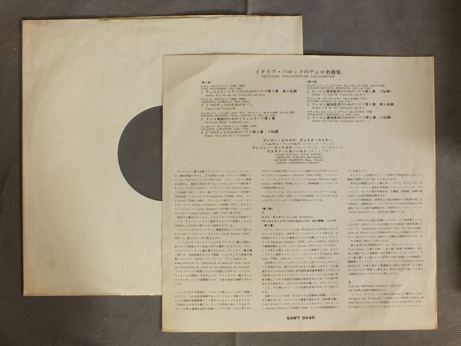 ANNER BYLSMAアンナー・ビルスマ ディイク・コスター ヘルマン・ヘーバルト 他/VIRTUOSE ITALIENISCHE CELLOMUSIKイタリア・バロックのチェロ名曲集 SAWT9548B 製造国:独盤 / Media:LP外観:EX-盤の状態:EX+ 価格(税込):¥2,750(売約済) 送料 7inch:定形外郵便 360円~LP:定形外郵便 660円~送料は、注文の最終画面で確認頂けます。 > > ANNER BYLSMA/VIRTUOSE ITALIENISCHE CELLOMUSIK 外観 (EX-)特記事項:ヨレ有り。外観EX-の共通説明:ダメージ軽度~多少。 中古品としては普通の状態。シミ、ヨゴレ、スレなど軽く~多少。 盤の状態 (EX+)特記事項:薄いスリキズ・スレ少し。一見してきれいな状態です。盤EX+の共通説明:盤面の極薄いスリキズ、スレ少し程度 音に出そうなものは無いように見える(極軽微なソフトティック音は除く)。 Tweet それぞれの画像をクリックすると、大きい写真が見られます こちらの商品もお勧めです 990円 TAMES SYKES / CLARA SHUMANN - 2ROMANCES 990円 TARR-KENT / BAROQUE MASTERPIECES FOR TRUMPET & ORGAN 1,210円 FRANCISCO ARAIZA - IRWIN GAGE / SCHUBERT - DIE SCHONE MULLERIN 1,320円 WIENER KONZERTHAUSQUARTETT / HAYDN - STREICHOUATETT NO23 990円 MARRINER / VIVALDI BLASERKONZERTE VOL2 990円 CONSORTIUM CLASSICUM / SCHUBERT - OKTETT 990円 LANDOWSKA / BACH GOLDBERG VARIATIONS 1,540円 HARNONCOURT - CONCENTUS MUSICUS WIENハルノンクール - ウィーン合奏団 / MUFFAT & BIBER - HOFISCHE KONZERTMUSIKオーストリア・バロックの宮廷音楽
