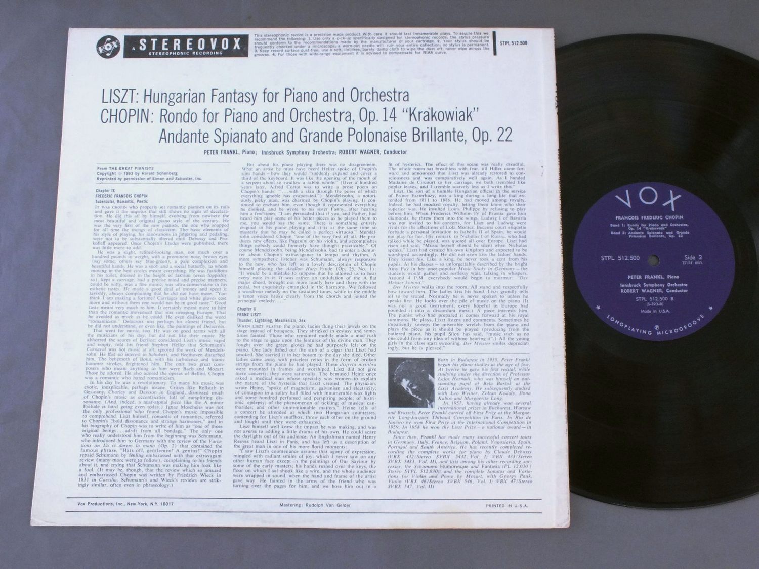 PETER FRANKL - ROBERT WAGNER/LISZT - HUNGARIAN FANTASY STPL512.500 製造国:米国盤 / Media:LP外観:EX盤の状態:EX 価格(税込):¥1,100(売約済) 送料 7inch:定形外郵便 360円~LP:定形外郵便 660円~送料は、注文の最終画面で確認頂けます。 > > PETER FRANKL - ROBERT WAGNER/LISZT - HUNGARIAN FANTASY 外観 (EX)特記事項:裏ジャケに薄いシミ。外観EXの共通説明:ダメージが限定的。中古品としては保存状態がよい方。シミ、ヨゴレ、スレ 少し~軽度。 盤の状態 (EX)特記事項:薄いスリキズ・スレ軽くある感じ。殆どが軽微なものの様子です。盤EXの共通説明:盤面のスリキズが薄いものが少し~軽度 音に出そうなものは無いように見える(軽微なソフトティック音は除く)。 Tweet それぞれの画像をクリックすると、大きい写真が見られます こちらの商品もお勧めです 1,210円 ANDRES SEGOVIA / MY FAVORITE SPANISH ENCORES 1,980円 FISCHER / MORZART - SONATES NO10 & 11 1,870円 YVES NAT / BRAHMS VARIATIONS ET FUGUE 1,760円 BEROFF-COLLARD / DEBUSSY-PIECES POUR PIANO A QUATRE MAINS 1,980円 DAISY DE LUCA / BEETHOVEN-SONATES POUR PIANO 990円 SCHNABEL / BEETHOVEN-VOL2 SONATAS NOS11-17 2,200円 CORTOT / FRANCK OEUVRES POUR PIANO 990円 GIESEKING / DEBUSSY-FIFTEEN PIANO PIECES