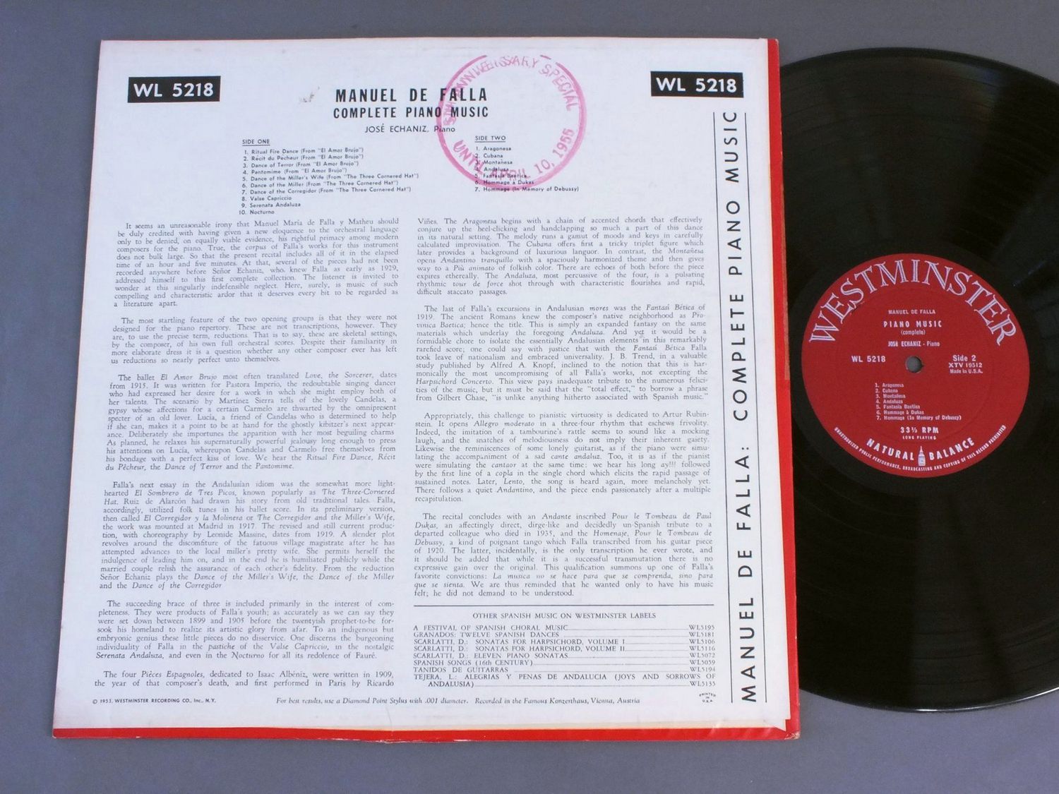 JOSE ECHANIZ/FALLA COMPLETE PIANO MUSIC WL5218 製造国:米国盤 / Media:LP外観:VG+盤の状態:EX- 価格(税込):¥2,200(売約済) 送料 7inch:定形外郵便 360円~LP:定形外郵便 660円~送料は、注文の最終画面で確認頂けます。 レコード検索 > > JOSE ECHANIZ/FALLA COMPLETE PIANO MUSIC 外観 (VG+)特記事項:背にテープ。外観VG+の共通説明:ダメージやや有り。シミ、ヨゴレ、スレなど多少~やや多め。 盤の状態 (EX-)特記事項:薄いスリキズ・細かい表面スレ軽くある感じです。プチ出そうな所は少し。軽微なものが中心の様子です。盤EX-の共通説明:盤面のスリキズが多少有り。音に出そうなものは殆ど無いように見える~さほど気にならないぐらいの軽いプチ数カ所程度。 Tweet それぞれの画像をクリックすると、大きい写真が見られます こちらの商品もお勧めです 990円 TAMAS VASARY / CHOPIN - PIANO SONATAS NOS2 & 3 3,520円 JOSE ECHANIZ / GRANADOS TWELVE SPANISH DANCES 990円 ENRIQUE JORDA / SEGOVIA - SYM. OF THE AIR 990円 PIERRE COCHEREAUATST.MARY` SCATHEDRAL / FRESCOBALDI PIPE ORGAN PIECES 1,540円 GONZALO SORIANO / GRANADOS - DOUZE DANSES ESPAGNOLES 990円 LEON FLEISHER / BRAHMS - VARIATION UND FUGE 1,870円 YVES NAT / BRAHMS VARIATIONS ET FUGUE 990円 GRAINNE YEATSグラーニア・イェイツ / BELFAST HARP FESTIVAL 1792