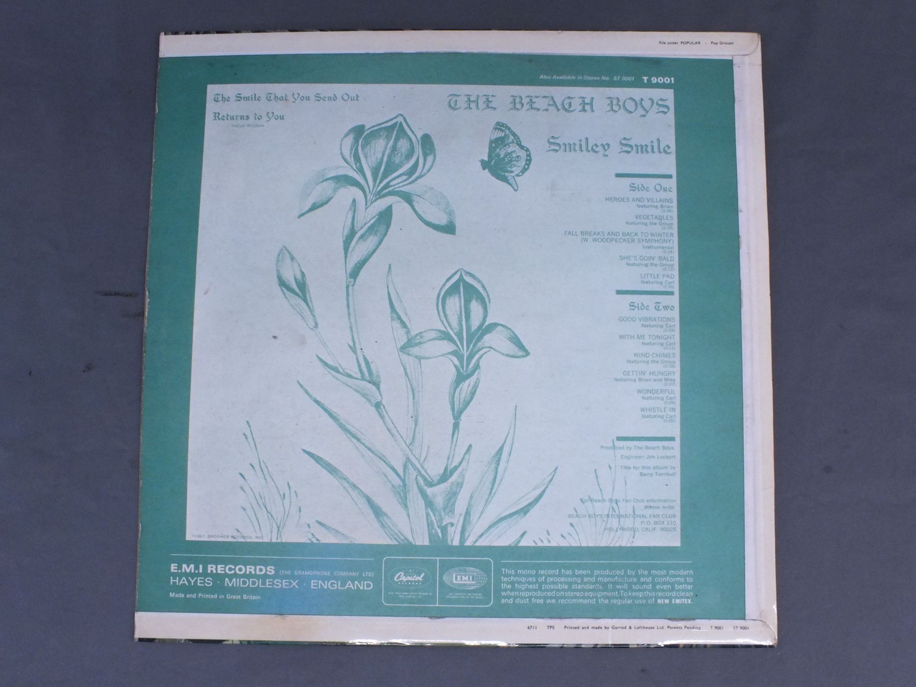 BEACH BOYS/SMILEY SMILE MONO T9001 製造国:英国盤 / Media:LPMatrix: -1 -1外観:EX盤の状態:VG+ 価格(税込):¥11,000(売約済) 送料 7inch:定形外郵便 360円~LP:定形外郵便 660円~送料は、注文の最終画面で確認頂けます。 > > BEACH BOYS/SMILEY SMILE MONO 外観 (EX)特記事項:表ジャケは厚手のコーティング仕様。コーティングのヨレシワも少なく、スレやスリキズ、よごれ等も少ない印象。裏ジャケもよごれ少なく良い状態です。外観EXの共通説明:ダメージが限定的。中古品としては保存状態がよい方。シミ、ヨゴレ、スレ 少し~軽度。 盤の状態 (VG+)特記事項:薄いスリキズ・スレ軽く有る感じ。殆どが軽微なものの様子で、きれいな印象。曲間など、静かなところを中心にMONO針で聴いて見ましたが、チリプチ少な目で音もクリアーでした。盤VG+の共通説明:盤面にスリキズが多少~やや有り、音に出そうなものも多少ある。 Tweet それぞれの画像をクリックすると、大きい写真が見られます こちらの商品もお勧めです