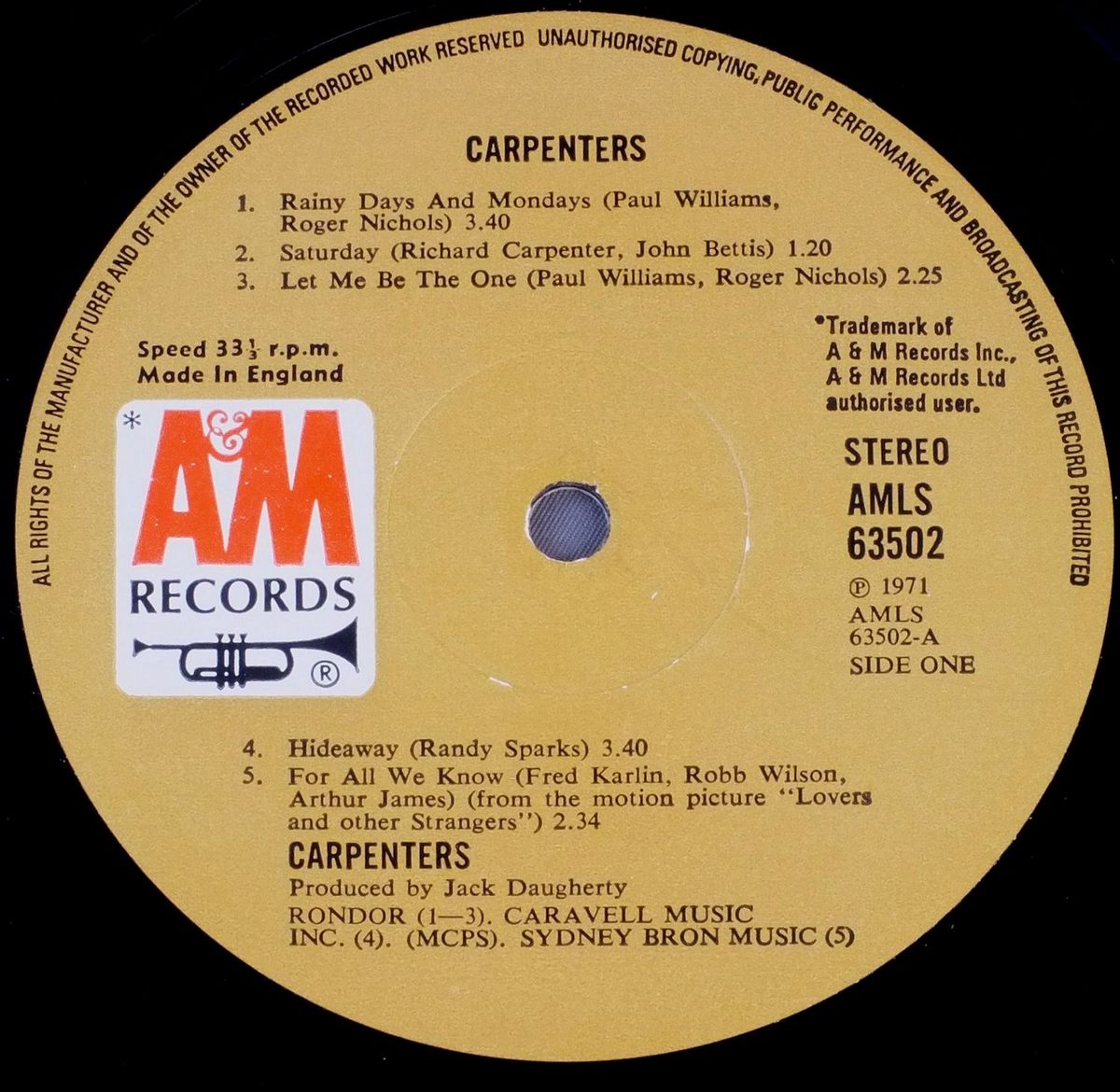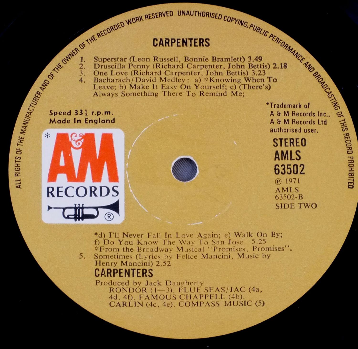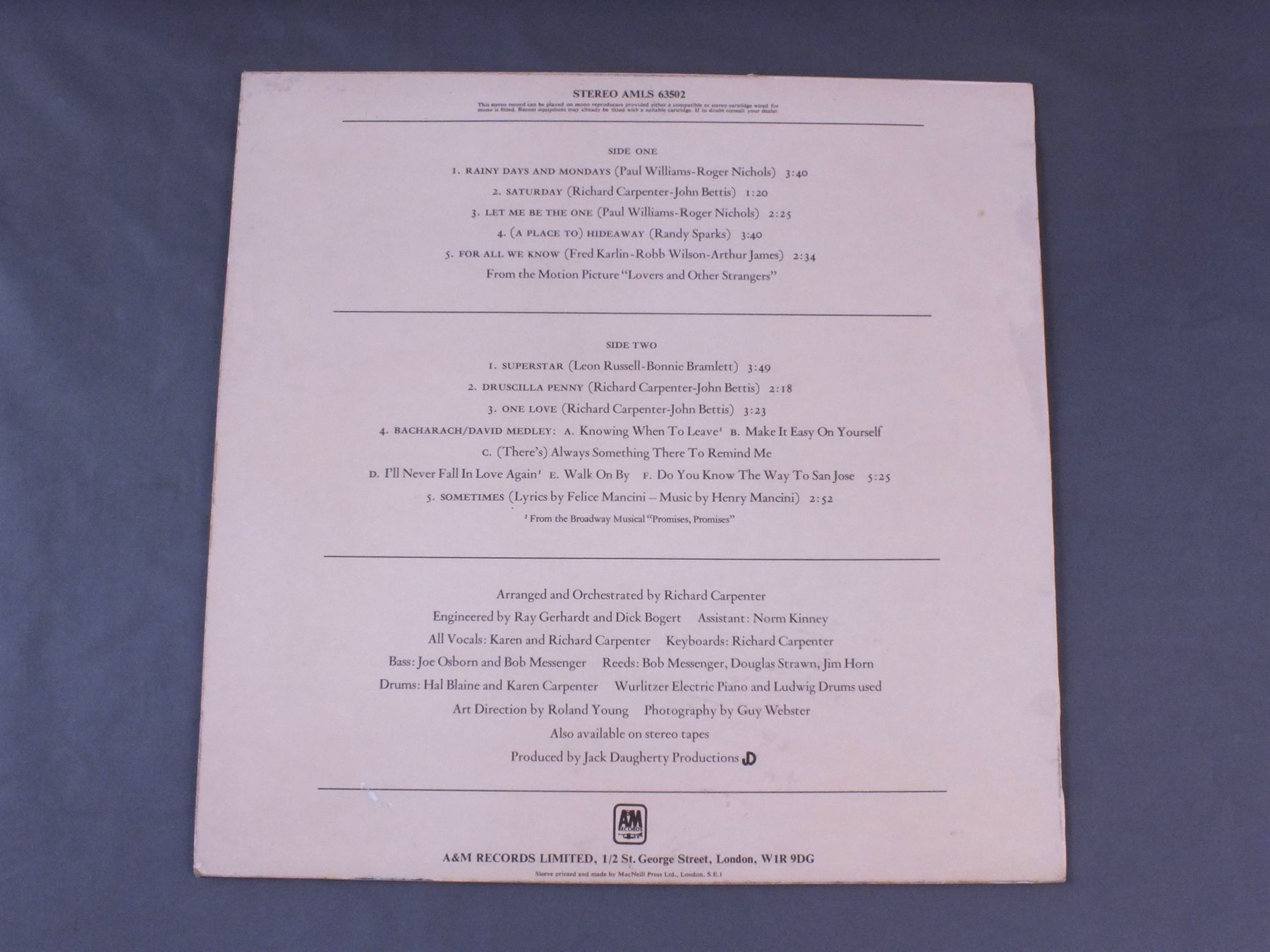 CARPENTERS/CARPENTERS AMLS63502 製造国:英国盤 / Media:LPMatrix:A-6G B-5G外観:EX-盤の状態:EX 価格(税込):¥3,850(売約済) 送料 7inch:定形外郵便 360円~LP:定形外郵便 660円~送料は、注文の最終画面で確認頂けます。 > > CARPENTERS/CARPENTERS 外観 (EX-)特記事項:両面共厚手のコーティング仕様。両面共コーティングのヨレシワは少ないですが、背に沿ってコーティングの浮き有り。裏ジャケ左下に剥がれが少々有り。背上付近に薄いシミが一箇所。外観EX-の共通説明:ダメージ軽度~多少。 中古品としては普通の状態。シミ、ヨゴレ、スレなど軽く~多少。 盤の状態 (EX)特記事項:薄いスリキズ・スレ少しある程度。音に出そうなものもなく一見してきれいな状態です。曲間など、静かなところを中心に聴いて見ましたが、チリノイズ少ないきれいな再生具合でした。盤EXの共通説明:盤面のスリキズが薄いものが少し~軽度 音に出そうなものは無いように見える(軽微なソフトティック音は除く)。 その他:3作目にしてセルフ・タイトル。(UKでは2nd ALBUM)名盤です。 Tweet それぞれの画像をクリックすると、大きい写真が見られます こちらの商品もお勧めです 4,950円 JONI MITCHELL / DOG EAT DOG 4,400円 JONI MITCHELL / DOG EAT DOG 3,850円 NICO / THE END 5,060円 JONI MITCHELL / CHALK MARK IN A RAIN STORM 7,700円 SUSAN MAUGHAN / I WANNA BE BOBBY`S GIRL 4,950円 SANDY DENNY / RENDEZVOUS