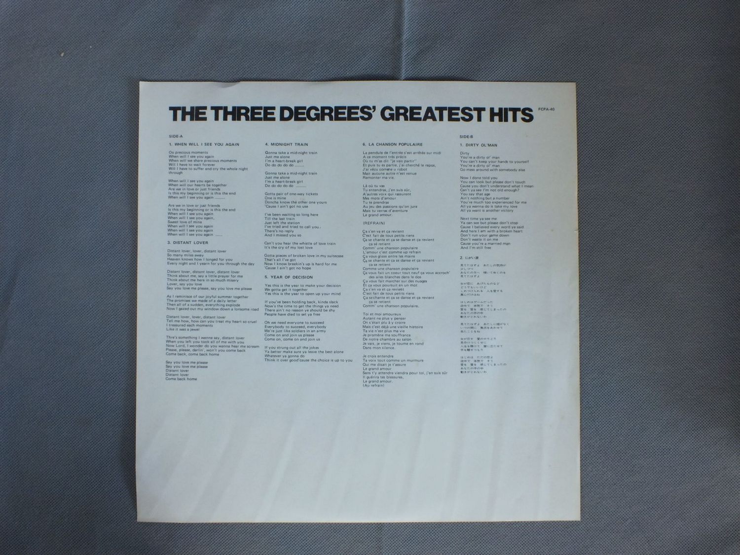 THREE DEGREESスリー・ディグリーズ/THREE DEGREES` GREATEST HITSスリー・ディグリーズ・グレーテスト・ヒット FCPA40 製造国:日本盤 / Media:LP外観:EX-盤の状態:EX 価格(税込):¥550(売約済) 送料 7inch:定形外郵便 360円~LP:定形外郵便 660円~送料は、注文の最終画面で確認頂けます。 > > THREE DEGREES/THREE DEGREES` GREATEST HITS 外観 (EX-)特記事項:背スレやヘリスレ有り。外観EX-の共通説明:ダメージ軽度~多少。 中古品としては普通の状態。シミ、ヨゴレ、スレなど軽く~多少。 盤の状態 (EX)特記事項:薄いスリキズ・スレ軽くある感じ。殆どが軽微なものの様子です。盤EXの共通説明:盤面のスリキズが薄いものが少し~軽度 音に出そうなものは無いように見える(軽微なソフトティック音は除く)。 Tweet それぞれの画像をクリックすると、大きい写真が見られます こちらの商品もお勧めです 1,210円 JERMAINE JACKSONジャーメイン・ジャクソン / LET`S GET SERIOUSレッツ・ゲット・シーリアス 1,320円 DIANA ROSS & THE SUPREMESダイアナ・ロスとシュープリームス / THE BEST OF DIANA ROSS & THE SUPREMESダイアナ・ロスとシュープリームスの全て 880円 SMOKEY ROBINSONスモーキー・ロビンソン / TOUCH THE SKYタッチ・ザ・スカイ 1,210円 VAN McCOYバン・マッコイ / MY FEVORITE FANTASYマイ・フェバリット・ファンタジー 990円 GRAHAM CENTRAL STATIONグラハム・セントラル・ステイション / MIRRORミラー 1,320円 DIANA ROSSダイアナ・ロス / ROSSロス 770円 PHILIP BAILEYフィリップ・ベイリー / CONTINUATIONアナザ・フェイス 660円 TEMPTATIONSテンプテーションズ / POWERパワー