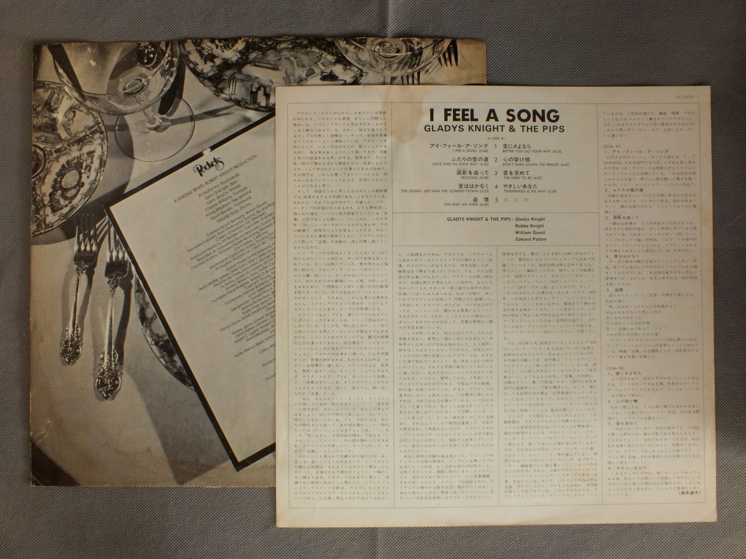 GLADYS KNIGHT & THE PIPSグラディス・ナイト&ザ・ピップス/I FEEL A SONGアイ・フィール・ア・ソング YX7001DA 製造国:日本盤 / Media:LP外観:EX盤の状態:EX 価格(税込):¥880 送料 7inch:定形外郵便 360円~LP:定形外郵便 660円~送料は、注文の最終画面で確認頂けます。 > > GLADYS KNIGHT & THE PIPS/I FEEL A SONG 外観 (EX)特記事項:ジャケ表面やカード、インナーにシミ。外観EXの共通説明:ダメージが限定的。中古品としては保存状態がよい方。シミ、ヨゴレ、スレ 少し~軽度。 盤の状態 (EX)特記事項:薄いスリキズ・スレ軽くある感じ。殆どが軽微なものの様子です。盤EXの共通説明:盤面のスリキズが薄いものが少し~軽度 音に出そうなものは無いように見える(軽微なソフトティック音は除く)。 Tweet それぞれの画像をクリックすると、大きい写真が見られます こちらの商品もお勧めです 1,320円 DIANA ROSS & THE SUPREMESダイアナ・ロスとシュープリームス / THE BEST OF DIANA ROSS & THE SUPREMESダイアナ・ロスとシュープリームスの全て 1,320円 STAX - VOLT LABL SOUL / LIVE IN PARISソウル・エクスプロージョン ライヴ・イン・パリ 1,210円 ASHFORD & SIMPSONアシュフォード&シンプソン / SOLIDソリッド 1,210円 TEMPTATIONSテンプテーションズ / BACK TO BASICSバック・トゥー・ベイシックス 660円 HOMI & JARVIS - BOBBY KINGホミ&ジャービス - ボビー・キング / PROMO ONLYプロモーション用特別ハイライト盤 1,210円 FOUR TOPSフォー・トップス / BACK WHERE I BELONGバック・ホェア・アイ・ビロング 770円 TUXEDO JUNCTIONタキシード・ジャンクション / TAKE THE A TRAINA列車で行こう 1,210円 TEMPTATIONSテンプテーションズ / TOUCH MEタッチ・ミー