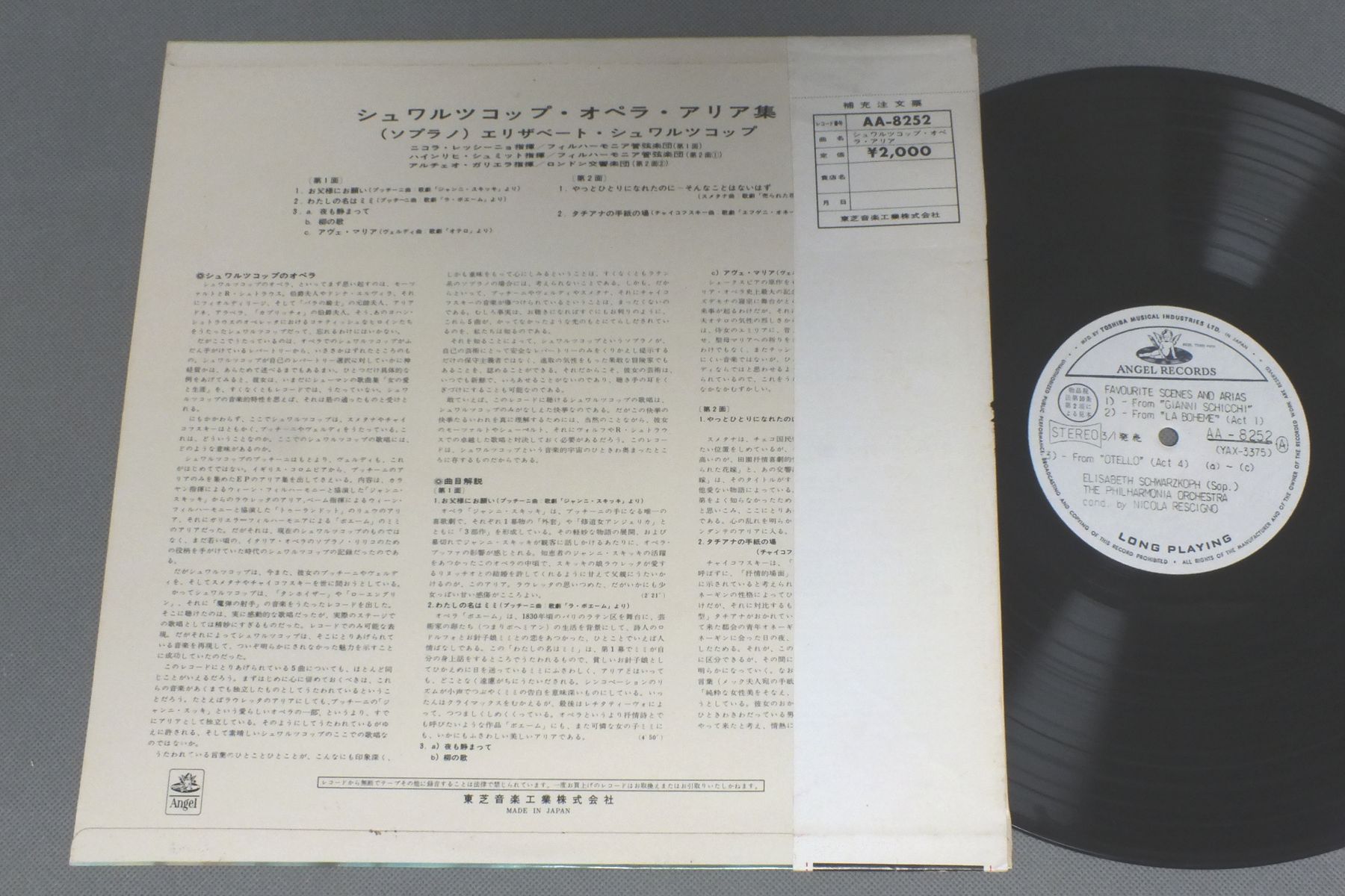 SCHWARZKOPFエリザベート・シュワルツコップ/FAVOURITE SCENES & ARIASシュワルツコップ・オペラ・アリア集 AA-8252 製造国:日本盤 / Media:LP外観:EX盤の状態:EX+ 価格(税込):¥1,430(売約済) 送料 7inch:定形外郵便 360円~LP:定形外郵便 660円~送料は、注文の最終画面で確認頂けます。 > > SCHWARZKOPF/FAVOURITE SCENES & ARIAS 外観 (EX)特記事項:特記なし。外観EXの共通説明:ダメージが限定的。中古品としては保存状態がよい方。シミ、ヨゴレ、スレ 少し~軽度。 盤の状態 (EX+)特記事項:薄いスリキズ・スレ少し。一見してきれいな状態です。盤EX+の共通説明:盤面の極薄いスリキズ、スレ少し程度 音に出そうなものは無いように見える(極軽微なソフトティック音は除く)。 その他:ペラジャケ 白見本盤 Tweet それぞれの画像をクリックすると、大きい写真が見られます こちらの商品もお勧めです 990円 FRANZ NAVELフランツ・ナヴァル / SCHUBERT - DIE SCHONE MULLERINシューベルト歌曲集 水車小屋の娘 全曲 990円 KIYOSHI IGARASHI五十嵐喜芳 / JAPANESE SONG VOL1五十嵐喜芳のすべて VOL1 日本のうた-この道 990円 WERNERヴェルナー / BACH GROBEN KANTATEN BWV70 BWV180バッハ 教会カンタータ選集`13` 990円 BERNSTEIN-DIETRICH FISCHER DIESKAUバーンスタイン-ディースカウ / MAHLER SONGS PROMO ONLYマーラー-歌曲集 プロモ用 2,420円 CALLAS - SERAFIN - PHILHARMONIA ORCH.カラス - セラフィン - フィルハーモニア管弦楽団 / DONIZETTI - LUCIA DI LAMMERMOOR 2LP BOXドニゼッティ - ランメルムーアのルチア 2枚組 990円 MIROSLAV VENHODA - PRAGER MADRIGALISTENヴェンフォーダ - プラハ・マドリガル合唱団 / DESPREZ - MISSA PANGE LINGUAジョスカン・デプレ - ミサ・パンジェ・リングア 990円 CALLASカラス / VERDI OPERATIC ARIASヴェルディ・アリア集 990円 GERALDINE FARRARジェラルディン・ファーラー / GERALDINE FARRAR SINGSファーラー名唱集