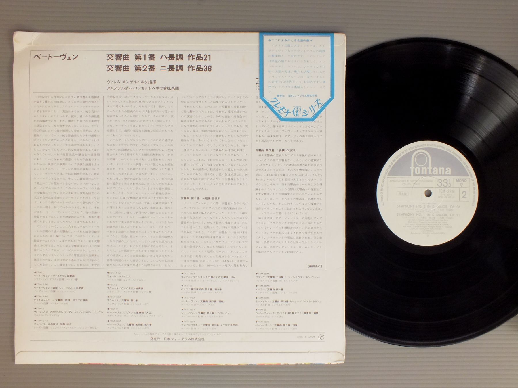 MENGELBERGメンゲルベルク/BEETHOVEN SYM. NO1 & NO2ベートーヴェン 交響曲 第1番 & 第2番 FCM28 製造国:日本盤 / Media:LP外観:EX盤の状態:EX 価格(税込):¥660(売約済) 送料 7inch:定形外郵便 360円~LP:定形外郵便 660円~送料は、注文の最終画面で確認頂けます。 > > MENGELBERG/BEETHOVEN SYM. NO1 & NO2 外観 (EX)特記事項:ジャケ表面にシミやよごれ有り。外観EXの共通説明:ダメージが限定的。中古品としては保存状態がよい方。シミ、ヨゴレ、スレ 少し~軽度。 盤の状態 (EX)特記事項:薄いスリキズ・スレ軽くある感じ。軽微なものの様子です。盤EXの共通説明:盤面のスリキズが薄いものが少し~軽度 音に出そうなものは無いように見える(軽微なソフトティック音は除く)。 その他:白見本盤 Tweet それぞれの画像をクリックすると、大きい写真が見られます こちらの商品もお勧めです 990円 ANSERMETアンセルメ / MENDELSSOHN-MIDSUMMER NIGHTS DREAMシューベルト・ロザムンデ メンデルスゾーン・真夏の夜の夢 990円 BEECHAMビーチャム / BIZET `CARMEN`-HIGHLIGHTSビゼー `カルメン`ハイライト 990円 ENRIQUE BATIZ-ROBERT COHENエンリケ・バティス-ロバート・コーエン-アグスティン・レオン・アラ / RODRIGO-CONCIERTO EN MODO GALANTEロドリーゴ-ギャラント協奏曲-夏の協奏曲 990円 MUNCHミュンシュ / BIZET-CARMEN-SUITE-L`ARLESIENNE-SUITEビゼー-カルメン組曲-アルルの女 組曲 3,850円 FURTWANGLERフルトヴェングラー / FURTWANGLER-BEETHOVEN-FIDELIO(COMPLETE)フルトヴェングラーの芸術 第8巻ベートーヴェン-フィデリオ全曲 1,320円 KEMPE - MUNCHNER PHILHARMONIKERミュンヘン・フィル / BRUCKNER - SYM. NO5ブルックナー 交響曲第5番(原典版) 990円 MUNCHミュンシュ / DUKAS SORCERER`S APPRENTICEダンディ フランスの山人の歌による交響曲-デュカス-交響詩`魔法使いの弟子` 他 990円 MAGA - PHILHAMONIA HUNGARICAマーガ - フィルハーモニア フンガリカ / RUBINSTEIN - PIANO CONCERTO No.4ルービンシュタイン ピアノ協奏曲 第4番