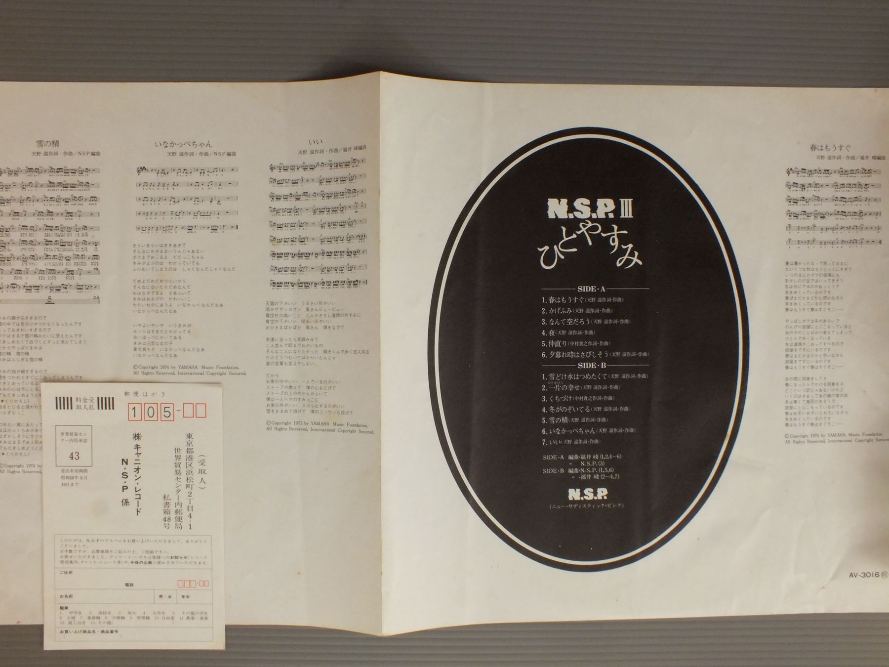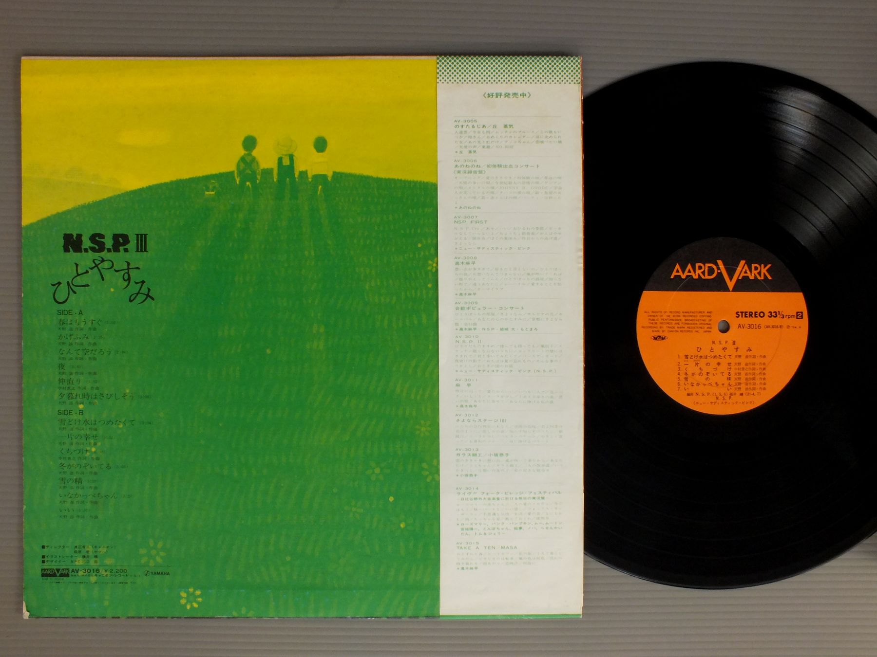 N.S.P.ニュー・サディスティック・ピンク/N.S.P. 3N.S.P. ? ひとやすみ AV3016 製造国:日本盤 / Media:LP外観:EX-盤の状態:EX帯:EX- 価格(税込):¥880 送料 7inch:定形外郵便 360円~LP:定形外郵便 660円~送料は、注文の最終画面で確認頂けます。 > > N.S.P./N.S.P. 3 外観 (EX-)特記事項:ジャケ表面にシミやよごれ有り。外観EX-の共通説明:ダメージ軽度~多少。 中古品としては普通の状態。シミ、ヨゴレ、スレなど軽く~多少。 盤の状態 (EX)特記事項:薄いスリキズ・スレ軽くある感じ。軽微なものの様子です。盤EXの共通説明:盤面のスリキズが薄いものが少し~軽度 音に出そうなものは無いように見える(軽微なソフトティック音は除く)。 帯の状態 (EX-):表側に切れ有り。 Tweet それぞれの画像をクリックすると、大きい写真が見られます こちらの商品もお勧めです 1,320円 MIMI HIYOSHI日吉ミミ / NORTHBOUND北帰行 - 日吉ミミの詩情 1,210円 TAKASHI NISHIOKA西岡たかし / KAZE HAKUSHI風博士 2,640円 UTANOICHI唄の市 / YAON + BOOKLET野音唄の市 + 楽譜集 770円 KATSUYUKI MIYAZAWA宮沢勝之 / LIVE IN KIYOSE 81 AUTOGRAPHED陽気に生きようこの人生をさ LIVE IN 清瀬 サイン付 990円 RANBO MINAMIみなみ らんぼう / KATARITUKUSENAI MAY語り尽くせない五月 1,320円 KIYOSHI HASEGAWA長谷川きよし / TOUMEINA HITOTOKIWO透明なひとときを 1,980円 FURIDO古井戸 / POESYぽえじー(3rd ALBUM) 880円 FURUIDO古井戸 / SKETCH OF ORANGE COLORオレンジ色のすけっち