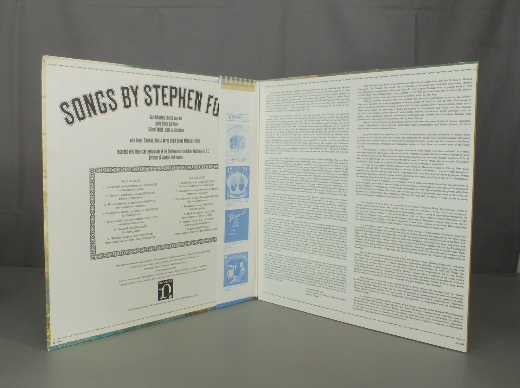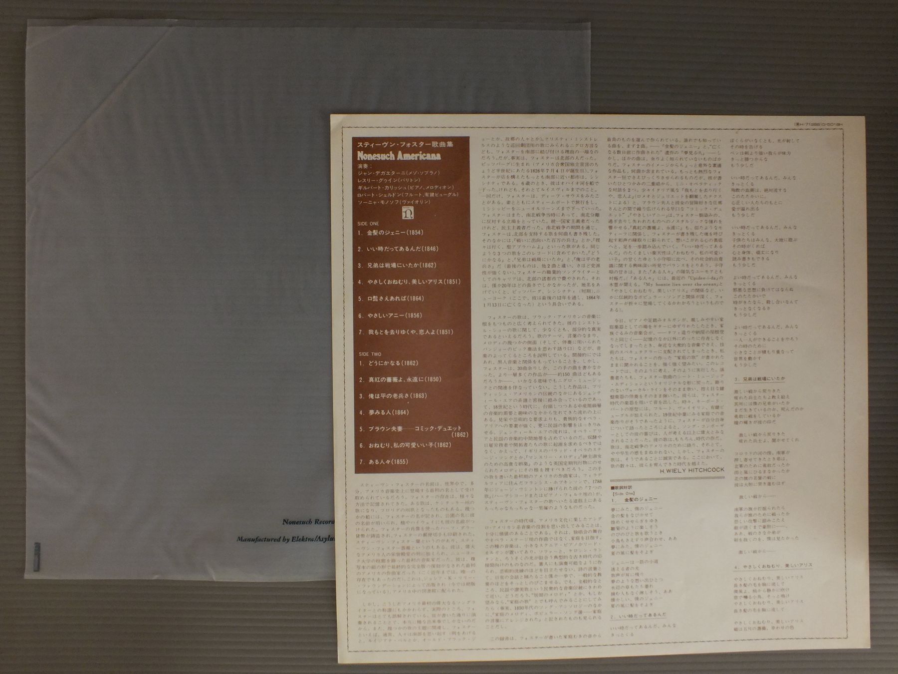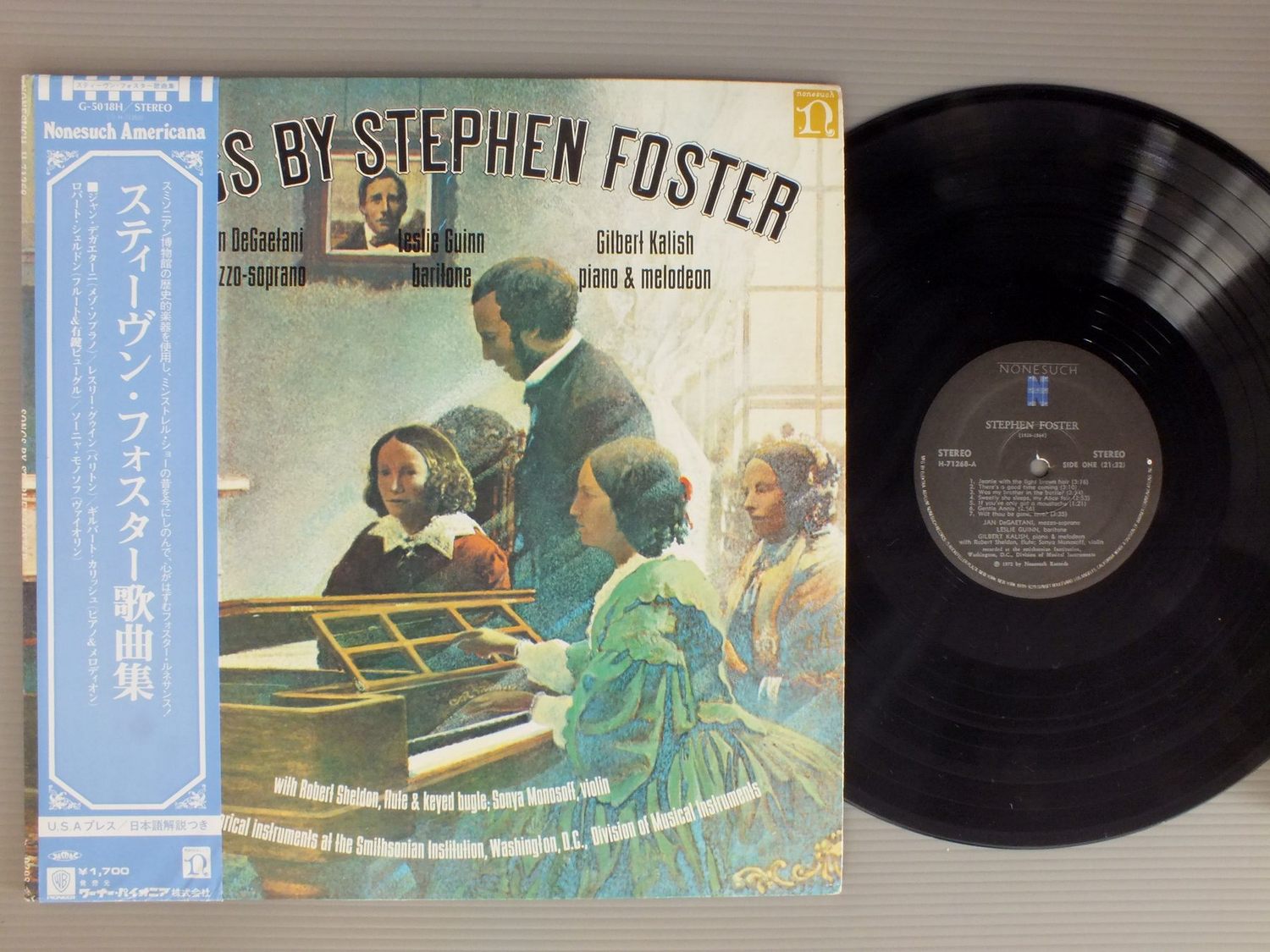 JAN DEGAETANI LESLIE GUINN GILBERT KALISH etcジャン・デガエターニ レスリー・グゥイン ギルバート・カリッシュ 他/SONGS BY STEPHEN FOSTERスティーヴン・フォスター歌曲集 H71268 製造国:米国盤 / Media:LP外観:EX盤の状態:EX-帯:EX 価格(税込):¥660(売約済) 送料 7inch:定形外郵便 360円~LP:定形外郵便 660円~送料は、注文の最終画面で確認頂けます。 > > JAN DEGAETANI LESLIE GUINN GILBERT KALISH etc/SONGS BY STEPHEN FOSTER 外観 (EX)特記事項:特記なし。外観EXの共通説明:ダメージが限定的。中古品としては保存状態がよい方。シミ、ヨゴレ、スレ 少し~軽度。 盤の状態 (EX-)特記事項:薄いスリキズ・細かい表面スレ軽くある感じ。全体的には殆どが軽微なものの様子です。盤EX-の共通説明:盤面のスリキズが多少有り。音に出そうなものは殆ど無いように見える~さほど気にならないぐらいの軽いプチ数カ所程度。 帯の状態 (EX):底スレ有り Tweet それぞれの画像をクリックすると、大きい写真が見られます こちらの商品もお勧めです 1,430円 DIESKAU-DEMUS / BEETHOVEN-LIEDER 1,210円 CALLAS / LA TRAVIATA 1,320円 HEINZ ROGNER / SYLVIA GESZTY-LIER DER NACHTIGALL 1,320円 PAILLARDパイヤール / BACH-ORCH.L SUITES 990円 LEIDER MELCHIOR / OPERATIC SCENES AND ARIAS 1,320円 JOAN SUTHERLAND / BELLINI-LA SONNAMBULA-HIGHLIGHTS 990円 DOUGLAS FLINT DILLARDダグラス・ディラード / YOU DON`T NEED A REASON TO SING 990円 RENATA TEBALDI / GREAT SOPRANO ARIAS