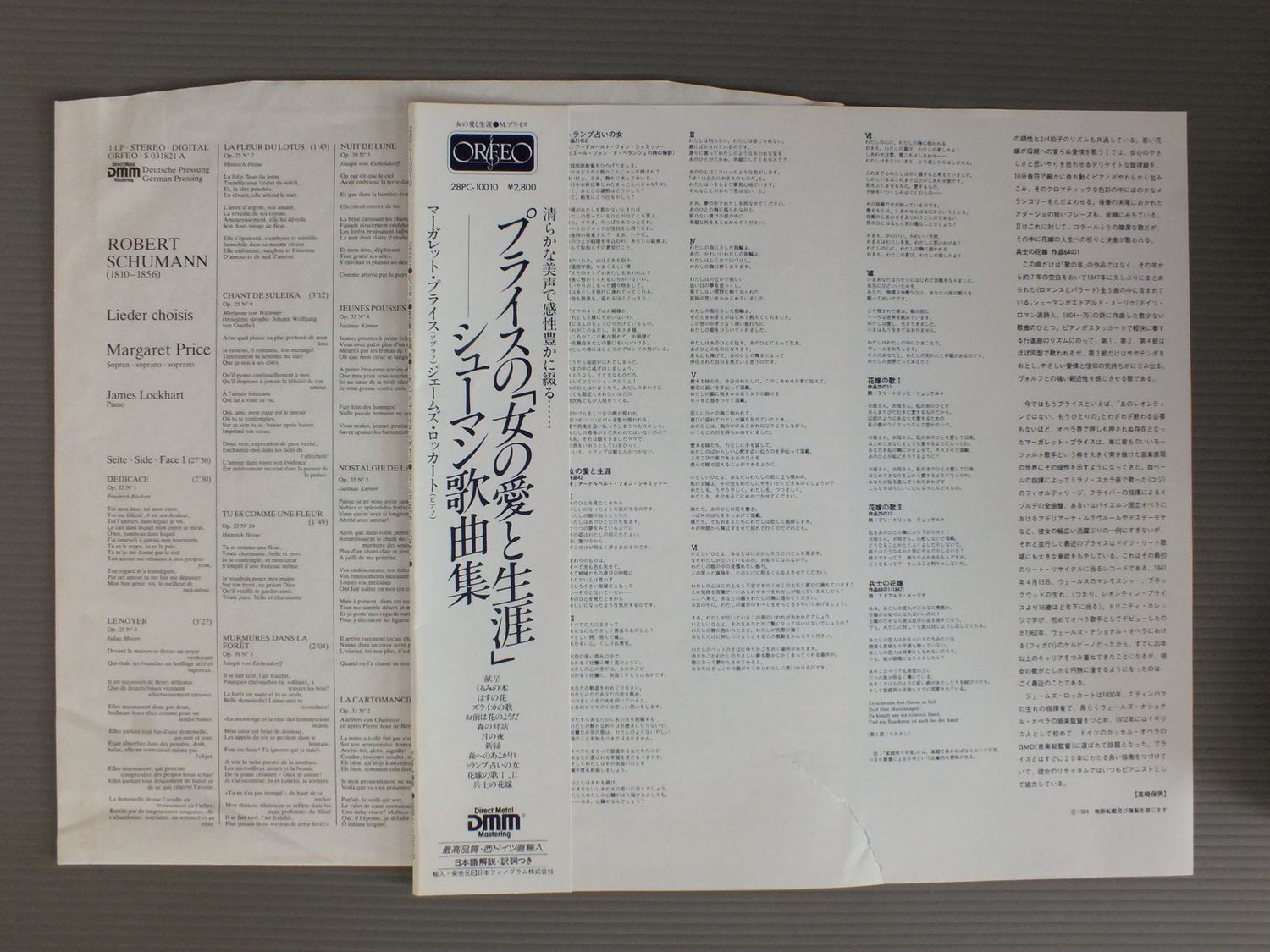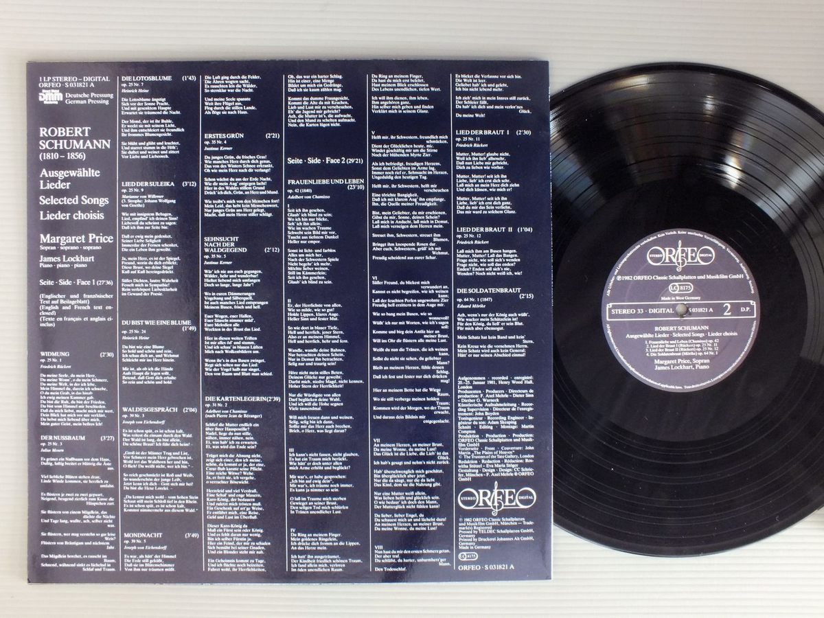 MARGARET PRICEマーガレット・プライス-ジェームズ・ロッカート/SCHUMANN-LIEDER SONGSプライスの女と愛の生涯-シューマン歌曲集 S031821A 製造国:独盤 / Media:LP外観:EX+盤の状態:EX 価格(税込):¥1,980(売約済) 送料 7inch:定形外郵便 360円~LP:定形外郵便 660円~送料は、注文の最終画面で確認頂けます。 > > MARGARET PRICE/SCHUMANN-LIEDER SONGS 外観 (EX+)特記事項:特記なし。外観EX+の共通説明:中古としては美品、一見してきれいでダメージが軽微。シミ、ヨゴレ、スレ有っても僅か~少し。 盤の状態 (EX)特記事項:薄いスリキズ・スレ軽くある感じ。軽微なものの様子です。盤EXの共通説明:盤面のスリキズが薄いものが少し~軽度 音に出そうなものは無いように見える(軽微なソフトティック音は除く)。 Tweet それぞれの画像をクリックすると、大きい写真が見られます こちらの商品もお勧めです 990円 HEINRICH REHKEMPER / HEINRICH REHKEMPER 2 1,320円 FLAGSTAD-OIVIN FJELDSTAD / FLAGSTAD-SIBELIUS SONGS 2,640円 TAMARA BROOKSタマーラ・ブルック 新音楽学校管弦楽団 / MENDELSSOHN:WALPURGISNACHTカンタータ 最初のワルプルギスの夜 990円 BORIS CHRISTOFF-VITTORIO GUI / OPERATIC ARIAS 2,420円 SCHIPPERS / ROSSINI-LE SIEGE DE CORINTHE 1,650円 SCHWARZKOPF / WEBER ABU HASSAN 1,650円 ISOBEL BAILLIE / GOLDEN VOICE SERIES 1 1,430円 SCHREIER / BACH BWV215