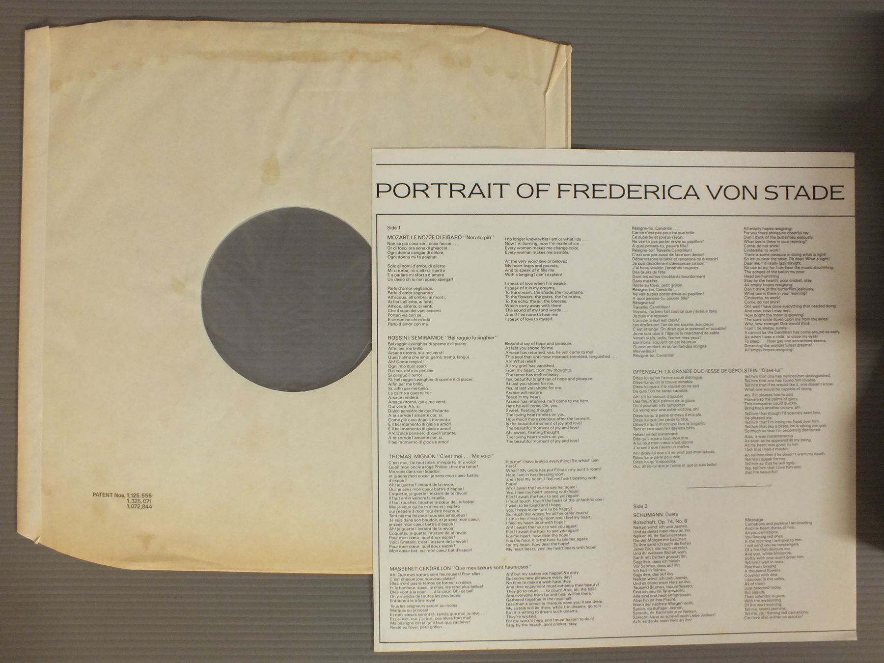 F.V.STADEフォン・シュターデ/PORTRAIT OF FREDERICA VON STADE 39315 製造国:英国盤 / Media:LP外観:EX盤の状態:EX+ 価格(税込):¥1,650(売約済) 送料 7inch:定形外郵便 360円~LP:定形外郵便 660円~送料は、注文の最終画面で確認頂けます。 > > F.V.STADE/PORTRAIT OF FREDERICA VON STADE 外観 (EX)特記事項:背スレやヘリスレ有り。外観EXの共通説明:ダメージが限定的。中古品としては保存状態がよい方。シミ、ヨゴレ、スレ 少し~軽度。 盤の状態 (EX+)特記事項:薄いスリキズ・スレ少し。一見してきれいな状態です。盤EX+の共通説明:盤面の極薄いスリキズ、スレ少し程度 音に出そうなものは無いように見える(極軽微なソフトティック音は除く)。 Tweet それぞれの画像をクリックすると、大きい写真が見られます こちらの商品もお勧めです 990円 ZARA DOLUKHANOVA / ZARA DOLUKHANOVA 1,980円 DIESKAU-GERALD MOORE / SCHUBERT-LIEDER DIESKAU-GERALD MOORE 990円 LOTTE LEHMANNロッテ・レーマン / LOTTE LEHMANNロッテ・レーマン 2,090円 KLEMPERER - PHILHARMONIA / MOZART - DON GIOVANNI 4LP SETMOZART - DON GIOVANNI 4枚組 990円 VARIOUS KOREAN SINGER韓国歌手 / KIM YONG JUN WORKS金連俊歌曲集 990円 LOUIS MARTINI / GILLES-TE DEUM 1,760円 ELISABESTH SCHUMANN-ALWIN / ELISABESTH SCHUMANN 3,080円 CLAUDIA MUZIO / ON EDISON DIAMOND DISCS VOL2