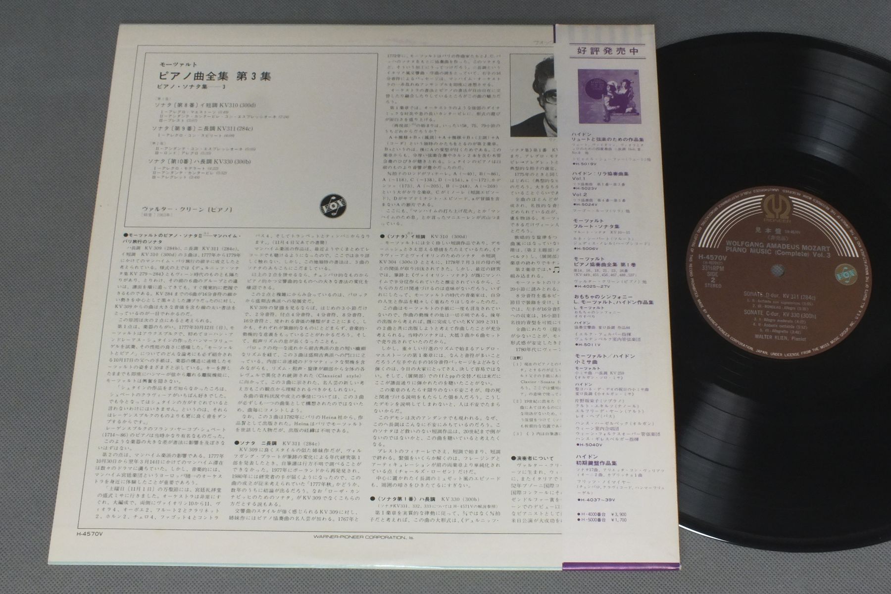 WALTER KLIENヴァルター・クリーン/MOZART PIANO VOL3 SONATAS3モーツァルト ピアノ曲全集 第3集 ピアノ・ソナタ集-3 H-4570V 製造国:日本盤 / Media:LP外観:EX盤の状態:EX+帯:EX 価格(税込):¥1,100(売約済) 送料 7inch:定形外郵便 360円~LP:定形外郵便 660円~送料は、注文の最終画面で確認頂けます。 > > WALTER KLIEN/MOZART PIANO VOL3 SONATAS3 外観 (EX)特記事項:特記なし。外観EXの共通説明:ダメージが限定的。中古品としては保存状態がよい方。シミ、ヨゴレ、スレ 少し~軽度。 盤の状態 (EX+)特記事項:薄いスリキズ・スレ少し。一見してきれいな状態です。盤EX+の共通説明:盤面の極薄いスリキズ、スレ少し程度 音に出そうなものは無いように見える(極軽微なソフトティック音は除く)。 帯の状態 (EX):特記なし。 その他:見本盤 Tweet それぞれの画像をクリックすると、大きい写真が見られます こちらの商品もお勧めです 990円 HIKARU & RIRIKO HAYASHI林リリ子&林光 / FLUTE BEST SELECTION白鳥 フルート名曲30選 1,320円 CASADESUSカザドシュ / DEBUSSY - PRELUDES 2E LIVREドビュッシー - 前奏曲集 第2巻 1,320円 ITZHAK PERLMANイツァーク・パールマン / KREISLERクライスラー - ヴァイオリン名曲集 990円 FRANCE CLIDATフランス・クリダ / FRANZ LISZT INTEGRALE DE LOEUVRE POUR PIANO 15リスト-ピアノ曲大全集15 巡札の年第3年 イタリア 990円 GOULDグールド / COMPLETE MOZART PIANO SONATAS VOL5モーツアルト - ピアノ・ソナタ第14番16番17番 990円 BRENDELアルフレッド・ブレンデル / SCHUBERT - SONATAシューベルト - ピアノ・ソナタ 1,320円 SAMSON FRANCOISサンソン・フランソワ / RAVEL PIANO WORKSラヴェル珠玉集 第2集 990円 ASHKENAZYアシュケナージ / BEETHOVCEN - PIANO SONATAS NO11&12ベートーヴェン - ピアノ・ソナタ第11番12番