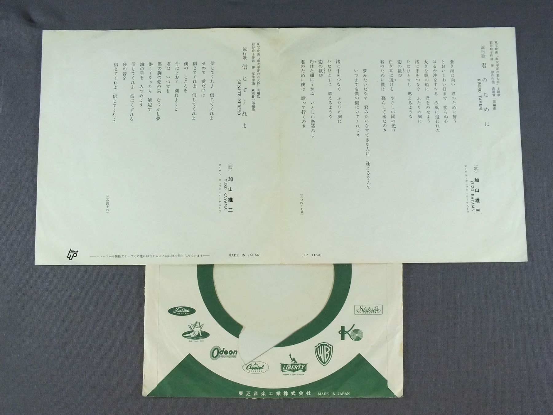 YUZO KAYAMA加山雄三/KIMINO TAMENI君のために TP1480 製造国:日本盤 / Media:7inch外観:VG+盤の状態:VG+ 価格(税込):¥330 送料 7inch:定形外郵便 360円~LP:定形外郵便 660円~送料は、注文の最終画面で確認頂けます。 > > YUZO KAYAMA/KIMINO TAMENI 外観 (VG+)特記事項:ヨレ有り。君のために側に剥がれ小。外観VG+の共通説明:ダメージやや有り。シミ、ヨゴレ、スレなど多少~やや多め。 盤の状態 (VG+)特記事項:薄いスリキズ・細かいスレやや多め。周期的にプチ出そうな小キズ、線キズも両面数カ所有り。全体的には軽微なものが中心です。少し聴いてみましたが、音自体はしっかりクリアーに鳴っているようでした。盤VG+の共通説明:盤面にスリキズが多少~やや有り、音に出そうなものも多少ある。 Tweet それぞれの画像をクリックすると、大きい写真が見られます こちらの商品もお勧めです 770円 YUZO KAYAMA加山雄三 / GOLDEN ALBUMゴールデン・アルバム(あなたと共に)赤盤 1,650円 MUNETAKA INOUE & HIS SHARP FIVE井上宗孝とシャープ・ファイヴ / SHARP FIVE SCREEN GO GOシャープ・ファイヴ・スクリーン・ゴーゴー 1,210円 TIGERSタイガース / TIGERS 1982十年ロマンス 3,850円 OXオックス / FIRST ALBUMファースト・アルバム 770円 TIGERSタイガース / HUMAN RENASCENCEヒューマン・ルネッサンス 660円 YUZO KAYAMA加山雄三 / AISURUTOKIHA IMA愛する時は今 1,320円 TAKESHI TERAUCHI & BLUEJEANS寺内タケシとブルー・ジーンズ / ELECTRIC GUITAR SONGS WITHOUT SONG歌のないエレキ歌謡曲 550円 TIGERSタイガース / 10 YEARS ROMANCE十年ロマンス