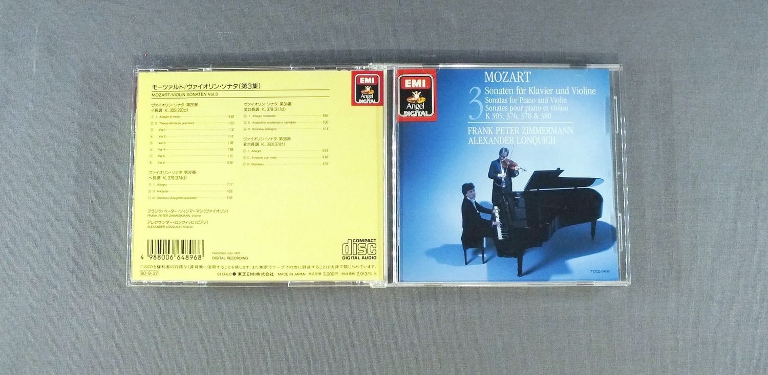 ZIMMERMANN-A.LONCUICHツィンマーマン-A.ロンクィッヒ/MOZART-VIOLIN SONATEN VOL3モーツァルト-ヴァイオリン・ソナタ 第3集 TOCE6405 製造国:日本盤 / Media:CD外観:EX+盤の状態:EX- 価格(税込):¥2,310 送料 7inch:定形外郵便 360円~LP:定形外郵便 660円~送料は、注文の最終画面で確認頂けます。 > > ZIMMERMANN-A.LONCUICH/MOZART-VIOLIN SONATEN VOL3 外観 (EX+)特記事項:特記事項無。コンディションリストを参照。外観EX+の共通説明:中古としては美品、一見してきれいでダメージが軽微。シミ、ヨゴレ、スレ有っても僅か~少し。 盤の状態 (EX-)特記事項:薄いスリキズ・細かい表面スレ軽くある感じ。全体的には殆どが軽微なものの様子です。盤EX-の共通説明:盤面のスリキズが多少有り。音に出そうなものは殆ど無いように見える~さほど気にならないぐらいの軽いプチ数カ所程度。 Tweet それぞれの画像をクリックすると、大きい写真が見られます こちらの商品もお勧めです 990円 WEISSSENBERG - GIULINI - WIENER SYMPHONYワイセンベルク - ジュリーニ - ウィーン交響楽団 / MOZART - PIANO CINCERTO NO.9モーツァルト - ピアノ協奏曲第9番 990円 DURUFLE - PRETRE - LA SOCIETE DES CONCERTS DU CONSERVATOIREデュリュフレ - プレートル - パリ音楽院管弦楽団 / SAINT SAENS - SYMPHONY NO.3サン・サーンス - 交響曲第3番 2,860円 JOCHUM - CHOR UND ORCHESTER DES BAYERISCHEN RUNDFUNKSヨッフム - バイエルン放送交響楽団 / HAYDN - MISSA SANCTAE CAECILIAEハイドン - チェチリアのミサ 990円 BRENDEL - MARRTNER - ACADEMY OF ST.MARTIN IN THE FIELDSブレンデル - マリナー - アカデミー室内管弦楽団 / MOZRT - PIANO CONCERTOS NO19 NO23モーツァルト - ピアノ協奏曲第19番23番 990円 KARAJAN - VIENNA PHILHARMONIC ORCHESTRAカラヤン - ウィーン・フィルハーモニー管弦楽団 / HOLST - THE PLANETSホルスト - 組曲惑星 990円 WIENNA PHILHARMONIC WIND GROUPウィーン・フィルハーモニー管弦楽団グループ / MOZART - DIVERTOMENTO モーツァルト - 喜遊曲 1,540円 WALTER - COLUMBIA SYMPHONY ORCHESTRAワルター - コロンビア交響楽団 / MAHLER - SYMPHONY NO1マーラー交響曲第1番 1,540円 ENTREMONT - ORMANDY - PHILADELPHIA ORCHESTRAアントルモン - オーマンディ - フィラデルフィア交響楽団 / LISZT - CONCERTO NO1リスト - ピアノ協奏曲第1番