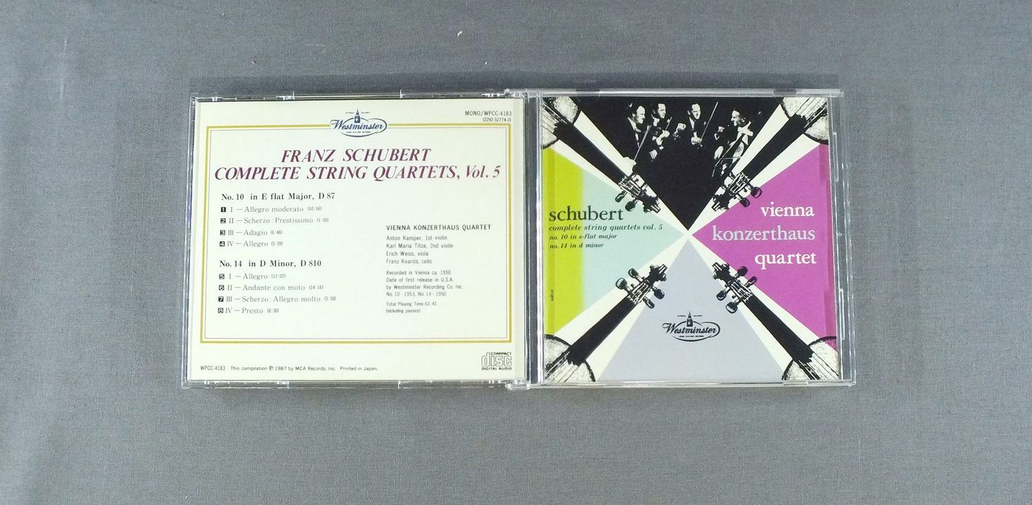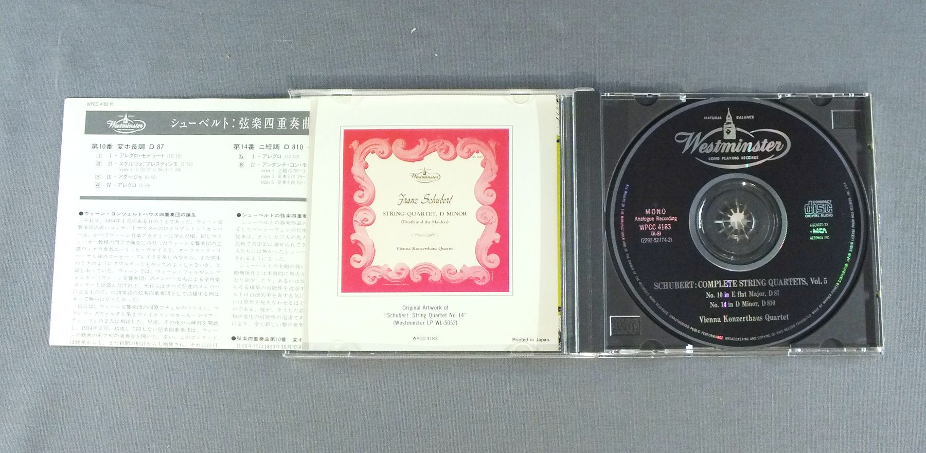 VIENNA KONZERTHAUS Qウィーン・コンツェルトハウス四重奏団/SCHUBERT-COMPLETE SQS VOL5シューベルト-全集 第5集 WPCC4183 製造国:日本盤 / Media:CD外観:EX盤の状態:EX- 価格(税込):¥1,430 送料 7inch:定形外郵便 360円~LP:定形外郵便 660円~送料は、注文の最終画面で確認頂けます。 > > VIENNA KONZERTHAUS Q/SCHUBERT-COMPLETE SQS VOL5 外観 (EX)特記事項:特記事項無。コンディションリストを参照。外観EXの共通説明:ダメージが限定的。中古品としては保存状態がよい方。シミ、ヨゴレ、スレ 少し~軽度。 盤の状態 (EX-)特記事項:薄いスリキズ・細かい表面スレ多少ある感じ。殆どが軽微なものの様子です。盤EX-の共通説明:盤面のスリキズが多少有り。音に出そうなものは殆ど無いように見える~さほど気にならないぐらいの軽いプチ数カ所程度。 Tweet それぞれの画像をクリックすると、大きい写真が見られます こちらの商品もお勧めです 1,320円 ACHENBACH - DAS HEIDELBERGER KAMMERORCHESTERアッヘンバッハ - ハイデルベルグ室内管弦楽団 / BACH - MESSE IN H-MOLLバッハ - ロ短調ミサ曲 990円 BEAUX ARTS TRIOボザール・トリオ / BEETHOVEN - PIANO TRIO NO.7ベートーヴェン - ピアノ三重奏曲第7番