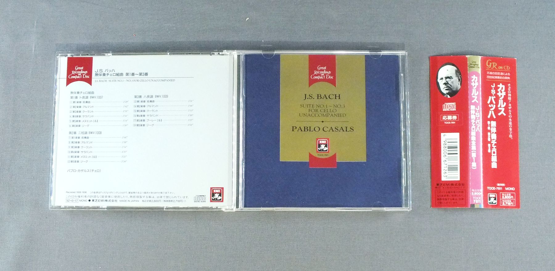 PABLO CASALSパブロ・カザルス/BACH-SUITE NO1-NO3 FOR CELLO UNACCOMPANIEDバッハ-無伴奏チェロ組曲全集 (第1集) TOCE7811 製造国:日本盤 / Media:CD外観:EX盤の状態:EX帯:EX 価格(税込):¥990 送料 7inch:定形外郵便 360円~LP:定形外郵便 660円~送料は、注文の最終画面で確認頂けます。 > > PABLO CASALS/BACH-SUITE NO1-NO3 FOR CELLO UNACCOMPANIED 外観 (EX)特記事項:特記事項無。コンディションリストを参照。外観EXの共通説明:ダメージが限定的。中古品としては保存状態がよい方。シミ、ヨゴレ、スレ 少し~軽度。 盤の状態 (EX)特記事項:薄いスリキズ・スレ軽くある感じ。殆どが軽微なものの様子です。盤EXの共通説明:盤面のスリキズが薄いものが少し~軽度 音に出そうなものは無いように見える(軽微なソフトティック音は除く)。 帯の状態 (EX):特記事項無。コンディションリストを参照。 Tweet それぞれの画像をクリックすると、大きい写真が見られます こちらの商品もお勧めです 990円 MENUHIN - BATH FESTIVAL CEMBER ORCHESTRAメニューイン - バース音楽祭管弦楽団 / BACH - SUITE NO2&3バッハ - 管弦楽組曲第2番第3番 990円 WEISSENBERGワイセンベルク / BACH - PARTITAS VOL.2バッハ - パルティータ第2番5番6番 990円 GARRICK OHLSSONギャリック・オールソン / CHOPIN - POLONAISESショパン - ポロネーズ 1,540円 MAURIZIO POLLINIポリーニ / CHOPIN - POLONAISESショパン - ポロネーズ 990円 LANDOWSKA - KREISLER - RACHMANINOV etcランドフスカ - クライスラー - ラフマニノフ他 / FAMOUS INSTRUMENTALISTS OF THE EARLY 20th器楽奏者の巨匠たち 1,760円 KAZUNE SHIMIZU清水和音 / CHOPIN - 4 BALLADESショパン - バラード 990円 KARL RICHTERカール・リヒター / BACH - TOCCATA AND FUGUEバッハ - トッカータとフーガ 990円 HOROVITZホロヴィッツ / BEETHOVEN - APPASSIONATA WALDSTEINベートーベン - ピアノ・ソナタ21番23番