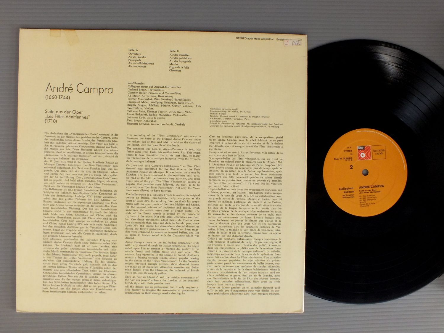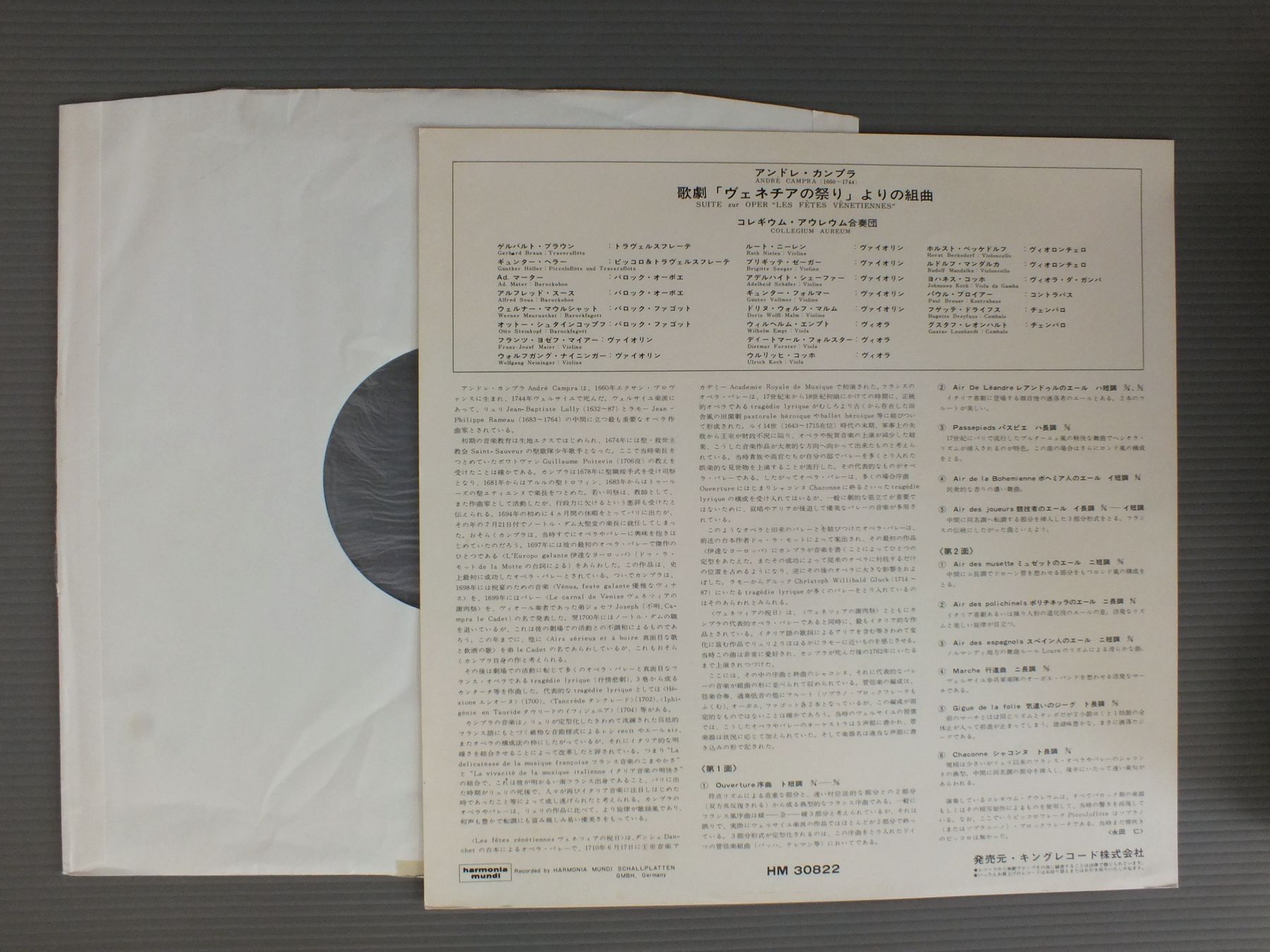 COLLEGIUM AUREUMコレギウム・アウレウム合奏団/ANDRE CAMPRA-LES FETES VENITIENNESアンドレ・カンプラ- ヴェネチアの祭り よりの組曲 20 29102 2 製造国:独盤 / Media:LP外観:EX盤の状態:EX 価格(税込):¥2,200(売約済) 送料 7inch:定形外郵便 360円~LP:定形外郵便 660円~送料は、注文の最終画面で確認頂けます。 > > COLLEGIUM AUREUM/ANDRE CAMPRA-LES FETES VENITIENNES 外観 (EX)特記事項:裏ジャケ上ヘリ部分にテープ。外観EXの共通説明:ダメージが限定的。中古品としては保存状態がよい方。シミ、ヨゴレ、スレ 少し~軽度。 盤の状態 (EX)特記事項:薄いスリキズ・スレ軽くある感じ。軽微なものの様子です。盤EXの共通説明:盤面のスリキズが薄いものが少し~軽度 音に出そうなものは無いように見える(軽微なソフトティック音は除く)。 Tweet それぞれの画像をクリックすると、大きい写真が見られます こちらの商品もお勧めです 3,300円 DAVID MUNROW / ART OF THE NETHERLANDS 1,650円 PHOENIX SQ / FRANZ BERWALD STREICHQARTETT 1,320円 M.BIXLER-L.DAVENPORT / FOR THREE ALTO RECORDERS 3,300円 TALVELA GOTHONI / SCHUBERT WINTERREISE 1,430円 SIEGFRIED PANK - CHRISTIANE JACCOTTET / GAMBENSONATEN SONATAS FOR VIOLA DA GAMBA 1,210円 CLEMENCIC - ENSEMBLE MUSICA ANTIQUAクレメンツィス - ムジカ・アンティカ合奏団 / FESTICHE BLASERMUSIK DES BAROCKバロックの祝祭的管合奏 990円 LANDOWSKA / BACH GOLDBERG VARIATIONS 1,650円 BRAZ-GEHANN / BACHTROMPETE & ORGEL VOL2