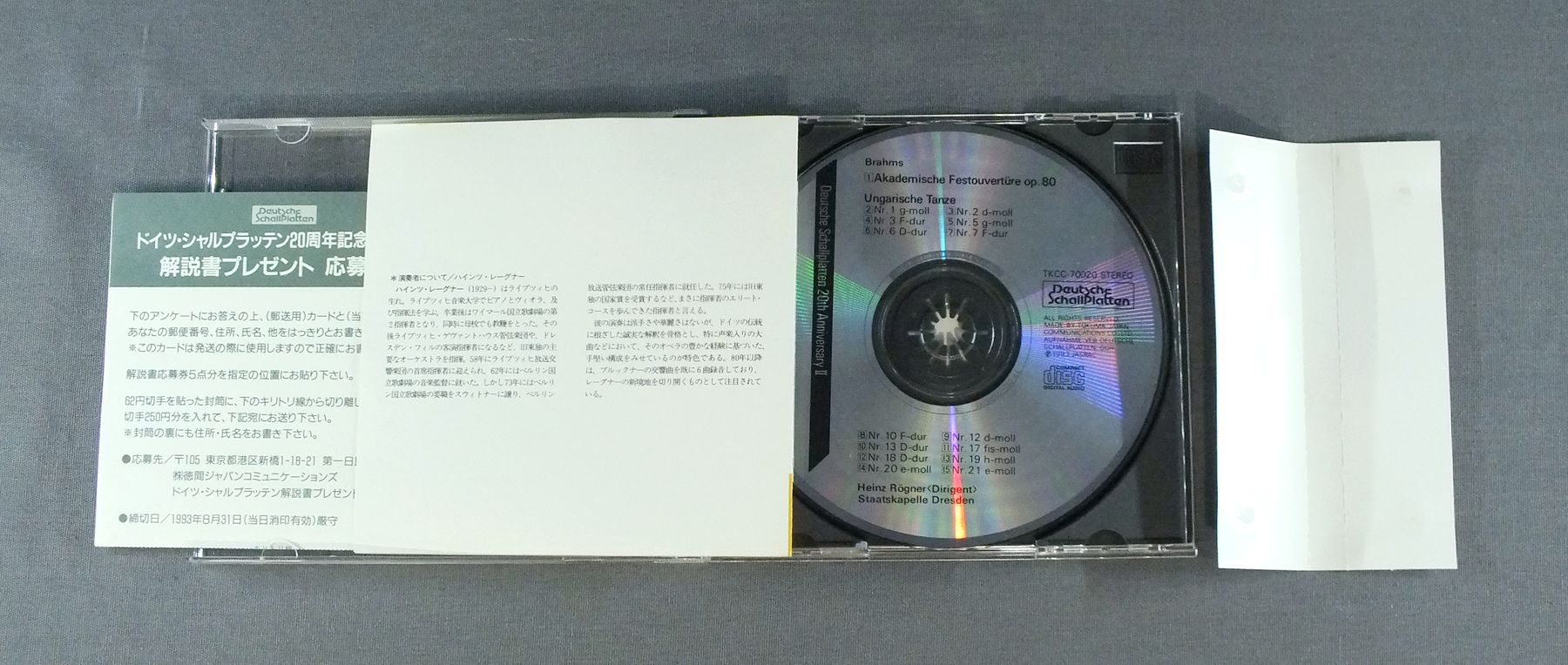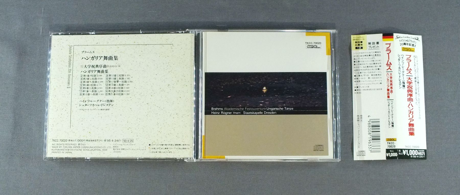HEINZ RONGER-STAATSKAPELLE DRESDENハインツ・レーグナー-シュターツカペレ・ドレスデン/BRAHMS-AKADEMISCHE FESTOUVERTURE-UNGARISCHE TANZEブラームス-大学祝典序曲-ハンガリア舞曲集 TKCC70020 製造国:日本盤 / Media:CD外観:EX盤の状態:EX+帯:EX+ 価格(税込):¥440 送料 7inch:定形外郵便 360円~LP:定形外郵便 660円~送料は、注文の最終画面で確認頂けます。 > > HEINZ RONGER-STAATSKAPELLE DRESDEN/BRAHMS-AKADEMISCHE FESTOUVERTURE-UNGARISCHE TANZE 外観 (EX)特記事項:特記事項無し。コンディションリストを参照。外観EXの共通説明:ダメージが限定的。中古品としては保存状態がよい方。シミ、ヨゴレ、スレ 少し~軽度。 盤の状態 (EX+)特記事項:薄いスリキズ・スレ少し。一見してきれいな状態です。盤EX+の共通説明:盤面の極薄いスリキズ、スレ少し程度 音に出そうなものは無いように見える(極軽微なソフトティック音は除く)。 帯の状態 (EX+):特記事項無し。コンディションリストを参照。 Tweet それぞれの画像をクリックすると、大きい写真が見られます こちらの商品もお勧めです 1,540円 VICTOR DESARZENS - LAUSANNE CHEMBER ORCHESTRAデザルツェンス - ローザンヌ室内管弦楽団 / WEBER - SYMPHONY NO1ウエーバー交響曲第1番 990円 BARENBOIM - ENGLISH CHAMBER ORCHESTRAバレンボエム - イギリス室内管弦楽団 / SCHONBERG - VERKLARTE NACHETシェーンベルク - 浄夜 1,540円 BAUMGAETNER - FESTIVAL STRINGS LUCERNEバウムガルトナー - ルツェルン音楽祭弦楽合奏団他 / VIVARDI - CONCERTO FOR 2 VIOLINヴィヴァルディ - 2つのヴァイオリンのための協奏曲他 1,540円 HELMUTH RILLING - BACH ENSEMBLEヘルムート・リリング - バッハ・アンサンブル / BACH KANTATE BWV174 & 117バッハ・カンタータ BWV174 & 117 990円 VIENER STREICHQUARTETTウィーン弦楽四重奏 / HAYDN - STRING QUARTET NO.77 `EMPEROR`ハイドン - 弦楽四重奏曲第77番 皇帝 990円 BORODIN QUARTETボロディン弦楽四重奏団 / BORODIN - STRING QUARTET NO.2ボロディン - 弦楽四重奏曲第2番 2,420円 AMADEUS QUARTETアマデウス四重奏団 / HAYDN - KAISERQUARTETTハイドン弦楽四重奏曲第77番 1,540円 OTTO BUCHNER - EDGAR SHANN - RICHITER - MUNCHENER BACH ORKESTオットー・ブフナー - エドガー・シャン - カール・リヒター - ミュンヘン・バッハ管弦楽団 / BACH - DUBBELCONCERT VOOR VIOOL EN HOBOバッハ - ヴァイオリンとオーボのための二重協奏曲