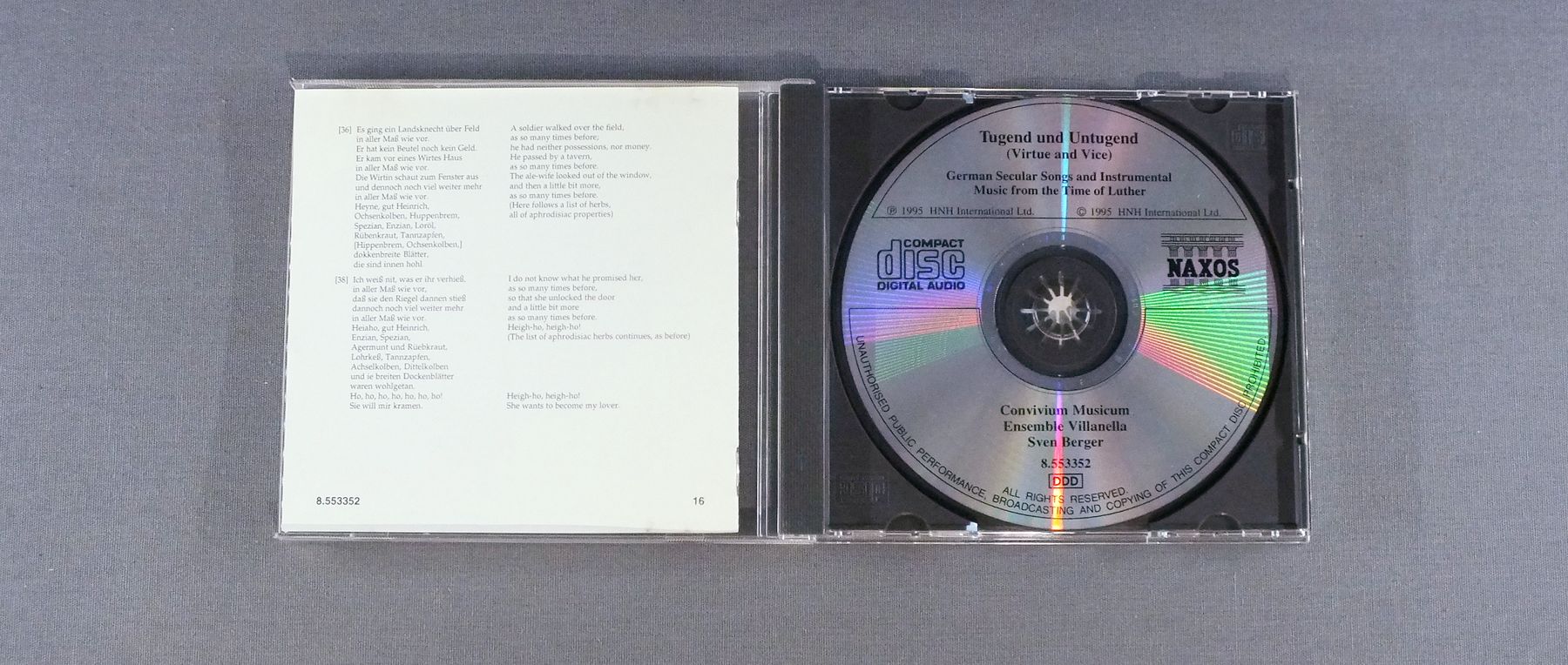 EARLY MUSIC/GERMAN SECULAR SONGS & INTERNATIONAL MUSIC FROM TIME OF LUTHER 8 553352 製造国:独盤 / Media:CD外観:EX盤の状態:EX 価格(税込):¥550 送料 7inch:定形外郵便 360円~LP:定形外郵便 660円~送料は、注文の最終画面で確認頂けます。 レコード検索 > SWING/BIG BAND > EARLY MUSIC/GERMAN SECULAR SONGS & INTERNATIONAL MUSIC FROM TIME OF LUTHER 外観 (EX)特記事項:ブックレットのカバーによごれが少々。底のカードに日焼け感軽。外観EXの共通説明:ダメージが限定的。中古品としては保存状態がよい方。シミ、ヨゴレ、スレ 少し~軽度。 盤の状態 (EX)特記事項:薄いスリキズ・スレ少しある感じ。一見してきれいな感じです。盤EXの共通説明:盤面のスリキズが薄いものが少し~軽度 音に出そうなものは無いように見える(軽微なソフトティック音は除く)。 Tweet それぞれの画像をクリックすると、大きい写真が見られます こちらの商品もお勧めです 990円 BEAUX ARTS TRIOボザール・トリオ / BEETHOVEN - PIANO TRIO NO.7ベートーヴェン - ピアノ三重奏曲第7番 1,320円 ACHENBACH - DAS HEIDELBERGER KAMMERORCHESTERアッヘンバッハ - ハイデルベルグ室内管弦楽団 / BACH - MESSE IN H-MOLLバッハ - ロ短調ミサ曲