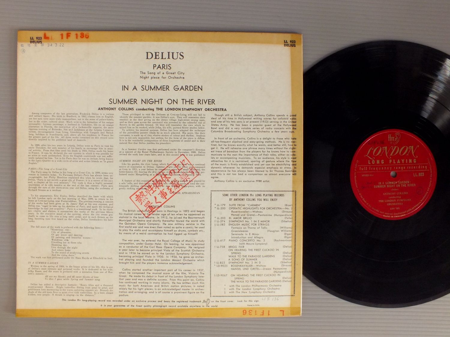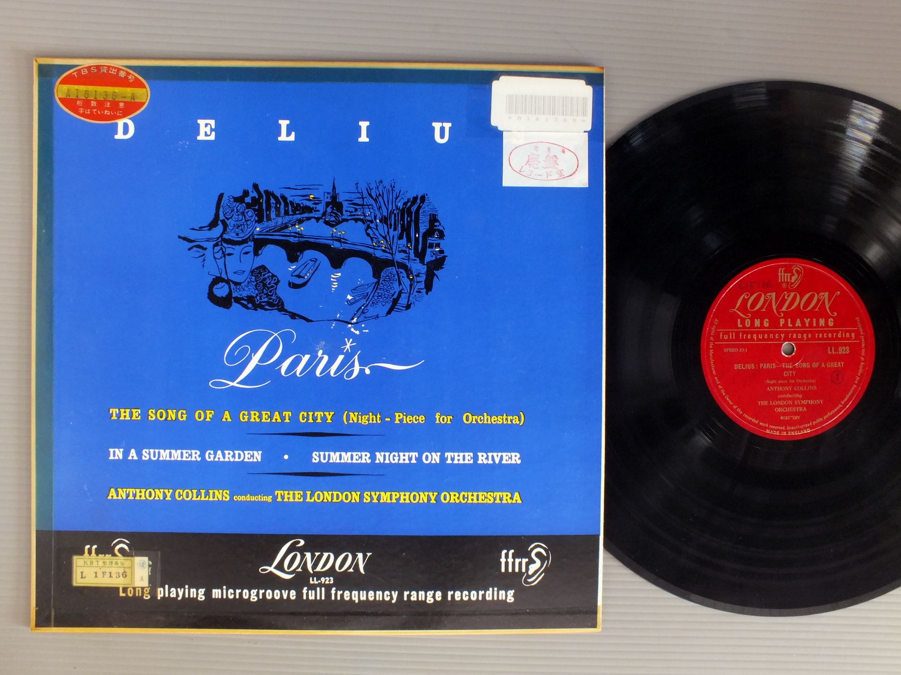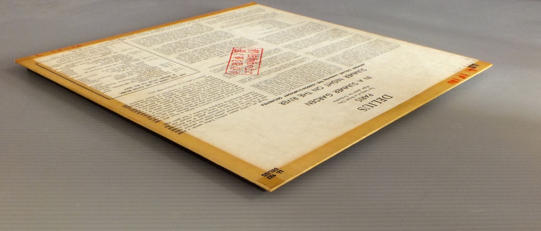 COLLINS/DELIUS-PARIS IN A SUMMER GARDEN LL923 製造国:英国盤 / Media:LP外観:VG盤の状態:VG+ 価格(税込):¥1,650(売約済) 送料 7inch:定形外郵便 360円~LP:定形外郵便 660円~送料は、注文の最終画面で確認頂けます。 > > COLLINS/DELIUS-PARIS IN A SUMMER GARDEN 外観 (VG)特記事項:背やヘリにテープ。ステッカーやスタンプ有り。外観VGの共通説明:ダメージが見るからに多い。 盤の状態 (VG+)特記事項:薄いスリキズ・細かいスレ軽度。周期的にプチ出そうな小キズ、線キズは数カ所で、全体的には軽微なものが殆どです。少し聴いてみましたが、音自体はしっかりクリアーに鳴っているようでした。盤VG+の共通説明:盤面にスリキズが多少~やや有り、音に出そうなものも多少ある。 Tweet それぞれの画像をクリックすると、大きい写真が見られます こちらの商品もお勧めです 1,210円 PRIMROSE - BEECHAM - ROYAL PHIL. / BERLIOZ - HAROLD IN ITALY 990円 WALTER - COLUMBIA SYM. ORCH / BRAHMS - SYM NO1 1,650円 ERICH KUNZ etc / STRAUSS-EINE NACHT IN VENEDIG 990円 BLUMENTAL-HELMUTH FROSCHAUER / PADEREWSKI-PIANO CONC. 1,320円 OTTO ACKERMANN / BUSONI-TURANDOT 1,320円 GIESEKING / MOZART-COMPLETE WORKS FOR PIANO SOLO ALBUM 4 1,320円 FRITZ BUSCH - TONKUNSTLER ORCH.フリッツ・ブッシュ - トーンキュンストラー管弦楽団 / BEETHOVEN - SYM. No8ベートーヴェン 交響曲第8番 990円 ROZHDESTVENSKYロジェストヴェンスキー / TCHAIKOVSKY SYM. NO6