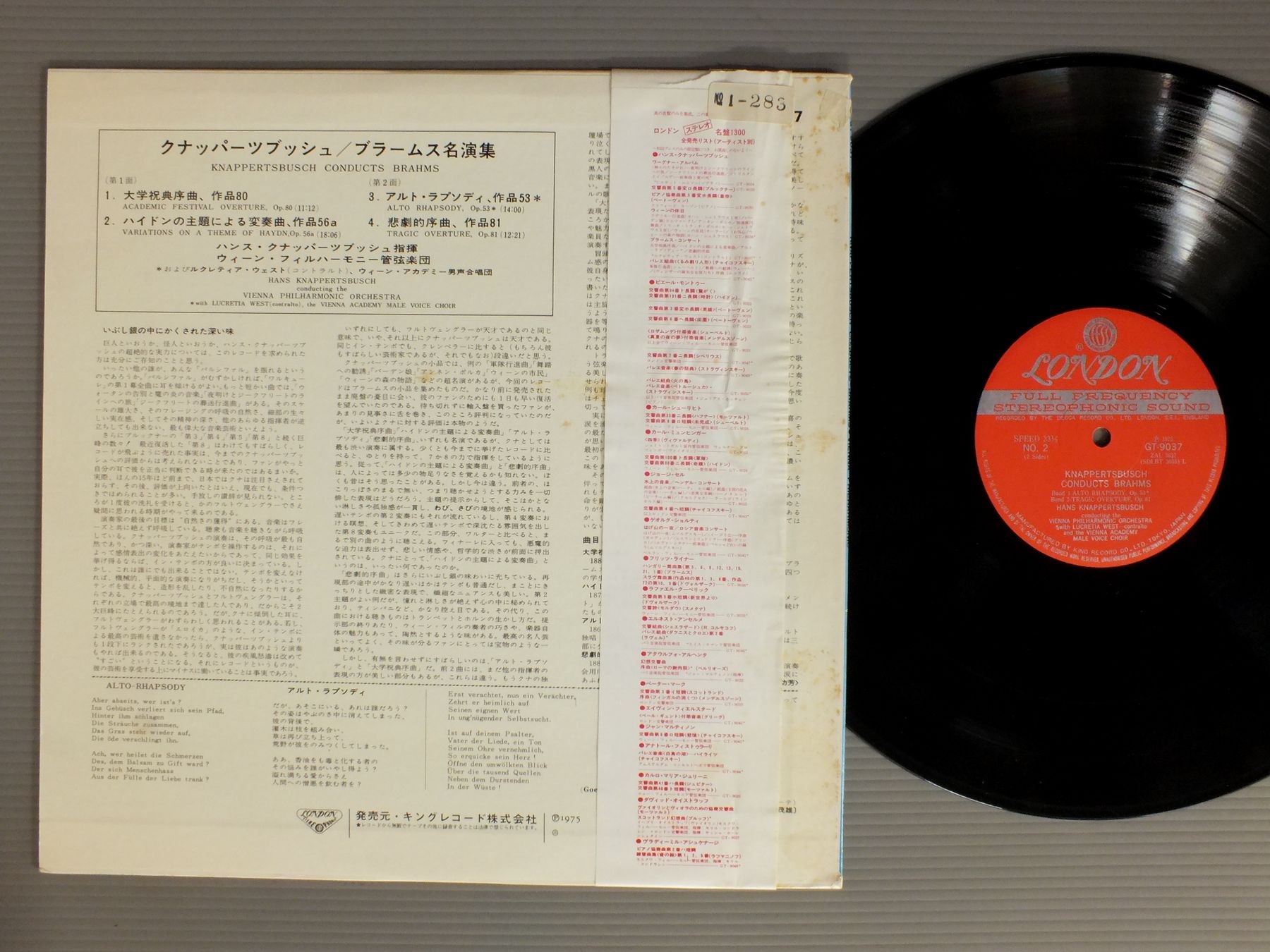 KNAPPERTSBUSCHクナッパーツブッシュ/CONDUCTS BRAHMSクナッパーツブッシュ-ブラームス名演集 GT9037 製造国:日本盤 / Media:LP外観:VG+盤の状態:EX+ 価格(税込):¥770(売約済) 送料 7inch:定形外郵便 360円~LP:定形外郵便 660円~送料は、注文の最終画面で確認頂けます。 レコード検索 > 全てのジャンル > KNAPPERTSBUSCH/CONDUCTS BRAHMS 外観 (VG+)特記事項:ジャケ表面にシミやよごれ有り。外観VG+の共通説明:ダメージやや有り。シミ、ヨゴレ、スレなど多少~やや多め。 盤の状態 (EX+)特記事項:薄いスリキズ・スレ少し。一見してきれいな状態です。盤EX+の共通説明:盤面の極薄いスリキズ、スレ少し程度 音に出そうなものは無いように見える(極軽微なソフトティック音は除く)。 帯の状態 ():シミや切れ有り。 Tweet それぞれの画像をクリックすると、大きい写真が見られます こちらの商品もお勧めです 990円 SZELLセル / TCHAIKOVSKY CONC. NO1チャイコフスキー ピアノ協奏曲 第1番 変 1,210円 SERKIN - BERNSTEIN - NEW YORK PHIL.ゼルキン - バーンスタイン - ニューヨーク・フィル / BEETHOVEN - PIANO CONCERTO NO5 EMPERORベートーヴェン - ピアノ協奏曲第5番 皇帝-レオノーレ序曲第3番 1,386円 KARAJAN - BERLIN PHIL.カラヤン - ベルリン・フィル / SIBELIUS - FINLANDIAシベリウス - フィンランディア 990円 KARAJANカラヤン / ROSSINI-OVERTURESウィリアム・テル-ロッシーニ-序曲集 990円 ASHKENAZY - SOLTI - CHICAGO SYM.アシュケナージ - ショルティ - シカゴ交響楽団 / BEETHOVEN - COMPLETE PIANO CONCERTOS 4LP BOXベートーヴェン - ピアノ協奏曲全集 4枚組 990円 KUBELIK - VIENNA PHIL.クーベリック指揮ウイーン・フィルハーモニー管弦楽団 / BEETOVEN - SYMPHONY No7ベートーヴェン交響曲第7番イ長調 990円 RICHTERリヒテル / MOUSSORGSKY - PICTURES AT AN EXHIBITION展覧会の絵 990円 TALICH-CZECH PHILHARMONICターリッヒ-チェコ・フィルハーモニー管弦楽団 / TCHAIKOVSKY-SYM. NO6 PATHETIQUEチャイコフスキー-交響曲第6番 悲愴