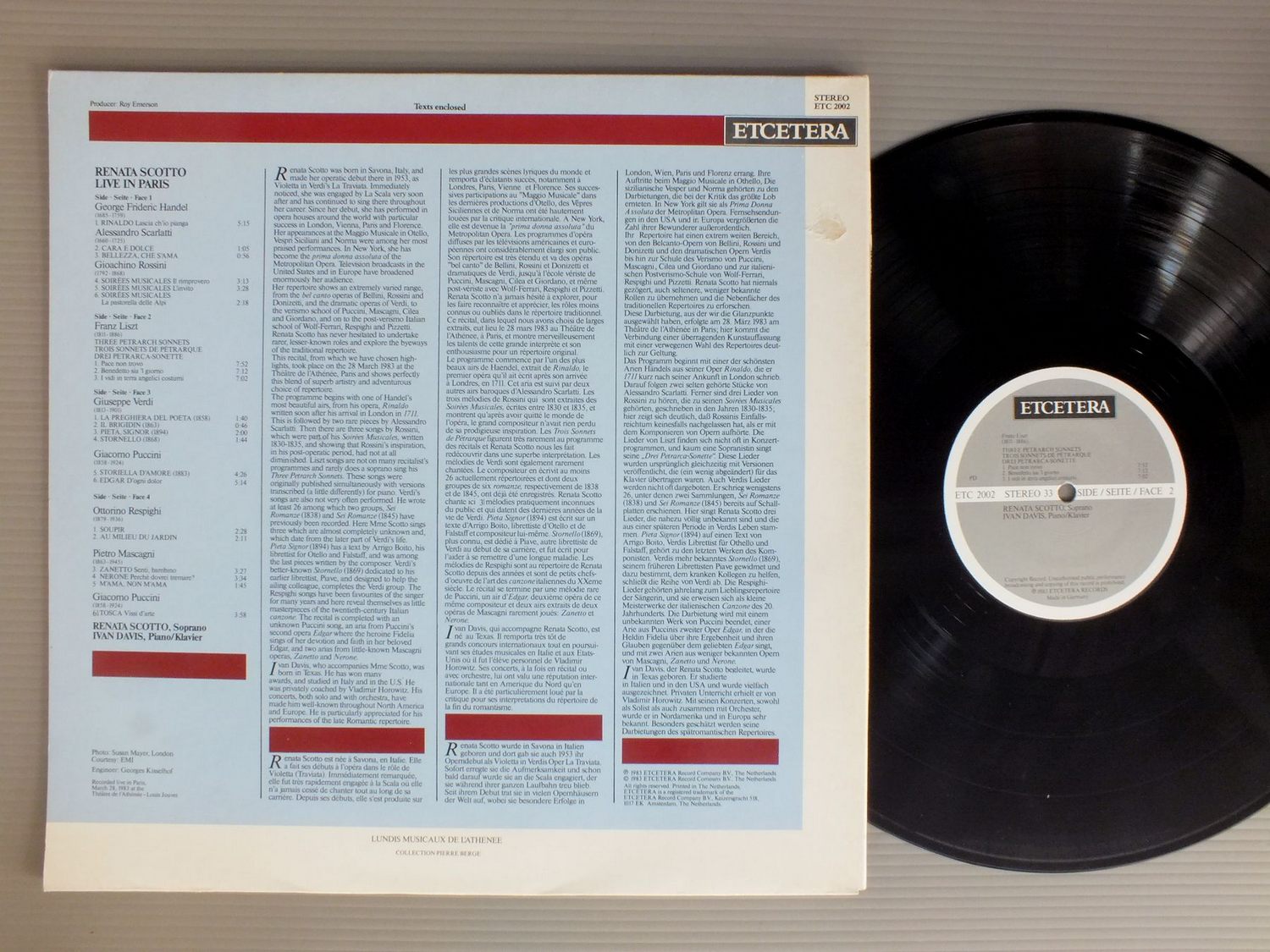 IVAN DAVIS/RECITAL-RENATA SCOTTO-LIVE IN PARIS ETC2002 製造国:独盤 / Media:LP外観:EX-盤の状態:EX 価格(税込):¥1,540(売約済) 送料 7inch:定形外郵便 360円~LP:定形外郵便 660円~送料は、注文の最終画面で確認頂けます。 > > IVAN DAVIS/RECITAL-RENATA SCOTTO-LIVE IN PARIS 外観 (EX-)特記事項:裏ジャケに破け有。外観EX-の共通説明:ダメージ軽度~多少。 中古品としては普通の状態。シミ、ヨゴレ、スレなど軽く~多少。 盤の状態 (EX)特記事項:薄いスリキズ・スレ軽くある感じ。殆どが軽微なものの様子です。盤EXの共通説明:盤面のスリキズが薄いものが少し~軽度 音に出そうなものは無いように見える(軽微なソフトティック音は除く)。 Tweet それぞれの画像をクリックすると、大きい写真が見られます こちらの商品もお勧めです 1,320円 PAILLARDパイヤール / BACH-ORCH.L SUITES 1,430円 SILVIO VARVISO / ITALIAN OPERA CHORUSES 1,870円 MAAZEL - NEW PHILHARMONIA ORCH. / BRAHMS - DEUTSCHES REQUIEM 2LP BOXBRAHMS - DEUTSCHES REQUIEM 2枚組 1,540円 DE LOS ANGELES-FRUHBECK DE BURGOS / FALLA-LA VIDA BREVE 1,210円 LEONOIE RYSANEK - BASILE / OPERATIC ARIAS 990円 MARIA CALLAS-SCHWARZKOPF etc / GREAT HITS FROM GRAND OPERA VOL1 1,320円 V.REINSHAGEN / LEHAR-COUNT OF LUXEMBOURG 1,320円 ELENOR STEBER - RISE STEVENS etc / COLLECTOR`S PORGY & BESS