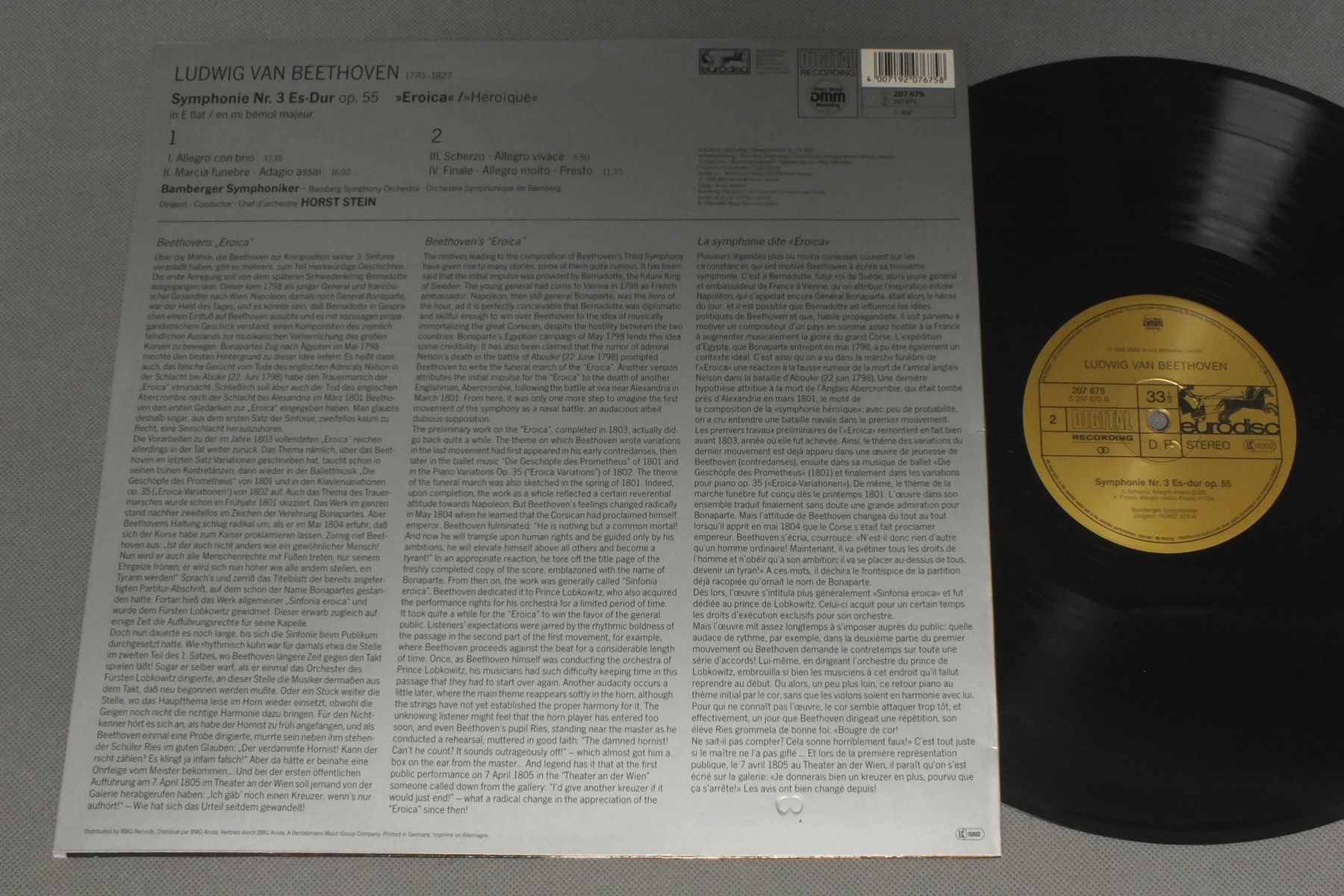 STEIN/BEETHOVEN・SYM. NO3 207 675 製造国:独盤 / Media:LP外観:EX盤の状態:EX+ 価格(税込):¥1,375(売約済) 送料 7inch:定形外郵便 360円~LP:定形外郵便 660円~送料は、注文の最終画面で確認頂けます。 > > STEIN/BEETHOVEN・SYM. NO3 外観 (EX)特記事項:特記なし。外観EXの共通説明:ダメージが限定的。中古品としては保存状態がよい方。シミ、ヨゴレ、スレ 少し~軽度。 盤の状態 (EX+)特記事項:薄いスリキズ・スレ少し。一見してきれいな状態です。盤EX+の共通説明:盤面の極薄いスリキズ、スレ少し程度 音に出そうなものは無いように見える(極軽微なソフトティック音は除く)。 Tweet それぞれの画像をクリックすると、大きい写真が見られます こちらの商品もお勧めです 1,430円 SCHURICHT-MONTEUX / SCHUBERT-UNFINISHED SYM. 990円 ERICH KUNZEL / OFFENBACH-GAITE PARISIENNE 1,650円 ANDRAS KORODI / CHOPIN - PIANO CONCERTO IN E MINOR OP11 etc 990円 BOSKOVSKY - VIENNA PHILHARMONIC / NEW YEAR`S IN VIENNA 1,430円 ROWICKIロヴィッキー / TCHAIKOVSKY/BALLET-SUITEN etc 990円 HERBILION-KUENTZ-MURGIER-HOLLEBEKE / SAUGUET-L `OISEAU A VU TOUT CELA 1,430円 PAUL VAN KEMPEN / BEETHOVEN-EROICA 1,320円 ASHKENAZY / SIBELIUS-SYM. NO2