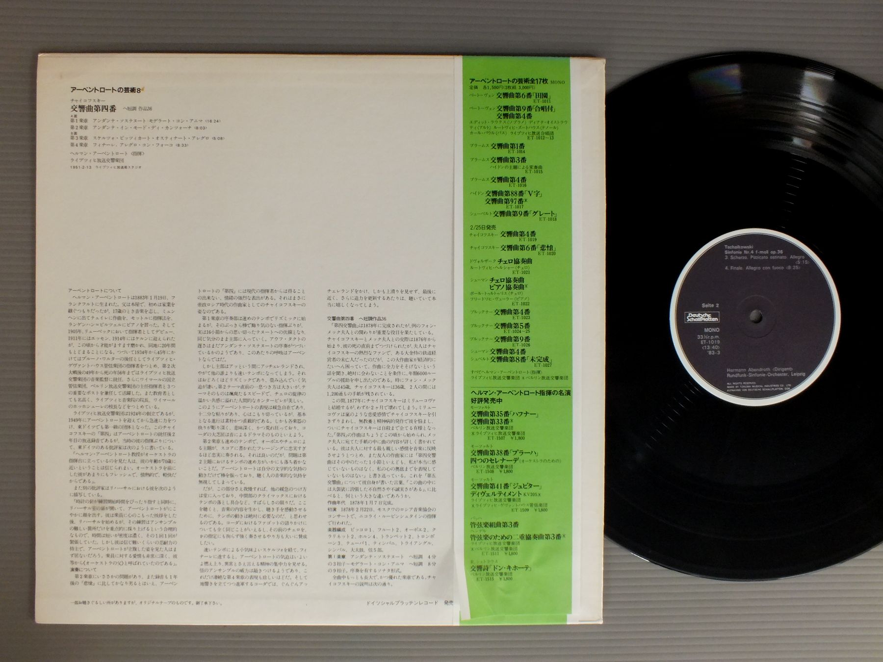 HERMANN ABENDROTHヘルマン・アーベントロート/TCHAIKOWSKI-SYM.アーベントロートの芸術 8-チャイコフスキー-交響曲 第四番 ET1019 製造国:日本盤 / Media:LP外観:EX盤の状態:EX+帯:EX 価格(税込):¥2,077(売約済) 送料 7inch:定形外郵便 360円~LP:定形外郵便 660円~送料は、注文の最終画面で確認頂けます。 > > HERMANN ABENDROTH/TCHAIKOWSKI-SYM. 外観 (EX)特記事項:特記なし。外観EXの共通説明:ダメージが限定的。中古品としては保存状態がよい方。シミ、ヨゴレ、スレ 少し~軽度。 盤の状態 (EX+)特記事項:薄いスリキズ・スレ少し。一見してきれいな状態です。盤EX+の共通説明:盤面の極薄いスリキズ、スレ少し程度 音に出そうなものは無いように見える(極軽微なソフトティック音は除く)。 帯の状態 (EX):特記なし。 Tweet それぞれの画像をクリックすると、大きい写真が見られます こちらの商品もお勧めです 770円 BACKHAUSバックハウス / BEETHOVEN - COMPLETE PIANO SONATAS VOL1 (NO1 2 & 3 )ベートーヴェン - ピアノ奏鳴曲全集第1集 990円 BOHM - VPOボーム - ウィーン・フィル / BRAHMS SYM NO3ブラームス交響曲第3番 990円 MEHTA - ISRAEL PHIL.メータ - イスラエル・フィル / TCHAIKOVSKY - SUITES FROM SWAN LAKE & NUTCRACKERチャイコフスキー - 白鳥の湖・くるみ割り人形 770円 FIEDLER - BOSTON POPS ORCH.フィドラー - ボストン・ポップス管弦楽団 / GOLD & SILVER WALTZ魅惑のワルツ集 770円 KARAJAN - BERMAN - BERLIN PHIL.ベルマン - カラヤン - ベルリン・フィル / TSCHAIKOWSKY - PIANO CONC. NO1チャイコフスキー - ピアノ協奏曲第1番 990円 MARTINONマルティノン / PIERNE-CYDALISE ET LE CHEVRE-PIEDピエルネ- シダリーズとの牧羊神 1,320円 SOLTI - CHICAGO SYMPHONY ORCHESTRAショルティ - シカゴ交響楽団 / BEETHOVEN - SYMPHONY NO.7ベートーヴェン - 交響曲第7番 770円 GUSCHLBAUER - LANCELOT - HONGNE - BABOTEUグシュルバウアー - ハンベルク交響楽団 / WEBER - TROIS CONCERTOSウェーバー - 管楽器のための協奏曲集