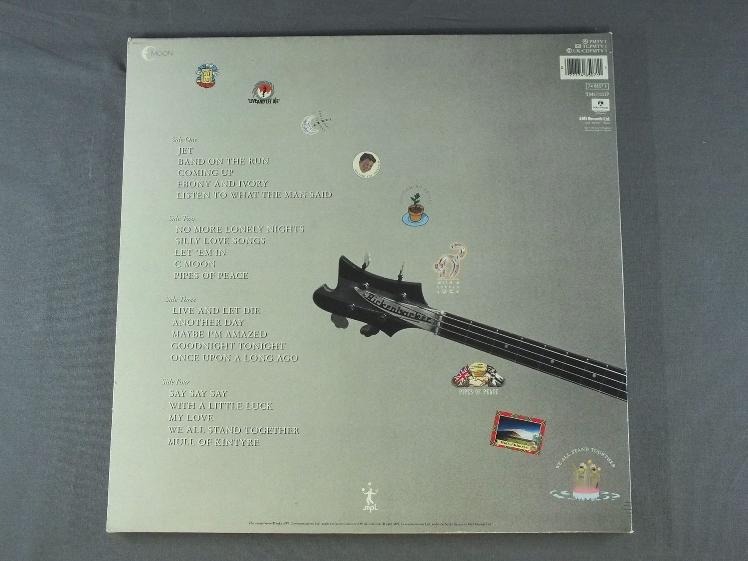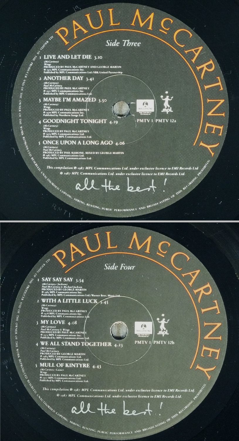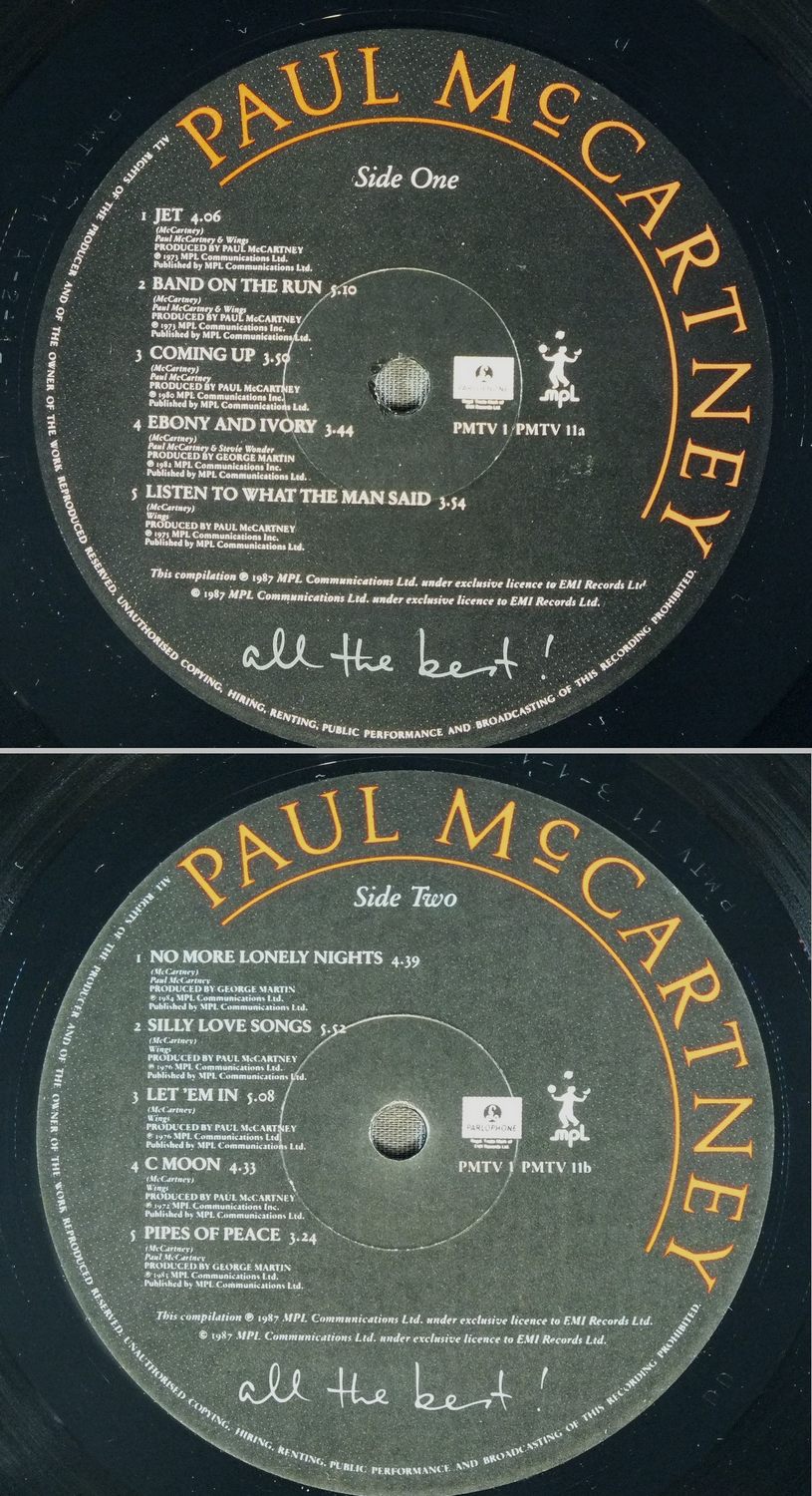 PAUL McCARTNEY/ALL THE BEST PMTV1 製造国:英国盤 / Media:LPMatrix:A-2-1-3 B-1-1-1 A-2-1-2 B-2-1-2外観:EX+盤の状態:EX 価格(税込):¥4,950(売約済) 送料 7inch:定形外郵便 360円~LP:定形外郵便 660円~送料は、注文の最終画面で確認頂けます。 > > PAUL McCARTNEY/ALL THE BEST 外観 (EX+)特記事項:表ジャケ上下角にスレが少し。ジャケ表面は見開きも含めて全体的にスレやスリキズ、よごれ等は薄い感じ。きれいな状態です。オリジナルインナーは2枚とも抜けも無く、スレやよごれ等も少ないきれいな状態。外観EX+の共通説明:中古としては美品、一見してきれいでダメージが軽微。シミ、ヨゴレ、スレ有っても僅か~少し。 盤の状態 (EX)特記事項:薄いスリキズ・スレ軽くある感じ。ほとんどが軽微なものの様子です。曲間など、静かなところを中心に聴いて見ましたが、チリプチ軽度で音もしっかり鳴っていました。盤EXの共通説明:盤面のスリキズが薄いものが少し~軽度 音に出そうなものは無いように見える(軽微なソフトティック音は除く)。 Tweet それぞれの画像をクリックすると、大きい写真が見られます こちらの商品もお勧めです 5,500円 JOHN LENNON / SHAVED FISH 4,950円 JOHN & YOKO - PLASTIC ONO BANDF / SOME TIME IN NEW YORK CITY 5,500円 BEATLES / AT THE HOLLYWOOD BOWL 5,500円 GEORGE HARRISON / LIVING IN THE MATERIAL WORLD 5,500円 GEORGE HARRISON / THIRTY THREE & 1/3