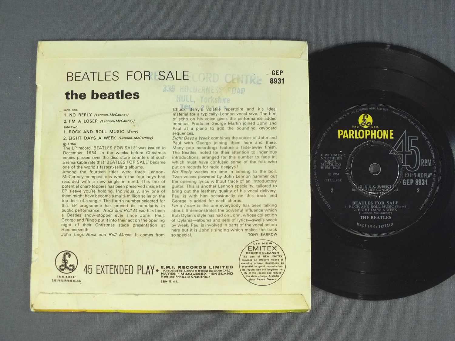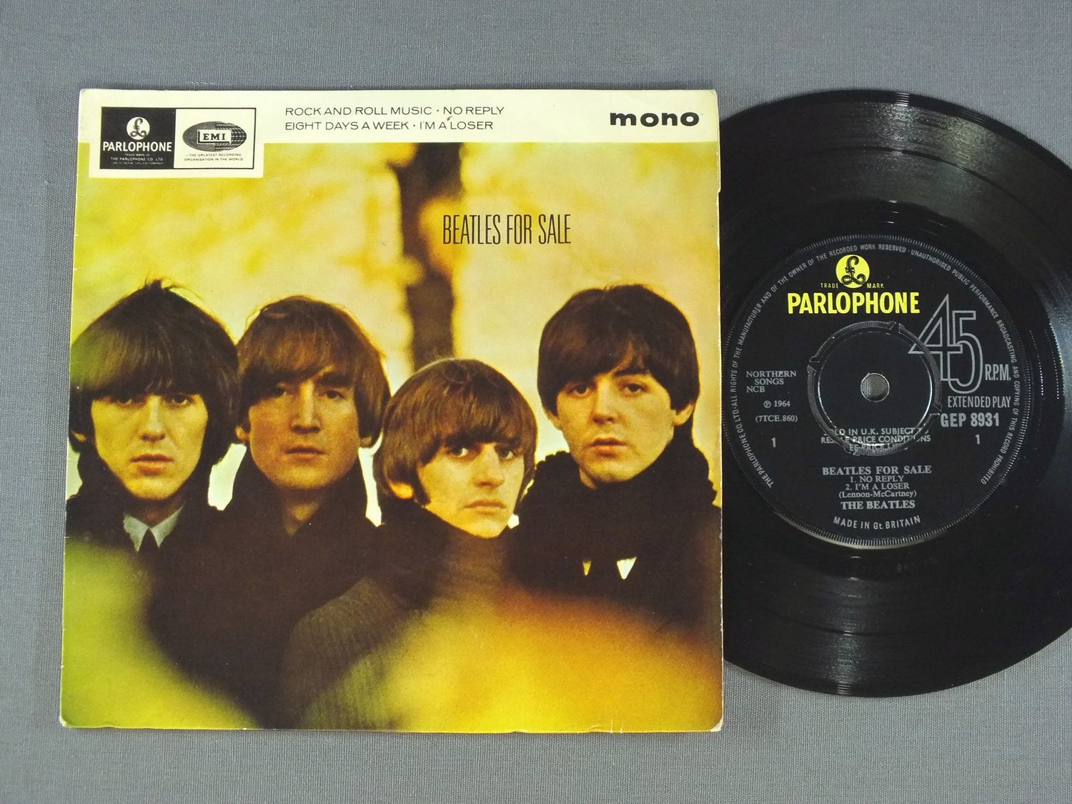 BEATLES/BEATLES FOR SALE EP GEP8931 製造国:英国盤 / Media:7inchMatrix:1N/5/RR 1N/2/L外観:EX-盤の状態:EX 価格(税込):¥13,200(売約済) 送料 7inch:定形外郵便 360円~LP:定形外郵便 660円~送料は、注文の最終画面で確認頂けます。 > > BEATLES/BEATLES FOR SALE EP 外観 (EX-)特記事項:厚手のコーティング仕様。底角にスレが少し。表ジャケはコーティングのヨレシワは少なく、スレやスリキズ、よごれ等も薄い感じと思います。裏ジャケはレコードショップのスタンプ有り。よごれ多少有り。底の折り返しにヨレ多少有。抜けは無いです。外観EX-の共通説明:ダメージ軽度~多少。 中古品としては普通の状態。シミ、ヨゴレ、スレなど軽く~多少。 盤の状態 (EX)特記事項:薄いスリキズ・スレ軽く有る感じ。殆どが軽微なものの様子で、きれいな印象。曲間など、静かなところを中心に聴いて見ましたが、チリノイズ少ないきれいな再生具合でした。盤EXの共通説明:盤面のスリキズが薄いものが少し~軽度 音に出そうなものは無いように見える(軽微なソフトティック音は除く)。 Tweet それぞれの画像をクリックすると、大きい写真が見られます こちらの商品もお勧めです 4,950円 JOHN & YOKO - PLASTIC ONO BANDF / SOME TIME IN NEW YORK CITY 5,500円 BEATLES / AT THE HOLLYWOOD BOWL 5,500円 GEORGE HARRISON / LIVING IN THE MATERIAL WORLD 5,500円 JOHN LENNON / SHAVED FISH 5,500円 GEORGE HARRISON / THIRTY THREE & 1/3