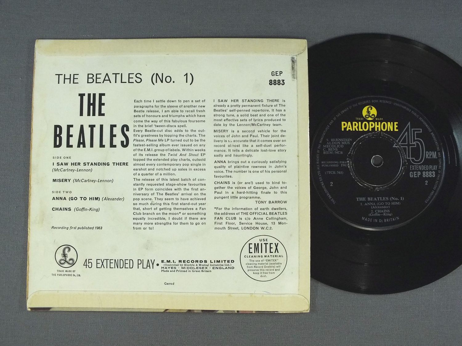BEATLES/BEATLES (No.1) EP GEP8883 製造国:英国盤 / Media:7inchMatrix:1N/1/OR 1N/13/OP外観:EX-盤の状態:EX 価格(税込):¥7,700(売約済) 送料 7inch:定形外郵便 360円~LP:定形外郵便 660円~送料は、注文の最終画面で確認頂けます。 > > BEATLES/BEATLES (No.1) EP 外観 (EX-)特記事項:底角にスレが少し。表ジャケは厚手のコーティング仕様。右上角にステッカーのはがし跡がキズになった部分有り。コーティングのヨレシワはあまり無く、スレやスリキズも薄いものが中心。右肩からリンゴ辺りまで長いスリキズ有り。裏ジャケはよごれ多少有。抜けは無いです。外観EX-の共通説明:ダメージ軽度~多少。 中古品としては普通の状態。シミ、ヨゴレ、スレなど軽く~多少。 盤の状態 (EX)特記事項:薄いスリキズ・スレ少しある程度。音に出そうなものもなく一見してきれいな状態です。曲間など、静かなところを中心に聴いて見ましたが、チリノイズ少ないきれいな再生具合でした。盤EXの共通説明:盤面のスリキズが薄いものが少し~軽度 音に出そうなものは無いように見える(軽微なソフトティック音は除く)。 Tweet それぞれの画像をクリックすると、大きい写真が見られます こちらの商品もお勧めです 5,500円 BEATLES / AT THE HOLLYWOOD BOWL 5,500円 GEORGE HARRISON / THIRTY THREE & 1/3 4,950円 JOHN & YOKO - PLASTIC ONO BANDF / SOME TIME IN NEW YORK CITY 5,500円 JOHN LENNON / SHAVED FISH 5,500円 GEORGE HARRISON / LIVING IN THE MATERIAL WORLD