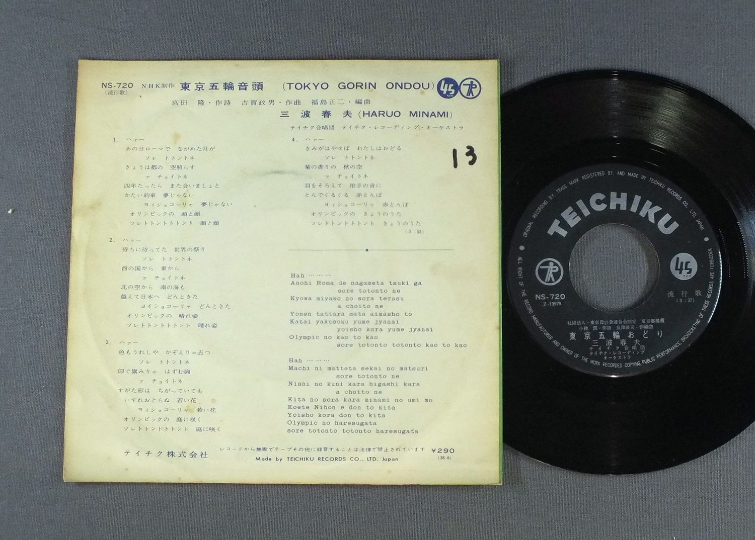 HARUO MINAMI三波春夫/TOKYO OLYMPIC ONDOUNHK制作 東京五輪音頭 NS720 製造国:日本盤 / Media:7inch外観:VG+盤の状態:EX- 価格(税込):¥550 送料 7inch:定形外郵便 360円~LP:定形外郵便 660円~送料は、注文の最終画面で確認頂けます。 > > HARUO MINAMI/TOKYO OLYMPIC ONDOU 外観 (VG+)特記事項:よごれやシミ、書き込み有り。外観VG+の共通説明:ダメージやや有り。シミ、ヨゴレ、スレなど多少~やや多め。 盤の状態 (EX-)特記事項:薄いスリキズ・細かい表面スレ軽くある感じ。全体的には殆どが軽微なものの様子です。盤EX-の共通説明:盤面のスリキズが多少有り。音に出そうなものは殆ど無いように見える~さほど気にならないぐらいの軽いプチ数カ所程度。 Tweet それぞれの画像をクリックすると、大きい写真が見られます こちらの商品もお勧めです 770円 SUMO SOUNDS呼出し三郎 他 / SUMO-JINKU相撲甚句 770円 JAPANESE PRO-WRESTLINGプロレス / SUPER FIGHTER`S THEMESスーパー・ファイターのテーマ 1,320円 PRO-WRESTLINGプロレスリング / PRO-WRESTLING 2プロレスリング 2 990円 甲子園 / 全国中等学校・高等学校野球大会史 1,320円 PRO-WRESTLINGプロレスリング / STAR PRO-WRESTER THEME SONGS各スーパースターテーマ曲集