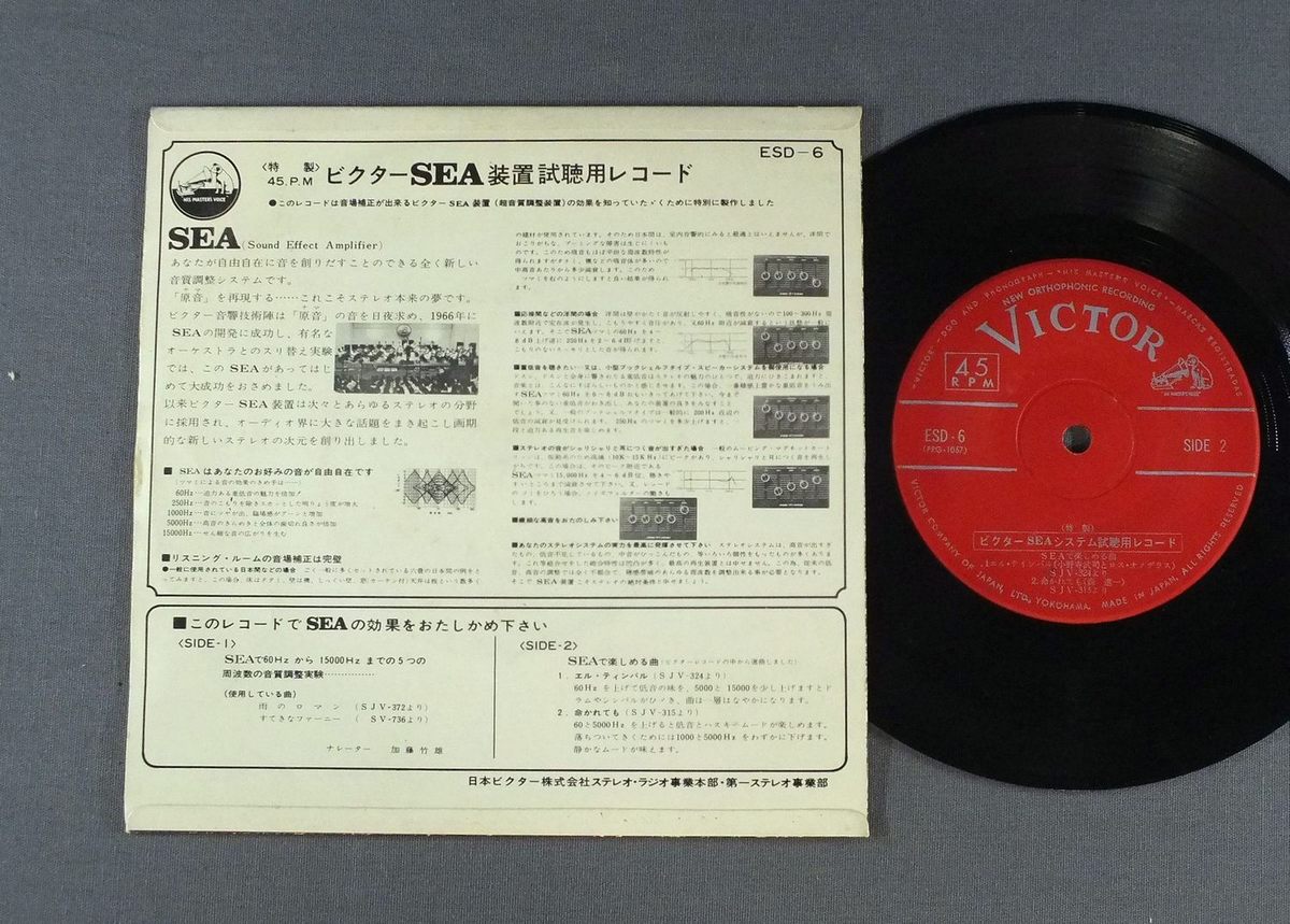 AUDIO CHECK RECORD装置試聴聴用レコード/VICTOR SEA SYSTEMビクターSEA 装置試聴聴用レコード ESD6 製造国:日本盤 / Media:7inch外観:EX-盤の状態:EX- 価格(税込):¥550 送料 7inch:定形外郵便 360円~LP:定形外郵便 660円~送料は、注文の最終画面で確認頂けます。 レコード検索 > SWING/BIG BAND > AUDIO CHECK RECORD/VICTOR SEA SYSTEM 外観 (EX-)特記事項:背スレやヘリスレ、ジャケ表面にヨレシワ。裏ジャケに薄いシミ。外観EX-の共通説明:ダメージ軽度~多少。 中古品としては普通の状態。シミ、ヨゴレ、スレなど軽く~多少。 盤の状態 (EX-)特記事項:薄いスリキズ・細かい表面スレ多少ある感じ。殆どが軽微なものの様子です。盤EX-の共通説明:盤面のスリキズが多少有り。音に出そうなものは殆ど無いように見える~さほど気にならないぐらいの軽いプチ数カ所程度。 Tweet それぞれの画像をクリックすると、大きい写真が見られます こちらの商品もお勧めです 770円 AUDIO CHECK RECORDオーディオ・チェック盤 / INVITATION TO DENON PCM RECORDINGPCM 録音へのお誘い 550円 HEARING TEST RECORDヒアリング・テスト・レコード / CHECK & CHANGE 770円 SHARP STEREOシャープ・ステレオ / OPTONICA CHANNEL 4オプトニカ CHANNEL 4