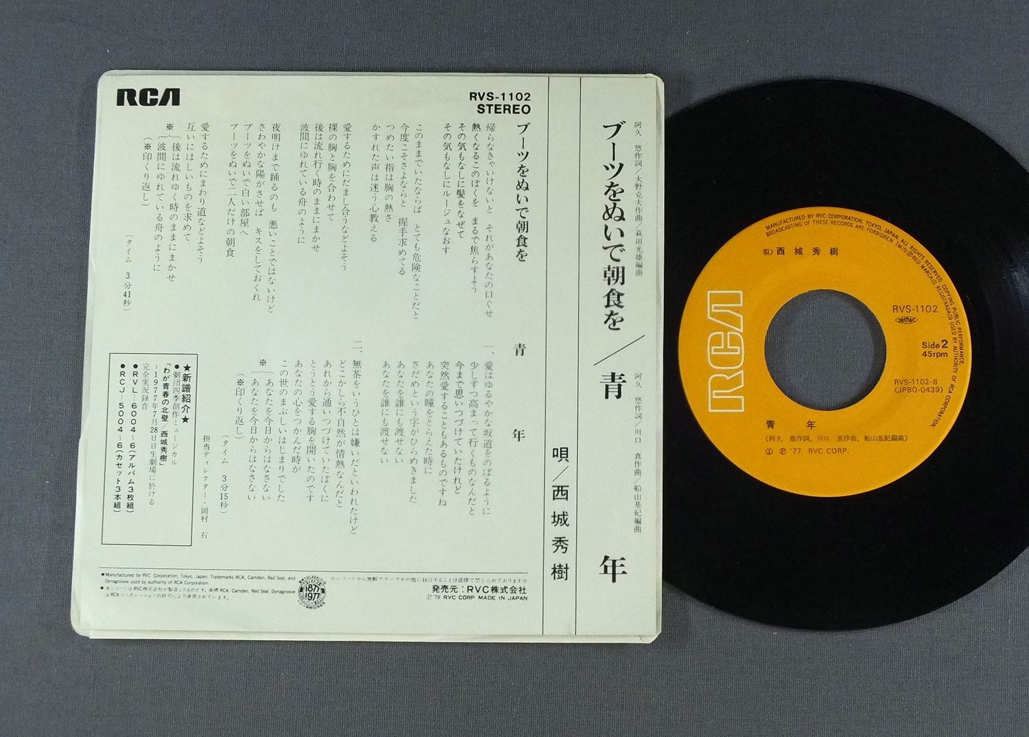 HIDEKI SAIJO西城秀樹/GET OFF THE BOOTSブーツをぬいで朝食を RVS1102 製造国:日本盤 / Media:7inch外観:EX盤の状態:EX+ 価格(税込):¥550 送料 7inch:定形外郵便 360円~LP:定形外郵便 660円~送料は、注文の最終画面で確認頂けます。 > > HIDEKI SAIJO/GET OFF THE BOOTS 外観 (EX)特記事項:特記事項無。コンディションリストを参照。外観EXの共通説明:ダメージが限定的。中古品としては保存状態がよい方。シミ、ヨゴレ、スレ 少し~軽度。 盤の状態 (EX+)特記事項:薄いスリキズ・スレ少し。一見してきれいな状態です。盤EX+の共通説明:盤面の極薄いスリキズ、スレ少し程度 音に出そうなものは無いように見える(極軽微なソフトティック音は除く)。 Tweet それぞれの画像をクリックすると、大きい写真が見られます こちらの商品もお勧めです 770円 KENJI SAWADA沢田研二 / OMOIKKIRI KIZANA JINSEI思いきり気障な人生 1,650円 UCHOTEN有頂天 / PEACEピース 1,210円 PEDRO & CAPRICIOUSペドロ&カプリシャス / お気に召すまま 1,870円 TAKURO YOSHIDAよしだたくろう / ON STAGEオン・ステージ ともだち 770円 KUMIKO YAMASHITA山下久美子 / DAKISHIMETE ONLY YOU抱きしめてオンリィ・ユー 1,210円 MOMOE YAMAGUCHI山口百恵 / FACE IN A VISIONア・フェイス・イン・ア・ビジョン 990円 YOUSUI INOUE井上陽水 / LIVE陽水ライヴ-もどり道 770円 ALFEEアルフィー / PAGE ONE -13 PIECES OF ALFEE-