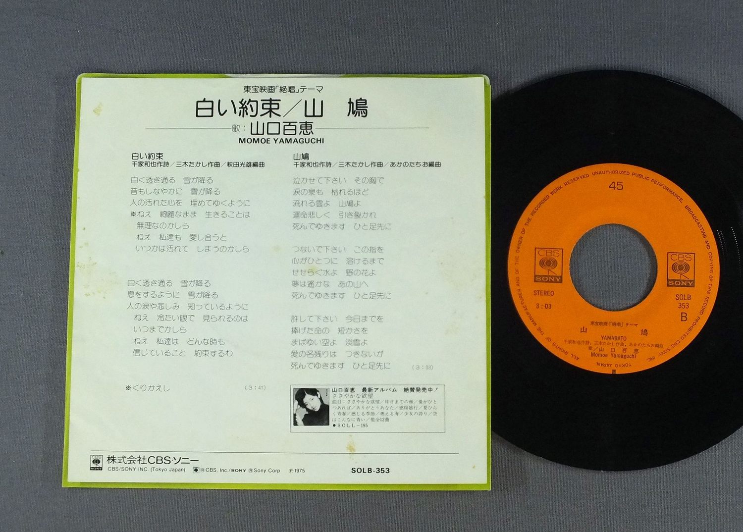 MOMOE YAMAGUCHI山口百恵/SHIROI YAKUSOKU白い約束 SOLB353 製造国:日本盤 / Media:7inch外観:EX-盤の状態:EX 価格(税込):¥550 送料 7inch:定形外郵便 360円~LP:定形外郵便 660円~送料は、注文の最終画面で確認頂けます。 > > MOMOE YAMAGUCHI/SHIROI YAKUSOKU 外観 (EX-)特記事項:裏側にシミ。外観EX-の共通説明:ダメージ軽度~多少。 中古品としては普通の状態。シミ、ヨゴレ、スレなど軽く~多少。 盤の状態 (EX)特記事項:薄いスリキズ・スレ軽くある感じ。軽微なものの様子です。盤EXの共通説明:盤面のスリキズが薄いものが少し~軽度 音に出そうなものは無いように見える(軽微なソフトティック音は除く)。 Tweet それぞれの画像をクリックすると、大きい写真が見られます こちらの商品もお勧めです 1,320円 MIKI ASAKURA麻倉未稀 / SEXY ELEGANCEセクシー・エレガント 770円 SEIKO MATSUDA松田聖子 / CANDYキャンディー 1,320円 PINK LADYピンク・レディー / PINK LADY-SUMMER FIRE `77ピンク・レディー-サマー・ファイア `77 1,210円 USHIRO-YUBI SASAREGUMIうしろゆびさされ組 / 1st LP ( FUWAFURA )ふ・わ・ふ・ら 880円 SEIKO MATSUDA松田聖子 / MORNING SHOWER映画 プルメリアの伝説 880円 SONOKO KAWAI河合その子 / SONOKOその子 770円 NAOKO KAWAI河合奈保子 / NAOKO IN CONCERT河合奈保子 カナリー・コンサート PART 2 990円 SONOKO KAWAI河合その子 / SIESTAシエスタ
