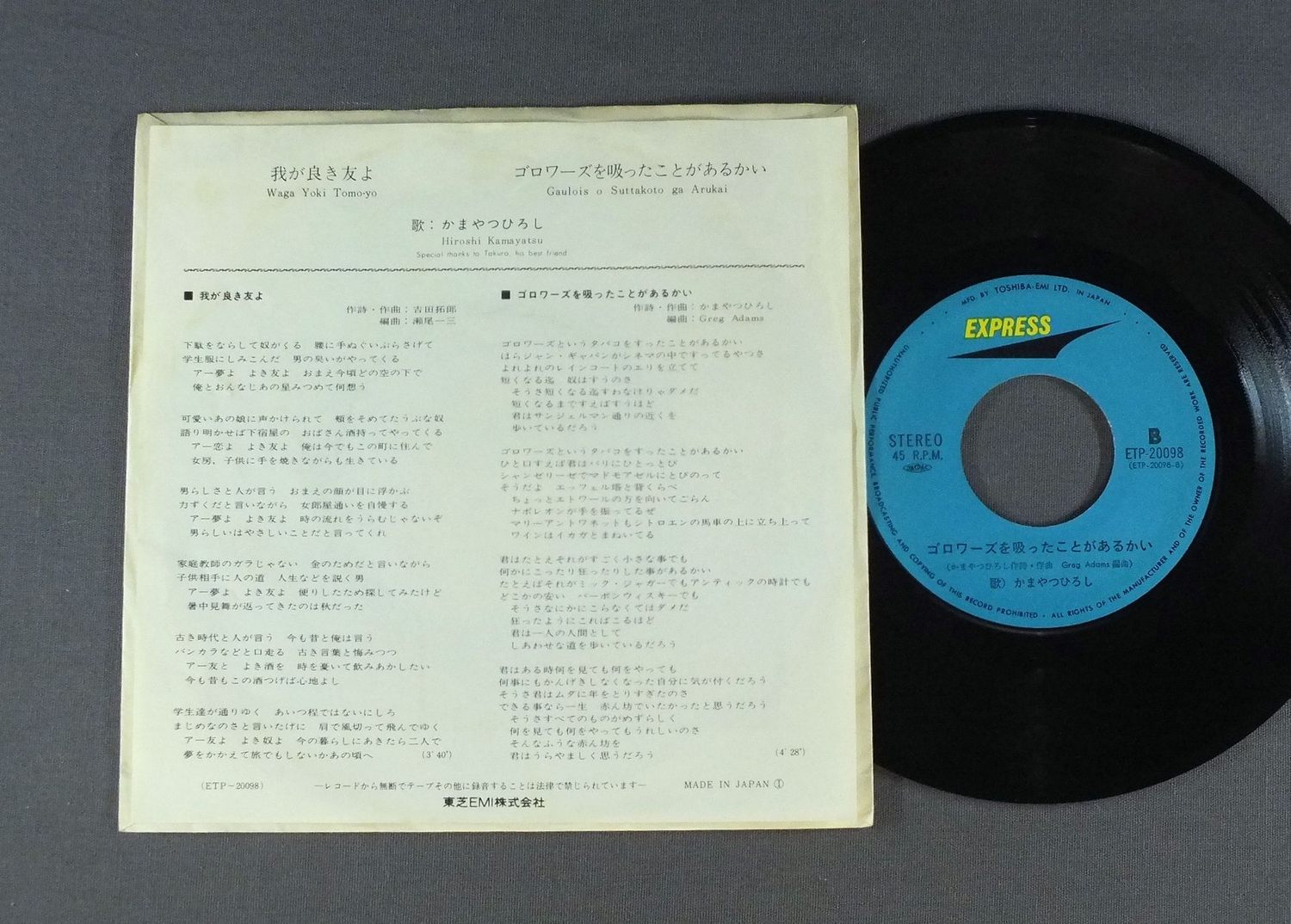 HIROSHI KAMAYATSUかまやつひろし/WAGA YOKI TOMO-YO我が良き友よ ETP20098 製造国:日本盤 / Media:7inch外観:EX-盤の状態:EX 価格(税込):¥660 送料 7inch:定形外郵便 360円~LP:定形外郵便 660円~送料は、注文の最終画面で確認頂けます。 > > HIROSHI KAMAYATSU/WAGA YOKI TOMO-YO 外観 (EX-)特記事項:薄いシミやよごれ有り。外観EX-の共通説明:ダメージ軽度~多少。 中古品としては普通の状態。シミ、ヨゴレ、スレなど軽く~多少。 盤の状態 (EX)特記事項:薄いスリキズ・スレ軽くある感じ。殆どが軽微なものの様子です。盤EXの共通説明:盤面のスリキズが薄いものが少し~軽度 音に出そうなものは無いように見える(軽微なソフトティック音は除く)。 Tweet それぞれの画像をクリックすると、大きい写真が見られます こちらの商品もお勧めです 660円 GO NAGABUCHI長渕 剛 / GYAKURYU逆流 1,320円 DARK DUCKSダーク・ダックス / FOLK ALBUM AUTOGRAPHEDフォーク思考(サイン付) 770円 BOBBY OKAMOTO & THE INDIAN SUMMERボビー岡本&インディアン・サマー / INDIAN SUMMERインディアン・サマー 1,320円 JUN & NENEじゅん&ネネ / WORLD OF JUN & NENE愛するってこわい -じゅん&ネネの世界- 660円 TAKAKO SHIRAI白井貴子 / PASCAL 1,980円 MASAKO OHYA大屋政子 / LIVE CONCERTライブコンサート 770円 KUMIKO YAMASHITA山下久美子 / BABY BABY 662円 KATSUO OHNO大野克夫 / WINDWARD HILLウィンドワード・ヒル