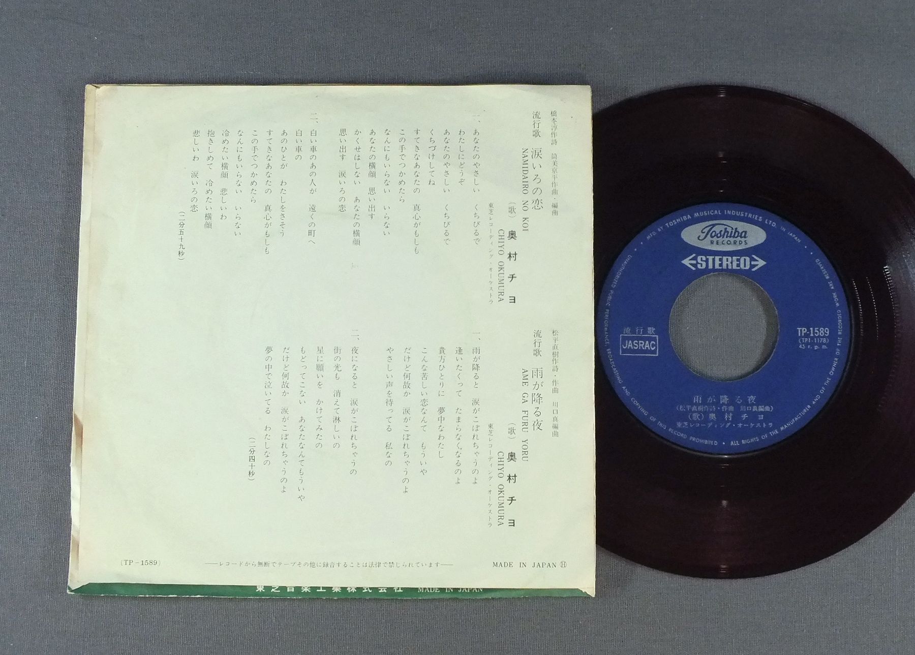 CHIYO OKUMURA奥村チヨ/NAMIDAIRO NO KOI涙いろの恋 TP1589 製造国:日本盤 / Media:7inch外観:EX-盤の状態:VG+ 価格(税込):¥770 送料 7inch:定形外郵便 360円~LP:定形外郵便 660円~送料は、注文の最終画面で確認頂けます。 > > CHIYO OKUMURA/NAMIDAIRO NO KOI 外観 (EX-)特記事項:ヨレ有り。裏側にシミやよごれ。外観EX-の共通説明:ダメージ軽度~多少。 中古品としては普通の状態。シミ、ヨゴレ、スレなど軽く~多少。 盤の状態 (VG+)特記事項:薄いスリキズ・細かいスレ多少。全体的には軽微なものが中心です。少し聴いてみましたが、音自体はしっかりクリアーに鳴っているようでした。盤VG+の共通説明:盤面にスリキズが多少~やや有り、音に出そうなものも多少ある。 その他:赤盤 Tweet それぞれの画像をクリックすると、大きい写真が見られます こちらの商品もお勧めです 440円 KUMIKO YAMASHITA山下久美子 / DAKISHIMETE ONLY YOU抱きしめてオンリィ・ユー 990円 DR. RIVERBEACH & HIS ORCHESTRA / GOOD-BYE SONG BOOK 770円 TULIPチューリップ / TULIP BEST心の旅 660円 EIKICHI YAZAWA矢沢永吉 / A DAYア・デイ 440円 AYUMI NAKAMURA中村あゆみ / FAIR CHILD 440円 MANABU MIYAHARA宮原学 / READY STEADY GO 1,210円 HIROMI OHTA太田裕美 / TEDUKURI NO GASHUU手作りの画集 880円 TWIST世良公則 &ツイスト / ファースト・アルバム