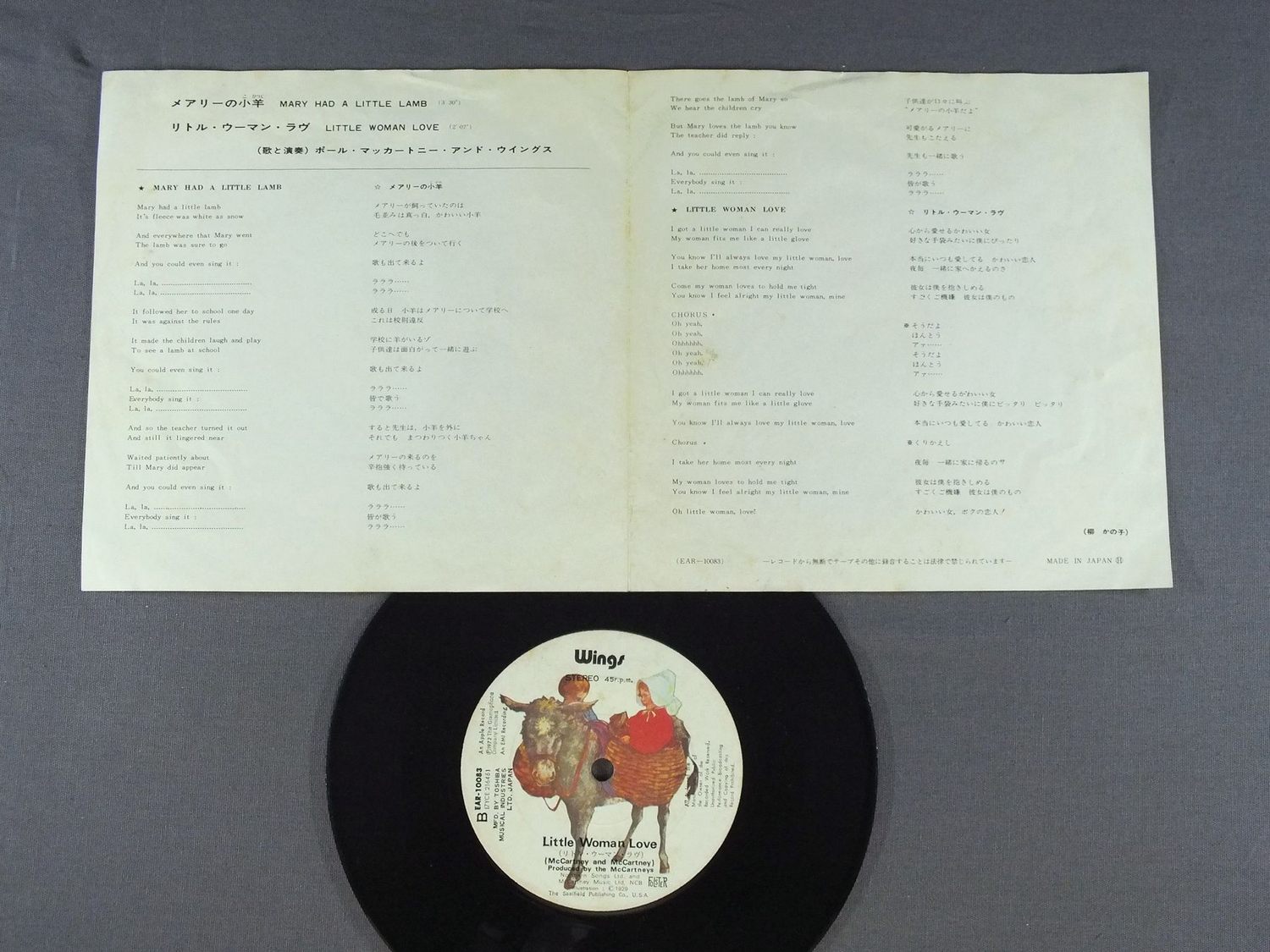 McCARTNEY-WINGSポール・マッカートニー・アンド・ウイングス/MARY HAD A LITTLE LAMBメアリーの子羊 EAR10083 製造国:日本盤 / Media:7inch外観:VG+盤の状態:EX 価格(税込):¥550(売約済) 送料 7inch:定形外郵便 360円~LP:定形外郵便 660円~送料は、注文の最終画面で確認頂けます。 > > McCARTNEY-WINGS/MARY HAD A LITTLE LAMB 外観 (VG+)特記事項:見開きも含めてシミ有。外観VG+の共通説明:ダメージやや有り。シミ、ヨゴレ、スレなど多少~やや多め。 盤の状態 (EX)特記事項:薄いスリキズ・スレ軽くある感じ。軽微なものの様子です。盤EXの共通説明:盤面のスリキズが薄いものが少し~軽度 音に出そうなものは無いように見える(軽微なソフトティック音は除く)。 Tweet それぞれの画像をクリックすると、大きい写真が見られます こちらの商品もお勧めです 880円 PAUL MCCARTNEYポール・マッカートニー / TUG OF WARタッグ・オブ・ウォー 770円 WINGSポール・マッカートニー&ウイングス / VENUS AND MARSヴィーナス・アンド・マース 1,210円 WINGSウイングス / GREATEST HITSグレイテスト・ヒット 770円 PAUL MCCARTNEY & WINGSポール・マッカートニー & ウイングス / WINGS AT THE SPEED OF SOUNDスピード・オヴ・サウンド 1,650円 WINGSウィングス / OVER AMERICAUSAライブ 1,210円 WINGSウィングス / WINGS OVER AMERICAウィングスU.S.A ライヴ 990円 WINGS / VENUS AND MARS 1,980円 GEORGE HARRISONジョージ・ハリスン / LIVING IN THE MATERIAL WORLDリヴィング・イン・ザ・マテリアル・ワールド