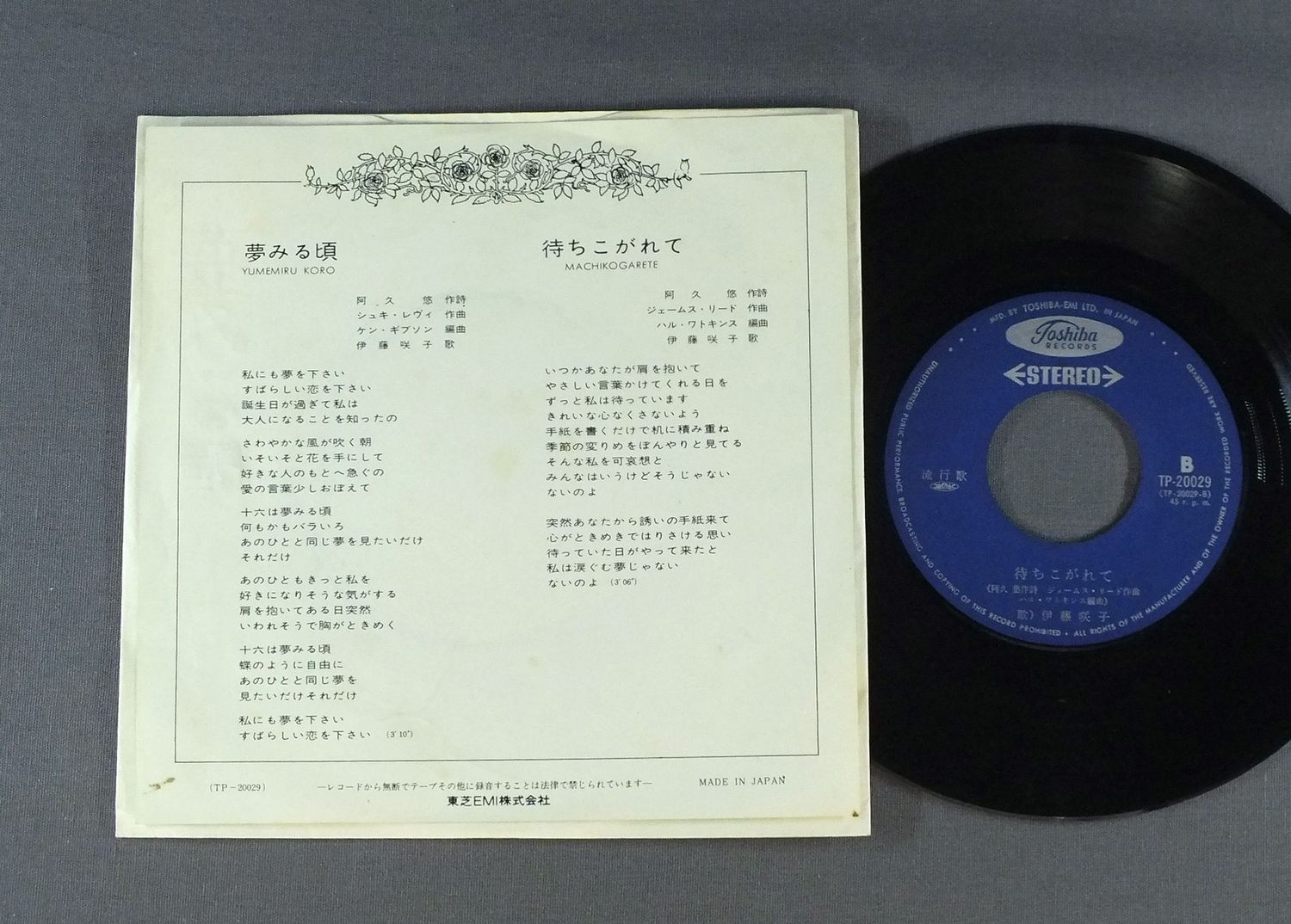SAKIKO ITOH伊藤咲子/YUMEMIRU KORO夢みる頃 TP20029 製造国:日本盤 / Media:7inch外観:EX盤の状態:EX 価格(税込):¥660 送料 7inch:定形外郵便 360円~LP:定形外郵便 660円~送料は、注文の最終画面で確認頂けます。 レコード検索 > JAZZ > SAKIKO ITOH/YUMEMIRU KORO 外観 (EX)特記事項:裏側にシミ外観EXの共通説明:ダメージが限定的。中古品としては保存状態がよい方。シミ、ヨゴレ、スレ 少し~軽度。 盤の状態 (EX)特記事項:薄いスリキズ・スレ軽くある感じ。殆どが軽微なものの様子です。盤EXの共通説明:盤面のスリキズが薄いものが少し~軽度 音に出そうなものは無いように見える(軽微なソフトティック音は除く)。 Tweet それぞれの画像をクリックすると、大きい写真が見られます こちらの商品もお勧めです 660円 GARO / GARO 4 1,210円 SHOGO HAMADA浜田省吾 / GATE OF THE PROMISED LANDプロミスト・ランド -約束の地 880円 NUMBER ONE BANDナンバーワン・バンド / TOKYO ATARI東京あたり 660円 I.GEORGEアイ・ジョージ / JONETSU NO UTAGOE情熱の歌声 880円 YASUHIRO ABE安部恭弘 / FRAME OF MINDフレーム・オブ・マインド 880円 ALFEEアルフィー / RENAISSANCEルネッサンス 770円 KENJI SAWADA沢田研二 / OMOIKKIRI KIZANA JINSEI思いきり気障な人生 770円 AYUMI NAKAMURA中村 あゆみ / BOY