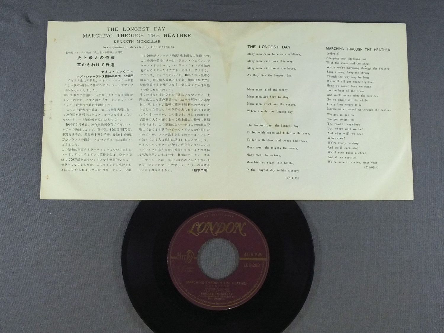 KENNETH MCKELLARケネス・マッケラー/LONGEST DAY 史上最大の作戦 主題歌 LED288 製造国:日本盤 / Media:7inch外観:VG+盤の状態:EX- 価格(税込):¥1,100 送料 7inch:定形外郵便 360円~LP:定形外郵便 660円~送料は、注文の最終画面で確認頂けます。 > > KENNETH MCKELLAR/LONGEST DAY 外観 (VG+)特記事項:シミ有外観VG+の共通説明:ダメージやや有り。シミ、ヨゴレ、スレなど多少~やや多め。 盤の状態 (EX-)特記事項:薄いスリキズ・細かい表面スレ多少ある感じ。殆どが軽微なものの様子です。盤EX-の共通説明:盤面のスリキズが多少有り。音に出そうなものは殆ど無いように見える~さほど気にならないぐらいの軽いプチ数カ所程度。 Tweet それぞれの画像をクリックすると、大きい写真が見られます こちらの商品もお勧めです 990円 OLIVIA NEWTON-JOHN etcオリビア・ニュートンジョン他 / TWO OF A KINDサントラ・セカンド・チャンス 1,650円 MOMOE YAMAGUCHI & TOMOKAZU MIURA山口百恵と三浦友和 / WHITE LOVEホワイト・ラブ 550円 BURT BACHARACHバート・バカラック / SOUNDTRACK ARTHUR映画 ミスター・アーサー 770円 JOHN BARRYジョン・バリー / COTTON CLUB映画 コットンクラブ 1,320円 HENRY MANCINIヘンリー・マンシーニ / SOUND TRACK CHARADEヘップバーン映画シャレード 550円 YUJIRO ISHIHARA石原裕次郎 / SOUND TRACK FROM NIKKATSU FILM想い出のスクリーン(日活映画サウンドトラックより) 770円 ORIGINAL SOUND TRACKオリジナル・サウンドトラック / SUPERMAN 2映画 スーパーマン2 冒険編 1,320円 JERRY GOLDSMITHジェリー・ゴールドスミス / STAR TREK THE MOTION PICTUREスター・トレック
