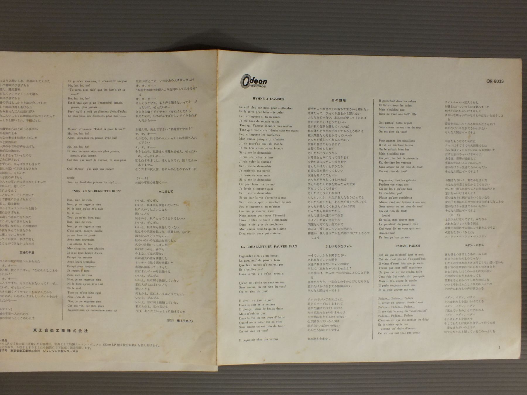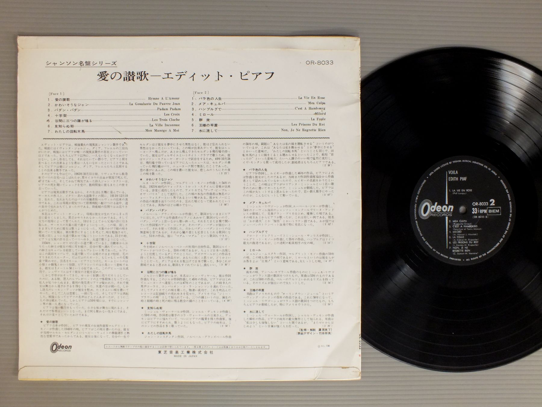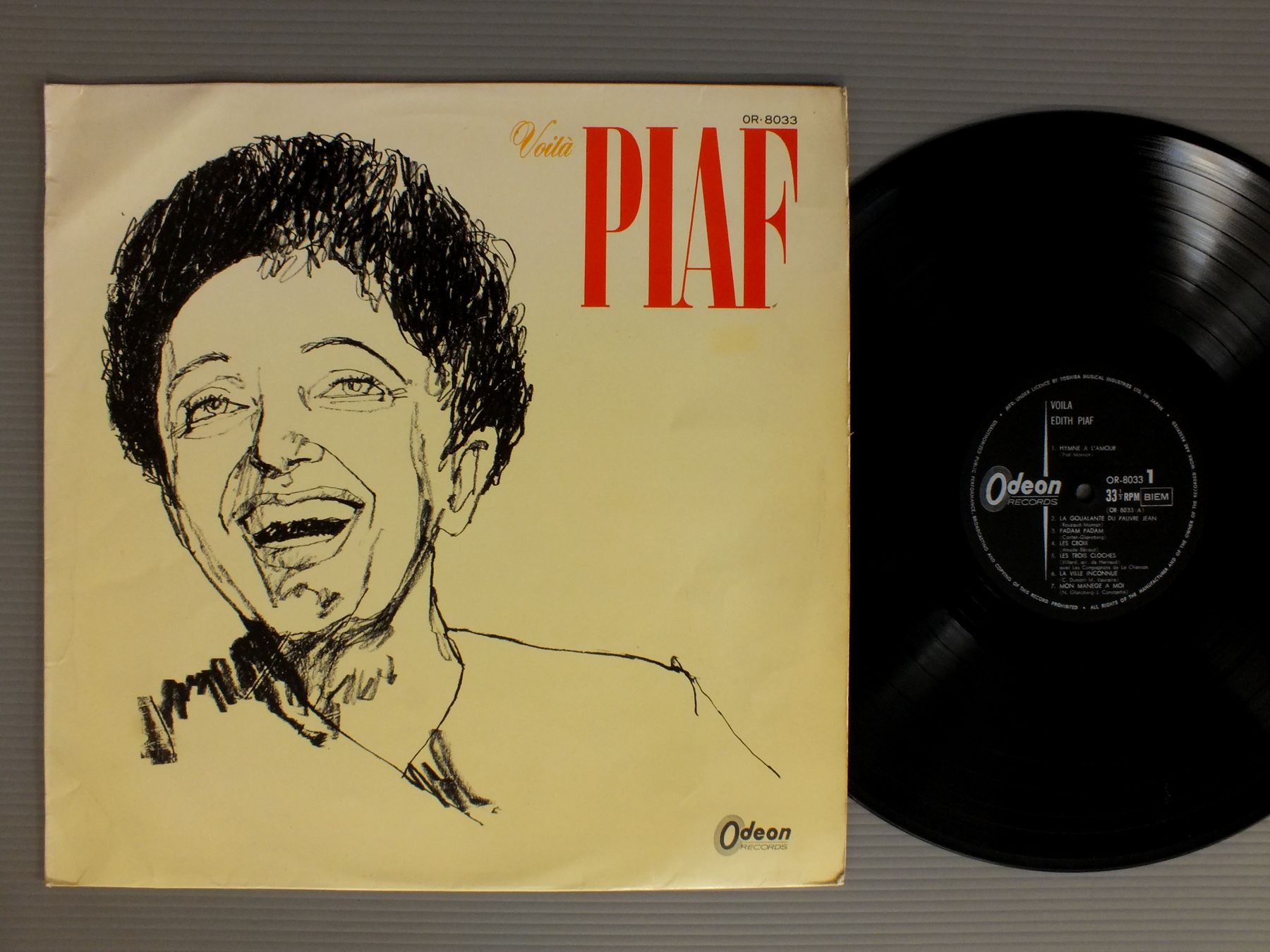 EDITH PIAFエディット・ピアフ/VOILA EDITH PIAF愛の讃歌-エディット・ピアフ OR8033 製造国:日本盤 / Media:LP外観:EX-盤の状態:EX- 価格(税込):¥770(売約済) 送料 7inch:定形外郵便 360円~LP:定形外郵便 660円~送料は、注文の最終画面で確認頂けます。 > > EDITH PIAF/VOILA EDITH PIAF 外観 (EX-)特記事項:ヨレ有り。外観EX-の共通説明:ダメージ軽度~多少。 中古品としては普通の状態。シミ、ヨゴレ、スレなど軽く~多少。 盤の状態 (EX-)特記事項:薄いスリキズ・細かい表面スレ軽くある感じ。全体的には殆どが軽微なものの様子です。盤EX-の共通説明:盤面のスリキズが多少有り。音に出そうなものは殆ど無いように見える~さほど気にならないぐらいの軽いプチ数カ所程度。 その他:ペラジャケ Tweet それぞれの画像をクリックすると、大きい写真が見られます こちらの商品もお勧めです 1,320円 LOUIE BELLSONルイ・ベルソン / LOUIE BELLSON`S 7ルイ・ベルソン 7 770円 SINGERS UNLIMITEDシンガーズ・アンリミテッド / CAPELLAア・カペラ 770円 KAI WINDING & J.J.JOHNSONケイ・ウィンディング5重奏団 + J.J.ジョンソン / AFTERNOON AT BIRDLANDバードランドのJ & K 1,320円 GATO BARBIERIガトー・バルビエリ / UNDER FIREアンダー・ファイア 880円 HERBIE MANNハービー・マン / EVOLUTION OF MANNハービー・マン・ストーリー 1,210円 WILLIE SMITH - JESS STACY - JOE SULLIVANジェス・ステイシー - ウィリイ・スミス - ジョー・サリバン / CHAIRMEN OF THE BOARD VOL2ピアノ・ジャズの競演 第2集 1,320円 KENJI OHMURA - KATSUMI WATANABE etc大村憲司 - 渡辺香津美他 / ARANJUEZアランフェス協奏曲 1,210円 DEREK SMITHディレク・スミス / NEW SOILニュー・ソワール