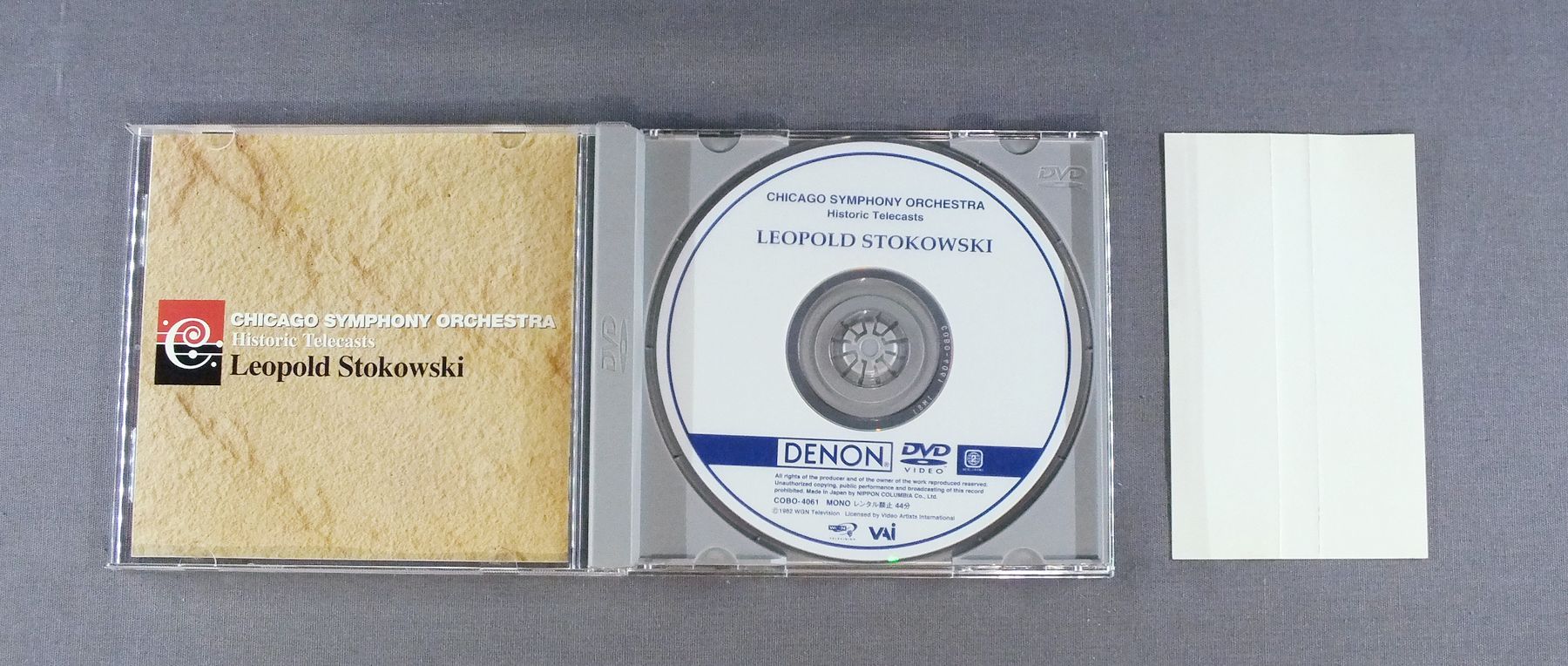 LEOPOLD STOKOWSKIレオポルド・ストコフスキー/CHICAGO SYM. ORCH.-HISTORIC TELECASTS VOL3シカゴ交響楽団と巨匠たち VOL3 COBO4061 製造国:日本盤 / Media:DVD外観:EX盤の状態:EX+帯:EX 価格(税込):¥3,850 送料 7inch:定形外郵便 360円~LP:定形外郵便 660円~送料は、注文の最終画面で確認頂けます。 レコード検索 > J-POP > LEOPOLD STOKOWSKI/CHICAGO SYM. ORCH.-HISTORIC TELECASTS VOL3 外観 (EX)特記事項:特記事項無し。コンディションリストを参照下さい。外観EXの共通説明:ダメージが限定的。中古品としては保存状態がよい方。シミ、ヨゴレ、スレ 少し~軽度。 盤の状態 (EX+)特記事項:薄いスリキズ・スレ少し。一見してきれいな状態です。盤EX+の共通説明:盤面の極薄いスリキズ、スレ少し程度 音に出そうなものは無いように見える(極軽微なソフトティック音は除く)。 帯の状態 (EX):特記事項無し。コンディションリストを参照下さい。 Tweet それぞれの画像をクリックすると、大きい写真が見られます こちらの商品もお勧めです 2,090円 DIESKAU - SAWALLISCHディースカウ - サヴァリッシュ / R.STRAUSS - LIEDER 3LP BOXR.シュトラウス - 歌曲集 3枚組 1,540円 DOMINGO ドミンゴ / VERDI ARIASヴィルディ オペラアリア集 990円 ENRICO CARUSOエンリコ・カルーソ / ENRICO CARUSO VOL.2 990円 YELENA OBRAZTSOVA - KHAIKIN - BOLISHOI THEATRE ORCH.エレーナ・オブラスツォワ - ハイキン - ボリショイ歌劇場管弦楽団 / OPERA ARIASオペラ・アリア集 990円 JANET BAKER - BARBIROLLI - NEW PHILHARMONIA ORCHESTRAジャネット・ベイカー - バルビローリ - ニュウ・フィルハーモニア / RAVEL - SHEHERAZADEラヴェル - シェヘラザード 1,540円 KARAJAN - WIENER SINGVEREIN - VERLINER PHILHARMONIKERカラヤン - ウィーン楽友協会合唱団 - ベルリンフィル / BACH - MATTEHAUS PASSIONバッハ - マタイ受難曲 1,540円 PETER SCHREIER (TENOR) - WALTER OLBERTZ (PIANO) / SCHUBERT - SWAN SONGシューベルト - 白鳥の歌 990円 MARIA CALLASマリア・カラス / BIZET - CARMEN HIGHLIGHTSビゼー - 歌劇カルメン ハイライト
