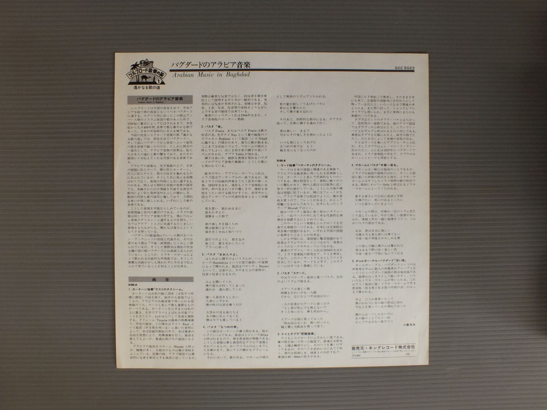 ARABIAN MUSIC IN BACHDADシルクロード音楽の旅/SALAH ABDUL GHAFOUR SAAD ALLA etcバグダードのアラビア音楽 GXC5023 製造国:日本盤 / Media:LP外観:EX盤の状態:EX- 価格(税込):¥550(売約済) 送料 7inch:定形外郵便 360円~LP:定形外郵便 660円~送料は、注文の最終画面で確認頂けます。 > > ARABIAN MUSIC IN BACHDAD/SALAH ABDUL GHAFOUR SAAD ALLA etc 外観 (EX)特記事項:特記なし。外観EXの共通説明:ダメージが限定的。中古品としては保存状態がよい方。シミ、ヨゴレ、スレ 少し~軽度。 盤の状態 (EX-)特記事項:薄いスリキズ・細かい表面スレ軽くある感じ。全体的には殆どが軽微なものの様子です。盤EX-の共通説明:盤面のスリキズが多少有り。音に出そうなものは殆ど無いように見える~さほど気にならないぐらいの軽いプチ数カ所程度。 Tweet それぞれの画像をクリックすると、大きい写真が見られます こちらの商品もお勧めです 770円 OSIPOV STATE RUSSIAN FOLK ORCH. etcオシポフ国立民族オーケストラ 他 / RUSSIAロシア - 大草原にこだまするバラライカのしらべ(フィリップス民俗音楽世界地図7) 770円 ENSEMBLE CIPRIAN PORUMBESCU etcチブリアン・ポルムベスク楽団他 / RUMANIAルーマニア - 笛と民謡と踊り(フィリップス民俗音楽世界地図6) 550円 JOSE VELAZQUEZホセ・ヴェラスケス / JOSE VELAZQUEZ GOLDEN BEST 16ホセ・ヴェラスケス・ゴールデン・ベスト 16 1,320円 MANITAS DE PLATAマニタス・デ・プラタ / MUSIQUE AUX DOIGTS魂のギター 1,320円 BUDAPEST STRING QUARTETブダペスト弦楽四重奏団 / MOZARTO - STRING QUARTETモーツァルト - 弦楽五重奏曲 770円 RECORDED IN YUGOSLAVIA現地録音 / YUGOSLAVIAユーゴスラヴィア - バルカンに響くコロの踊り(フィリップス民俗音楽世界地図5) 770円 PEDRO CHALCOペドロ・チャルコ / PERUペルー - アンデス高原の神秘の笛(フィリップス民俗音楽世界地図10) 770円 DIEGO EL PEROTE-M.DE MARCHENA-A.VARGAS etcディエゴ・エル・ペローテ-メルチョール・デ・マルチェーナ-アントニオ・バルガス 他 / CAFE CHINITAS美しきマラガの詩情