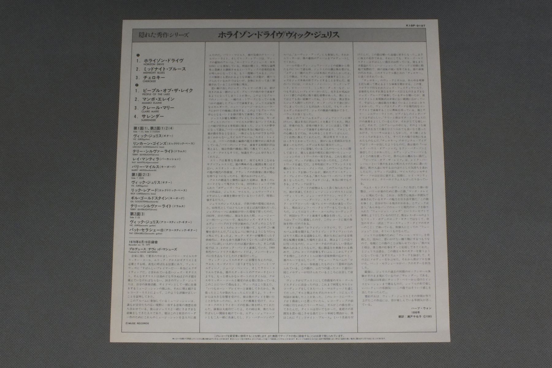 VIC JURISヴィック・ジュリス/HORIZON DRIVEホライゾン・ドライヴ K18P-9197 製造国:日本盤 / Media:LP外観:EX-盤の状態:EX+ 価格(税込):¥770(売約済) 送料 7inch:定形外郵便 360円~LP:定形外郵便 660円~送料は、注文の最終画面で確認頂けます。 > > VIC JURIS/HORIZON DRIVE 外観 (EX-)特記事項:ジャケ表面にシミやよごれ有り。外観EX-の共通説明:ダメージ軽度~多少。 中古品としては普通の状態。シミ、ヨゴレ、スレなど軽く~多少。 盤の状態 (EX+)特記事項:薄いスリキズ・スレ少し。一見してきれいな状態です。盤EX+の共通説明:盤面の極薄いスリキズ、スレ少し程度 音に出そうなものは無いように見える(極軽微なソフトティック音は除く)。 Tweet それぞれの画像をクリックすると、大きい写真が見られます こちらの商品もお勧めです 770円 RONNELL BRIGHTロンネル・ブライト / BRIGHT FLIGHTブライト・フライ 770円 JOHN KLEMMERジョン・クレマー / FINESSEフィネス 440円 GARY BURTON - SONNY ROLLINS - CLARK TERRYG.バートン - S.ロリンズ - C.テリー / 3 IN JAZZスリー・イン・ジャズ 770円 ANDREAS VOLLENWEIDERアンドレアス・フォーレンヴァイダー / WHITE WINDSホワイト・ウィンズ 770円 STANLEY CLARKE / JOURNEY TO LOVE 1,320円 GREAT JAZZ TRIOグレート・ジャズ・トリオ / AT THE VILLAGE VANGUARD VOL2アット・ザ・ヴィレッジ・ヴァンガードVOL2 770円 HAL McKUSICKハル・マジック / JAZZ WORKSHOPジャズ・ワークショップ 1,210円 MAKOTO OZONE小曽根真 / AFTERアフター