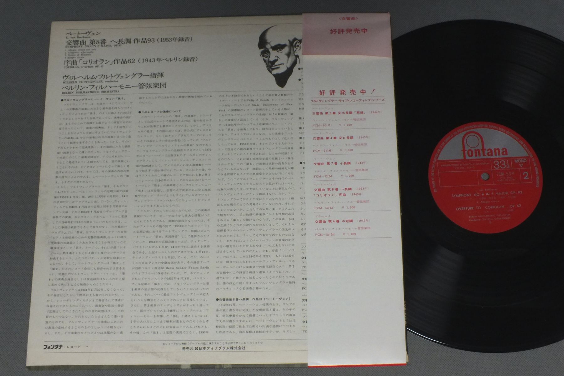 FURTWANGLERフルトヴェングラー/BEETHOVEN SYM. NO8 OP93べートーヴェン 交響曲第8番 FCM-53`M` 製造国:日本盤 / Media:LP外観:EX盤の状態:EX+帯:EX 価格(税込):¥1,584(売約済) 送料 7inch:定形外郵便 360円~LP:定形外郵便 660円~送料は、注文の最終画面で確認頂けます。 > > FURTWANGLER/BEETHOVEN SYM. NO8 OP93 外観 (EX)特記事項:特記なし。外観EXの共通説明:ダメージが限定的。中古品としては保存状態がよい方。シミ、ヨゴレ、スレ 少し~軽度。 盤の状態 (EX+)特記事項:薄いスリキズ・スレ少し。一見してきれいな状態です。盤EX+の共通説明:盤面の極薄いスリキズ、スレ少し程度 音に出そうなものは無いように見える(極軽微なソフトティック音は除く)。 帯の状態 (EX):特記なし。 Tweet それぞれの画像をクリックすると、大きい写真が見られます こちらの商品もお勧めです 990円 WALTERワルター / MOZART SYM.S NOS40 & 41モーツァルト 交響曲第40番&第41番 1,320円 ABBADOアバド / BIZET CARMENビゼー カルメン 抜萃 990円 KURT MASUR - GEWANDHOUSE ORCHESTRA LEIPZIGクルト・マズア - ライプツィヒ・ゲヴァントハウス管弦楽団 / GERSHWIN - PORGY & BESSガーシュイン - ポーギーとベス組曲 1,320円 BOHMベーム / MOZART -SYM. NO39-NO36 LINZモーツァルト-交響曲第39番-第36番 リンツ 990円 KEMPFFケンプ / BEETHOVEN - VARIATIONS FOR PIANOベートーヴェン変奏曲集 990円 ENSEMBLE INSTRUMENTAL DE FRANCEフランス室内合奏団 / BACH - CONCERTO BRANDEBOURGEOIS NO.5バッハ - ブランデンブルグ協奏曲第5番 990円 SZELLセル / MOZART SYM. NO40-SYM. NO39モーツァルト 交響曲第40番・第39番 1,320円 PIERRE MONTEUXピエール・モントゥー / HAYDN-SYM.S NO94 SURPRISE & NO101 CLOCKハイドン-交響曲 第94番 驚愕 & 交響曲 第101番 時計