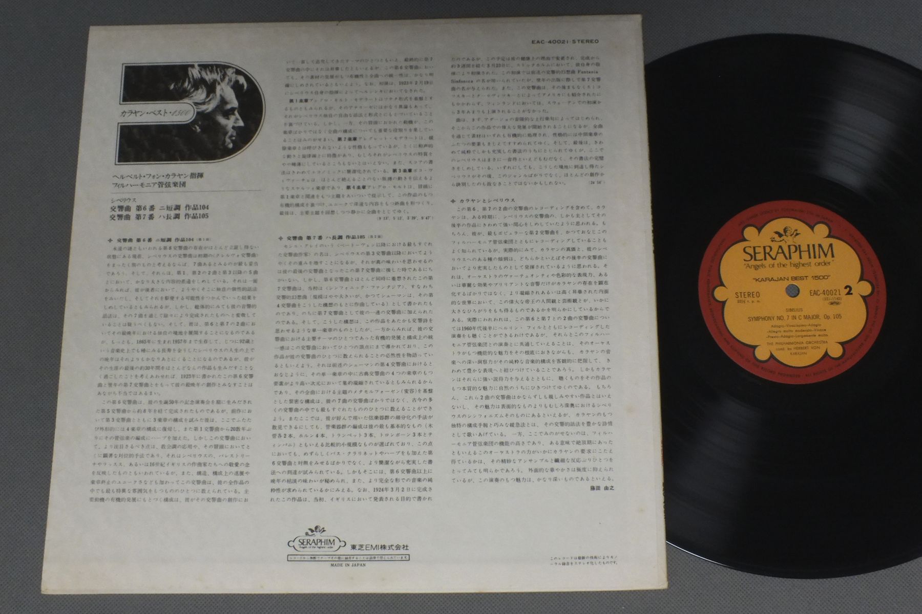 KARAJANカラヤン/SIBELIUS SYM. NO6 OP104 NO7 OP105シベリウス 交響曲第6番 交響曲第7番 EAC-40021 製造国:日本盤 / Media:LP外観:EX盤の状態:EX+ 価格(税込):¥1,386(売約済) 送料 7inch:定形外郵便 360円~LP:定形外郵便 660円~送料は、注文の最終画面で確認頂けます。 > > KARAJAN/SIBELIUS SYM. NO6 OP104 NO7 OP105 外観 (EX)特記事項:ジャケ表面にシミやよごれ有り。外観EXの共通説明:ダメージが限定的。中古品としては保存状態がよい方。シミ、ヨゴレ、スレ 少し~軽度。 盤の状態 (EX+)特記事項:薄いスリキズ・スレ少し。一見してきれいな状態です。盤EX+の共通説明:盤面の極薄いスリキズ、スレ少し程度 音に出そうなものは無いように見える(極軽微なソフトティック音は除く)。 Tweet それぞれの画像をクリックすると、大きい写真が見られます こちらの商品もお勧めです 1,386円 BACKHAUSバックハウス / CHOPIN - PIANO SONATA NO2ショパン - ピアノ奏鳴曲第2番 990円 MONTEUXモントゥー / BERLIOZ-SYM. FANTASTIQUEベルリオーズ-幻想交響曲 990円 WEINGARTNER TOSCANINワインガルトナー アルトゥーロ・トスカニーニ ウィレム・メンゲルベルク ワルター / GREAT CONDUCTORS OF CENTURY栄光の巨匠達1000 -指揮者編- 1,210円 GULINI -CHICAGO SYM.ジュリーニ - シカゴ交響楽団 / MAHLER - SYM. NO9マーラー 交響曲第9番 1,760円 SHIGENORI KUDO工藤重典 / FANTASIE PASTORALE HONGROISEハンガリー田園幻想曲 990円 TOSCANINI - NBC SYMPHONY ORCHトスカニーニ - NBC交響楽団 / TOSCANINI CONDUCTS YOUR FAVORITES VOL1珠玉のアルバム第1集 990円 RUDOLF KEMPEケンペ / BRUCKNER-SYM.ブルックナー-交響曲 第5番 変 990円 KARAJAN - BERLIN PHIL.カラヤン - ベルリン・フィル / BIZET - CARMEN SUITEビゼー - カルメン&アルルの女