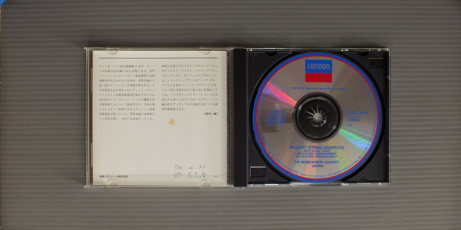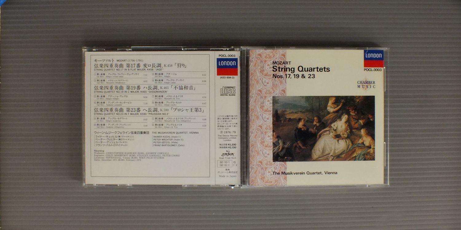 MUSIKVEREIN QUARTET. VIENNAウィーン・ムジークフェライン弦楽四重奏団/MOZART-SQS NOS17-19 & 23モーツァルト- 第17-19-23番 POCL3003 製造国:日本盤 / Media:CD外観:EX-盤の状態:EX+ 価格(税込):¥1,430 送料 7inch:定形外郵便 360円~LP:定形外郵便 660円~送料は、注文の最終画面で確認頂けます。 > > MUSIKVEREIN QUARTET. VIENNA/MOZART-SQS NOS17-19 & 23 外観 (EX-)特記事項:表側カードに書き込みやシミ有り。外観EX-の共通説明:ダメージ軽度~多少。 中古品としては普通の状態。シミ、ヨゴレ、スレなど軽く~多少。 盤の状態 (EX+)特記事項:薄いスリキズ・スレ少し。一見してきれいな状態です。盤EX+の共通説明:盤面の極薄いスリキズ、スレ少し程度 音に出そうなものは無いように見える(極軽微なソフトティック音は除く)。 Tweet それぞれの画像をクリックすると、大きい写真が見られます こちらの商品もお勧めです 1,540円 KARLBEINZ ZOLLER - BERNHARD KLEE - ENGLISH CHEMBER ORCHESTRAカールハインツ・ツェラー - ベルンハルト・クレー - 英国室内管弦楽団 / MOZART - FLOTENKONZERTEモーツアルト - フルート協奏曲 990円 VIENER STREICHQUARTETTウィーン弦楽四重奏 / HAYDN - STRING QUARTET NO.77 `EMPEROR`ハイドン - 弦楽四重奏曲第77番 皇帝 1,540円 ESCHENBACH - JUSTUS FRANTZエッシェンバッハ&フランツ / MOZART - KLAVIERMUSIK ZU VIER HANDENモーツアルト・デュオ 第2集 1,540円 IRWIN GAGE - THOMAS RIEBLアーウィン・ゲージ - トーマス・リープル / BRAHMS - BRIGITTE FASSBAENDERブラームス - ブリギッテ・ファスベンダー 990円 BARENBOIM - ENGLISH CHAMBER ORCHESTRAバレンボエム - イギリス室内管弦楽団 / SCHONBERG - VERKLARTE NACHETシェーンベルク - 浄夜 990円 BORODIN QUARTETボロディン弦楽四重奏団 / BORODIN - STRING QUARTET NO.2ボロディン - 弦楽四重奏曲第2番 1,540円 OTTO BUCHNER - EDGAR SHANN - RICHITER - MUNCHENER BACH ORKESTオットー・ブフナー - エドガー・シャン - カール・リヒター - ミュンヘン・バッハ管弦楽団 / BACH - DUBBELCONCERT VOOR VIOOL EN HOBOバッハ - ヴァイオリンとオーボのための二重協奏曲 990円 I MUSIEIイ・ムジチ合奏団 / MOZART - DIVERTOMENTO モーツァルト - ディヴェルティメント