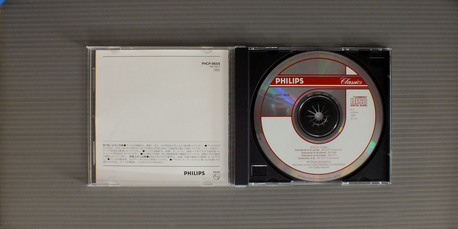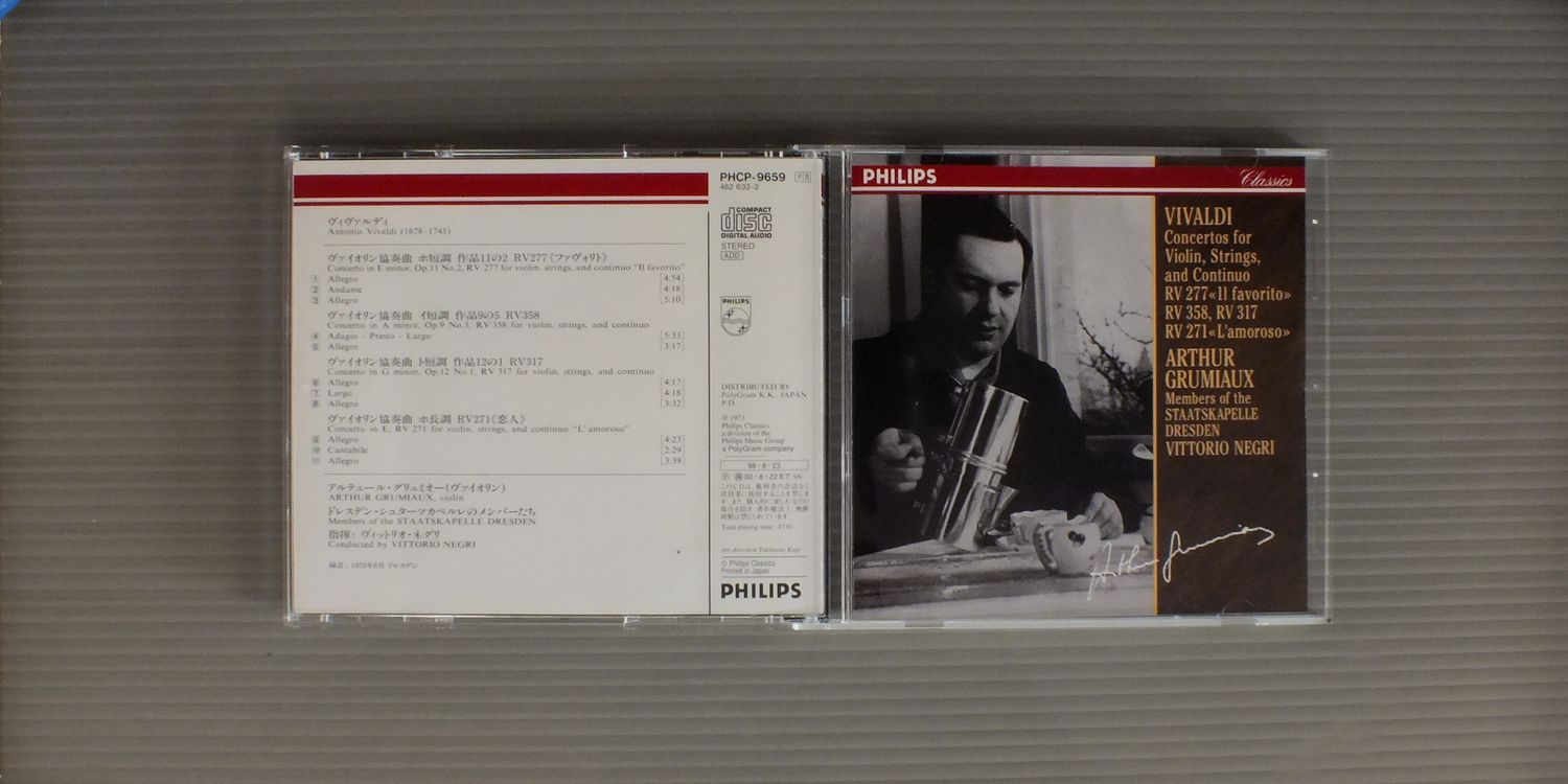 GRUMIAUXグリュミオー/VIVALDI-VIOLIN CONC. RV277-358-317 & 271ヴィヴァルディ-ヴァイオリン協奏曲 ファヴォリト-恋人 他 PHCP9659 製造国:日本盤 / Media:CD外観:EX盤の状態:EX+ 価格(税込):¥990 送料 7inch:定形外郵便 360円~LP:定形外郵便 660円~送料は、注文の最終画面で確認頂けます。 > > GRUMIAUX/VIVALDI-VIOLIN CONC. RV277-358-317 & 271 外観 (EX)特記事項:表側カードに書き込み。外観EXの共通説明:ダメージが限定的。中古品としては保存状態がよい方。シミ、ヨゴレ、スレ 少し~軽度。 盤の状態 (EX+)特記事項:薄いスリキズ・スレ少し。一見してきれいな状態です。盤EX+の共通説明:盤面の極薄いスリキズ、スレ少し程度 音に出そうなものは無いように見える(極軽微なソフトティック音は除く)。 Tweet それぞれの画像をクリックすると、大きい写真が見られます こちらの商品もお勧めです 990円 BARENBOIM - ENGLISH CHAMBER ORCHESTRAバレンボエム - イギリス室内管弦楽団 / SCHONBERG - VERKLARTE NACHETシェーンベルク - 浄夜 1,540円 IRWIN GAGE - THOMAS RIEBLアーウィン・ゲージ - トーマス・リープル / BRAHMS - BRIGITTE FASSBAENDERブラームス - ブリギッテ・ファスベンダー 1,540円 BAUMGAETNER - FESTIVAL STRINGS LUCERNEバウムガルトナー - ルツェルン音楽祭弦楽合奏団他 / VIVARDI - CONCERTO FOR 2 VIOLINヴィヴァルディ - 2つのヴァイオリンのための協奏曲他 2,420円 AMADEUS QUARTETアマデウス四重奏団 / HAYDN - KAISERQUARTETTハイドン弦楽四重奏曲第77番 990円 VIENER STREICHQUARTETTウィーン弦楽四重奏 / HAYDN - STRING QUARTET NO.77 `EMPEROR`ハイドン - 弦楽四重奏曲第77番 皇帝 1,540円 ESCHENBACH - JUSTUS FRANTZエッシェンバッハ&フランツ / MOZART - KLAVIERMUSIK ZU VIER HANDENモーツアルト・デュオ 第2集 990円 BORODIN QUARTETボロディン弦楽四重奏団 / BORODIN - STRING QUARTET NO.2ボロディン - 弦楽四重奏曲第2番 1,540円 HELMUTH RILLING - BACH ENSEMBLEヘルムート・リリング - バッハ・アンサンブル / BACH KANTATE BWV61 & 110バッハ - カンタータ BWV61 & 110