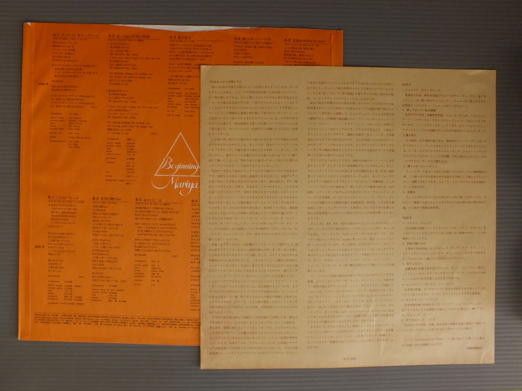 TAKEUCHI MARIYA竹内まりや/BEGINNINGビギニング RVL8036 製造国:日本盤 / Media:LP外観:EX盤の状態:EX 価格(税込):¥1,155(売約済) 送料 7inch:定形外郵便 360円~LP:定形外郵便 660円~送料は、注文の最終画面で確認頂けます。 > > TAKEUCHI MARIYA/BEGINNING 外観 (EX)特記事項:特記なし。外観EXの共通説明:ダメージが限定的。中古品としては保存状態がよい方。シミ、ヨゴレ、スレ 少し~軽度。 盤の状態 (EX)特記事項:薄いスリキズ・スレ軽くある感じ。軽微なものの様子です。盤EXの共通説明:盤面のスリキズが薄いものが少し~軽度 音に出そうなものは無いように見える(軽微なソフトティック音は除く)。 Tweet それぞれの画像をクリックすると、大きい写真が見られます こちらの商品もお勧めです 770円 VARIOUS JAPANESE POPSキング・レコード邦楽 / NOW HIT NOW ( NOW - サルビアの花)ナウ・ヒット・ナウ ( NOW - サルビアの花 収録) 1,320円 EIKO SHURI朱里エイコ / ON STAGE 2LP BOXオン・ステージ 2枚組 880円 SQUAREスクエア / ROCKOONロックーン 880円 MIDORI KINOUCHI木之内みどり / ORIGINAL BEST COLLECTIONオリジナル・ベスト・コレクション 990円 EIKICHI YAZAWA矢沢永吉 / SUPER LIVE BUDOKANスーパー・ライブ日本武道館 770円 YOSUI INOUE井上陽水 / 9.5CARATS9.5カラット 1,650円 YOSHIKO SAGA嵯峨美子 / ANATANIあなたに 770円 TAKURO YOSHIDA吉田拓郎 / ONLY YOU-SINCE COMING FOR LIFEオンリー・ユー